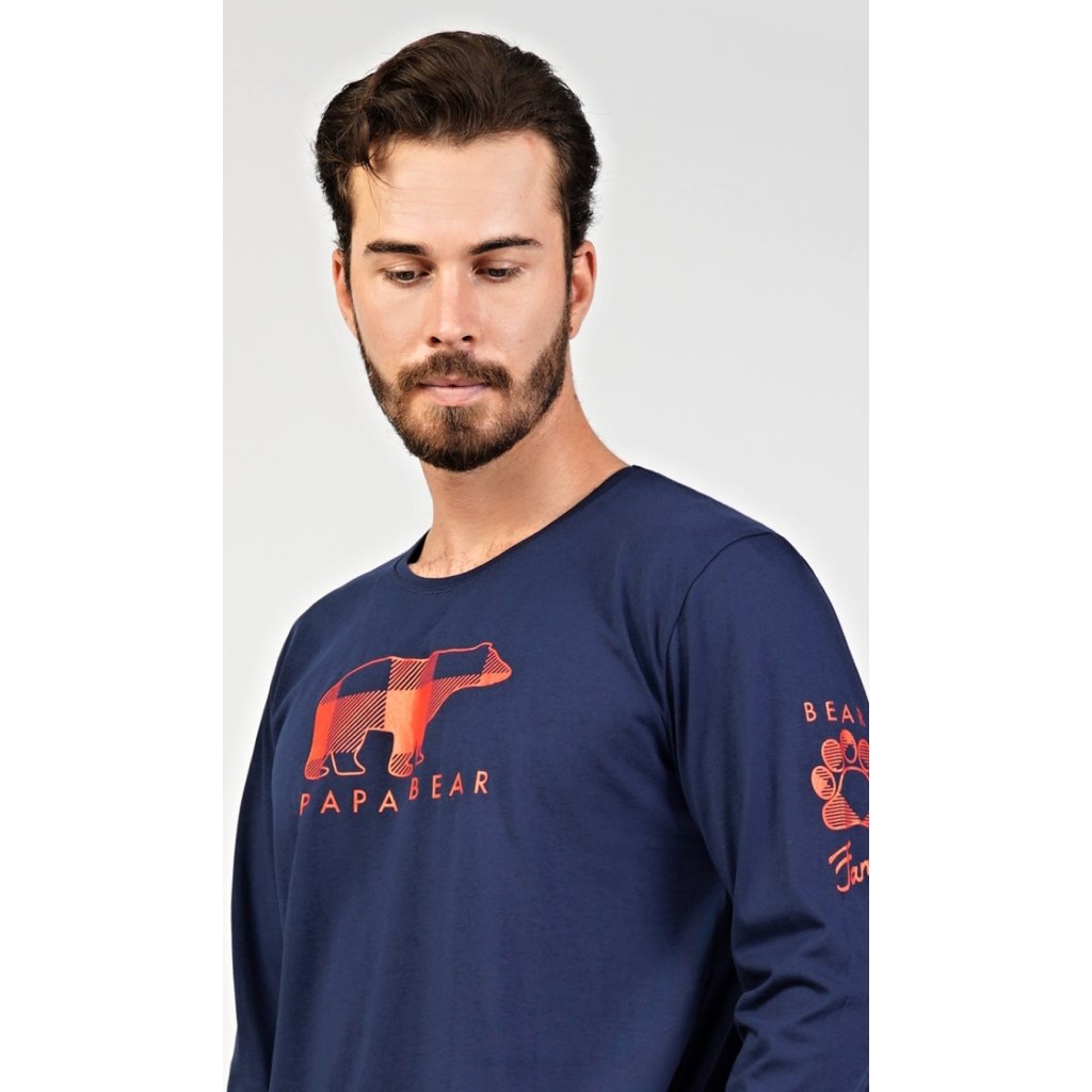 Pánské pyžamo dlouhé Papa bear. Pánské pyžamo se skládá z trika s dlouhým rukávem a dlouhých kalhot. Triko je jednobarevné s konturou medvěda a nápisem Papa bear. Kalhoty jsou světle šedé s celopotiskem medvědů a sobů. Kalhoty jsou do gumy a na stažení šňůrkou v pase. Oceníte i praktické kapsy. Použitý materiál je poddajný a příjemný na dotek.