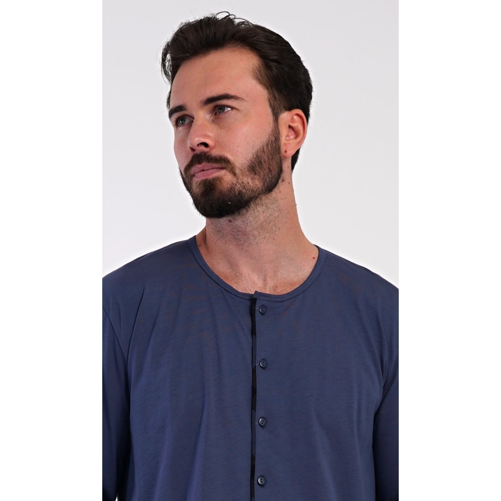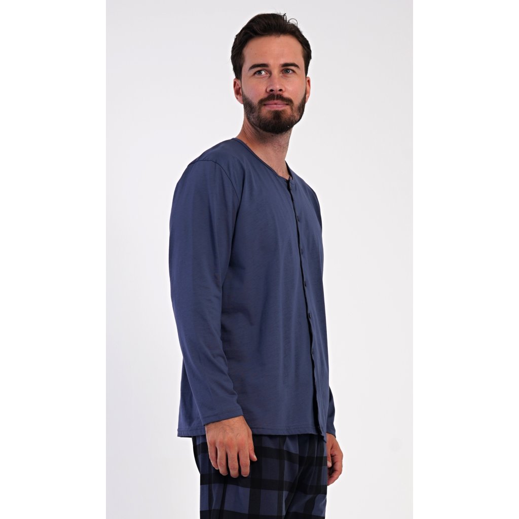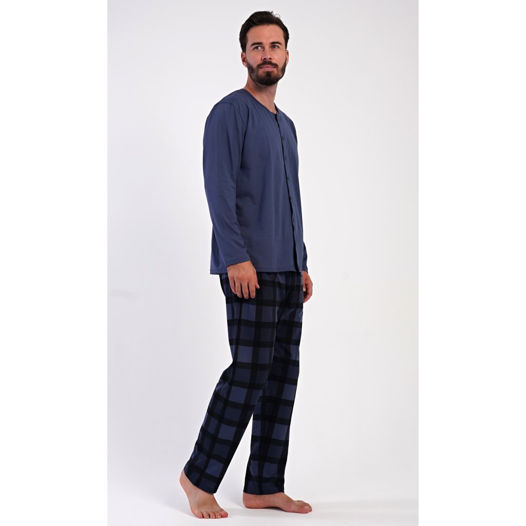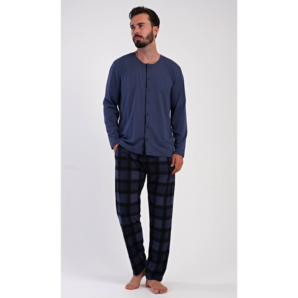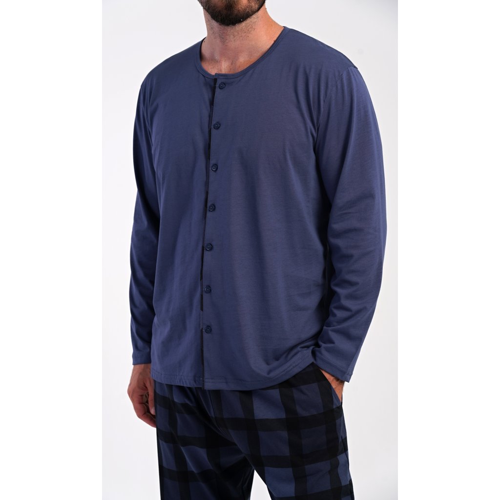 Pánské dlouhé bavlněné pyžamo Rudolf. Pánské pyžamo se skládá z trika s dlouhým rukávem a dlouhých kalhot. Triko s kulatým výstřihem má zapínání na knoflíky. Kárované kalhoty mají v pase gumu, šňůrku na stažení a praktické kapsy. Použitý materiál s obsahem bavlny 100% je poddajný a příjemný na dotek.