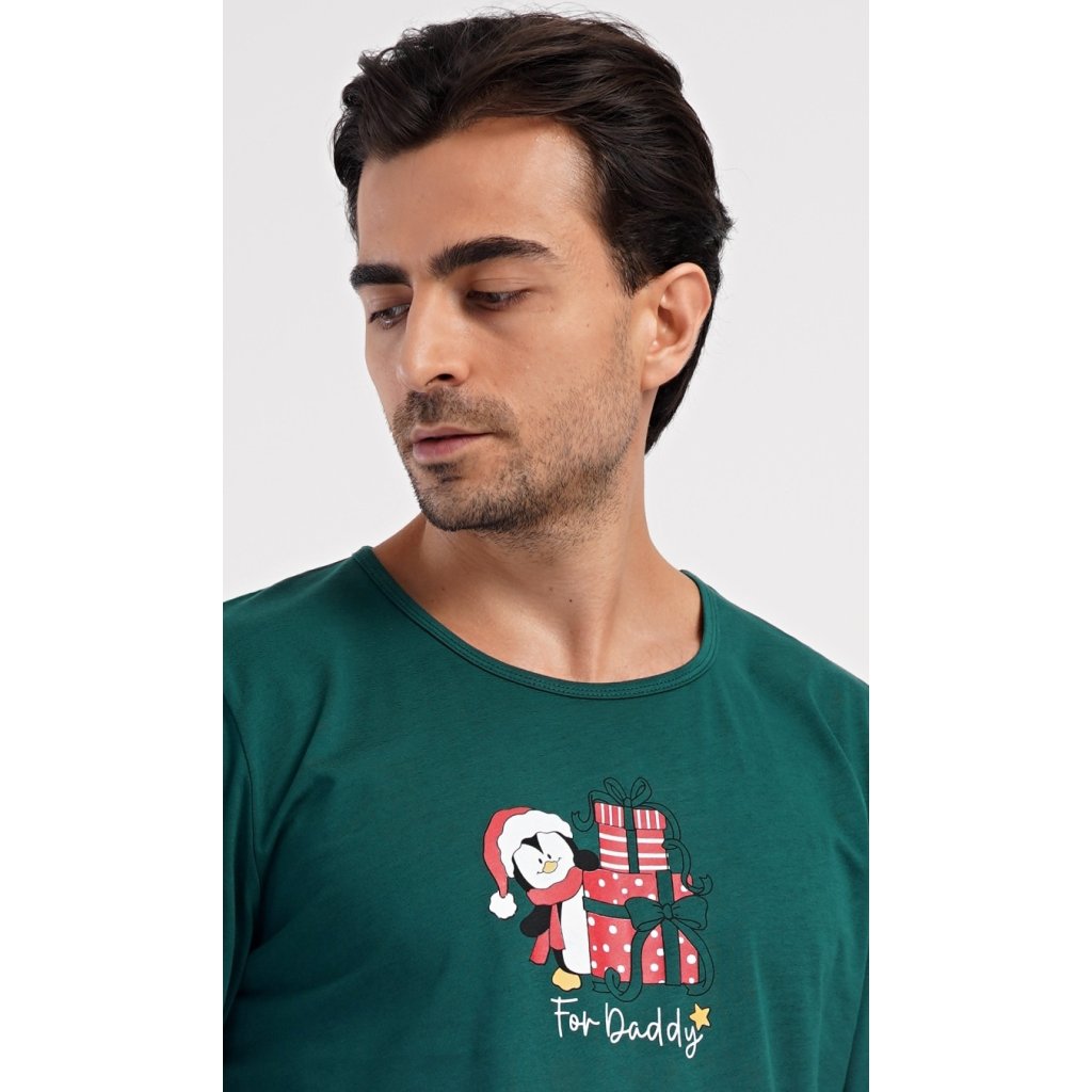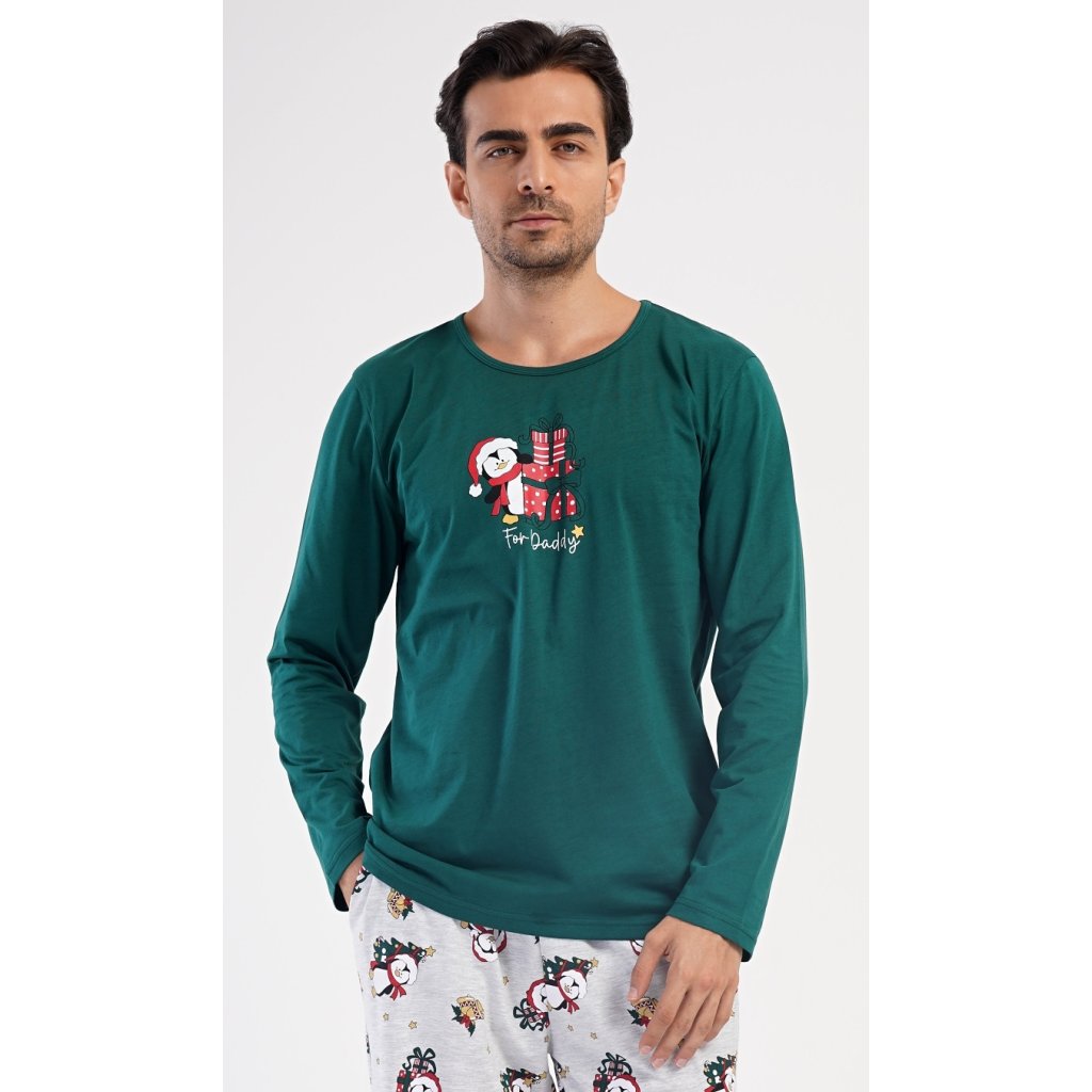 Pánské bavlněné pyžamo dlouhé Tučňák s dárkem. Pánské pyžamo se skládá z trika s dlouhým rukávem a dlouhých kalhot. Jednobarevné triko zdobí obrázek tučňáka s dárky. Na kalhotách se tento motiv opakuje také. Kalhoty mají v pase gumu, šňůrku na stažení a praktické kapsy. Použitý materiál je příjemný a poddajný na dotek. Podíl bavlny u trika je 100% a u kalhot 70%.