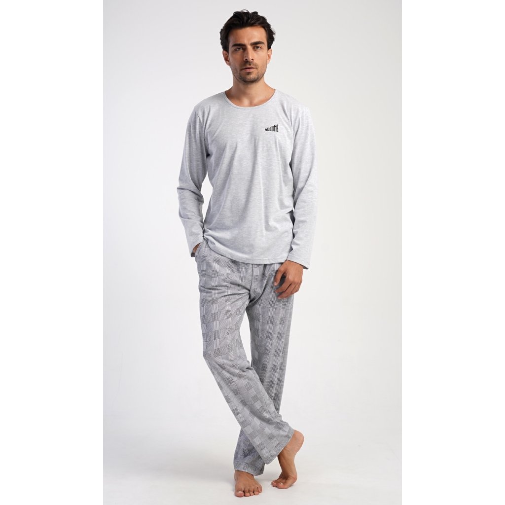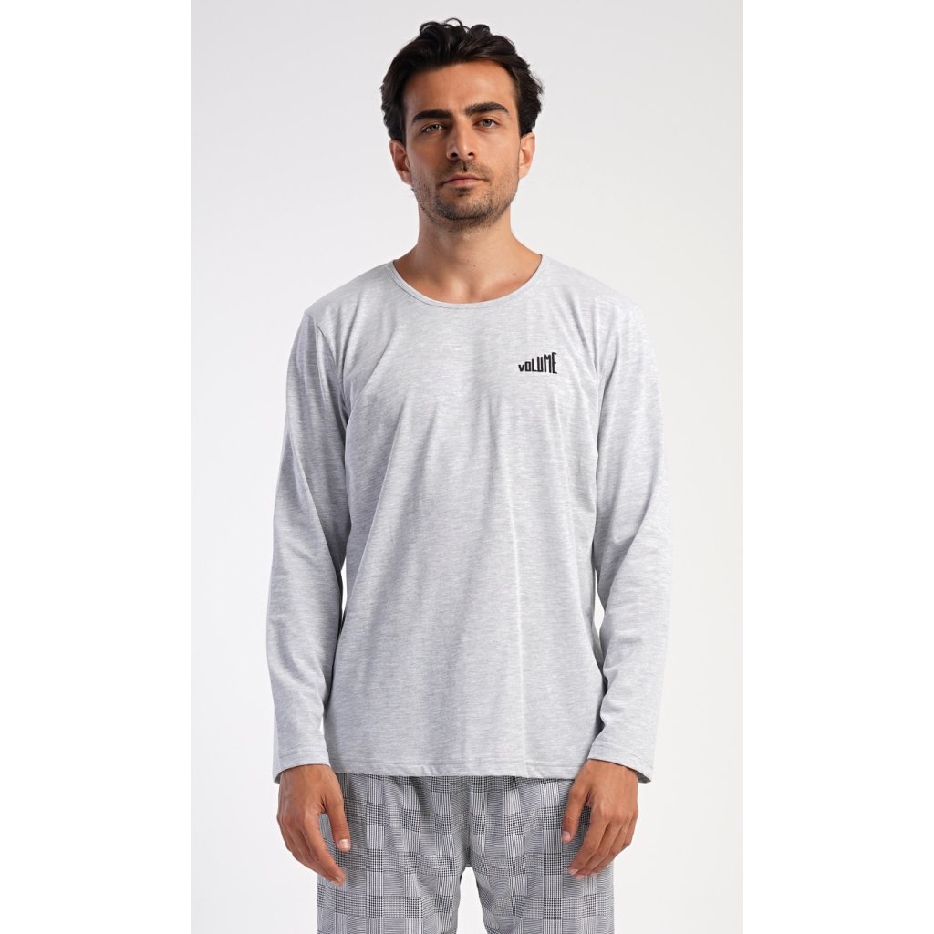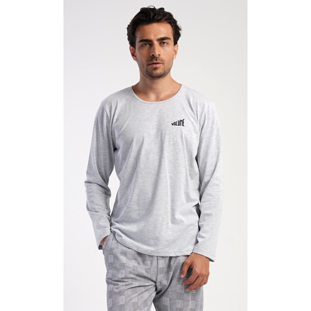 Pánské dlouhé bavlněné pyžamo Volume. Pánské pyžamo se skládá z trika s dlouhým rukávem a dlouhých kalhot. Triko je jednobarevné, zdobené na hrudi drobným nápisem 'Volume'. Kostkované kalhoty mají v pase gumu, šňůrku na stažení a praktické kapsy. Použitý materiál je poddajný a příjemný na dotek. Obsah bavlny u trika je 70% a u kalhot 100%.