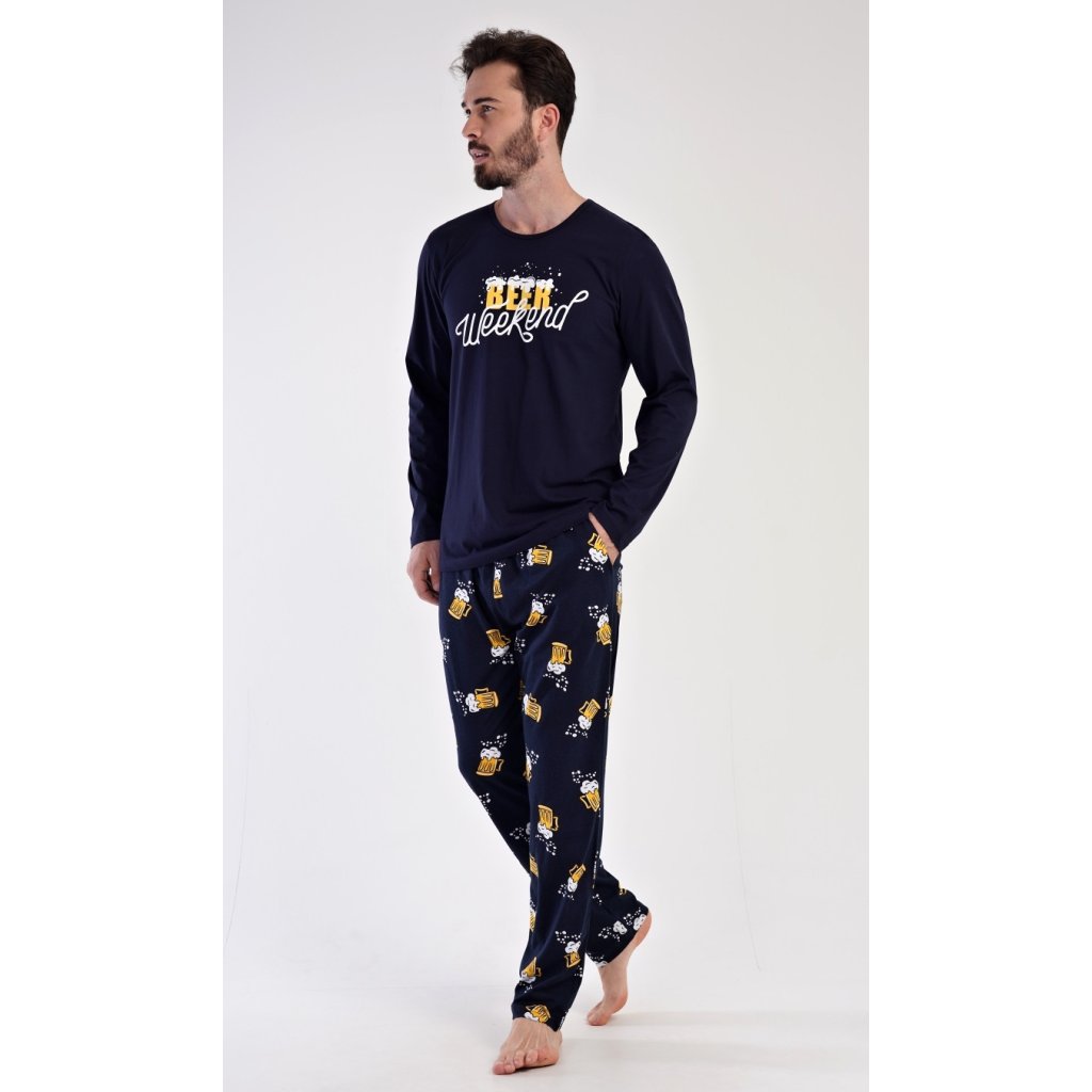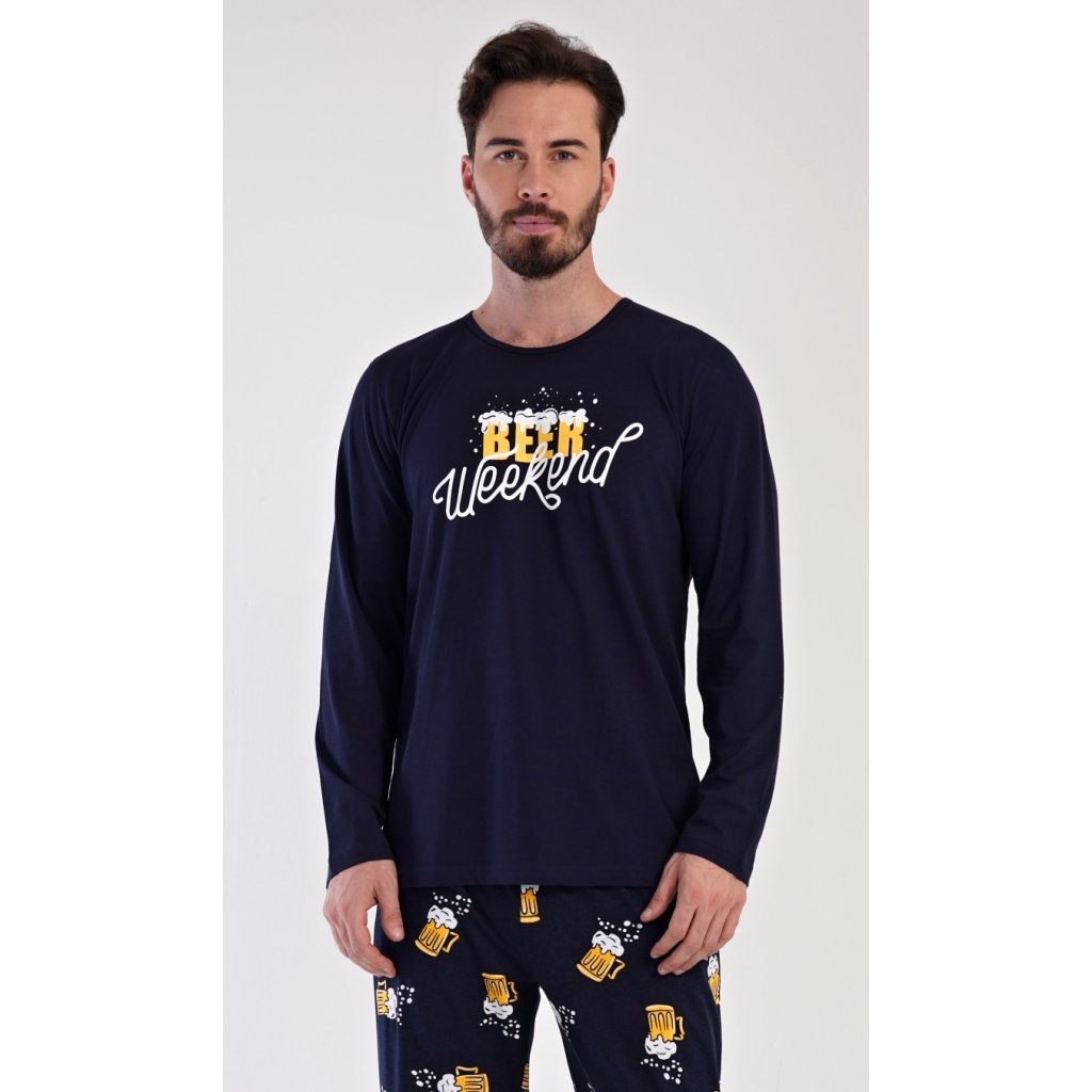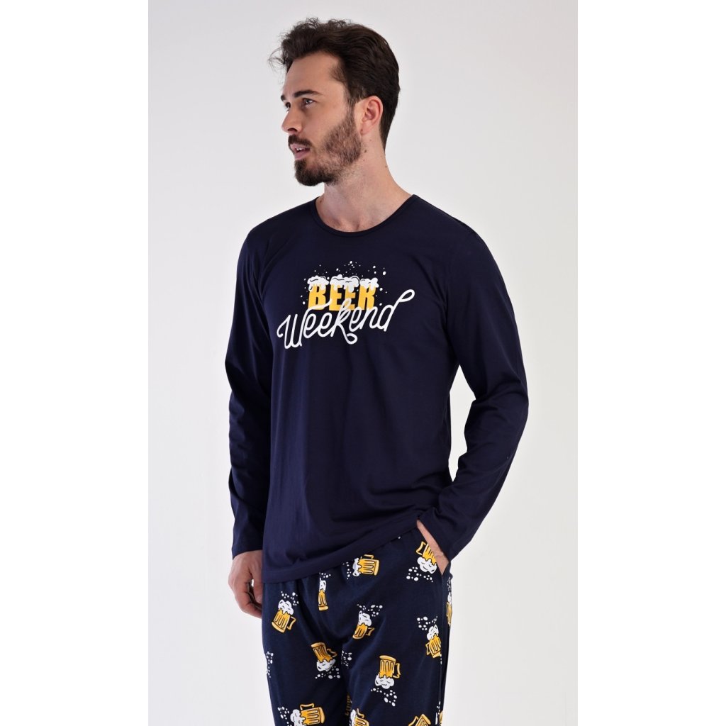 Pánské bavlněné pyžamo dlouhé Weekend. Pánské pyžamo se skládá z trika s dlouhým rukávem a dlouhých kalhot. Jednobarevné triko zdobí nápis BEER WEEKEND. Na kalhotách se motiv piva opakuje také. Kalhoty mají v pase gumu, šňůrku na stažení a praktické kapsy. Použitý materiál je jemný a poddajný na dotek. Podíl bavlny u trika a kalhot je 100%.