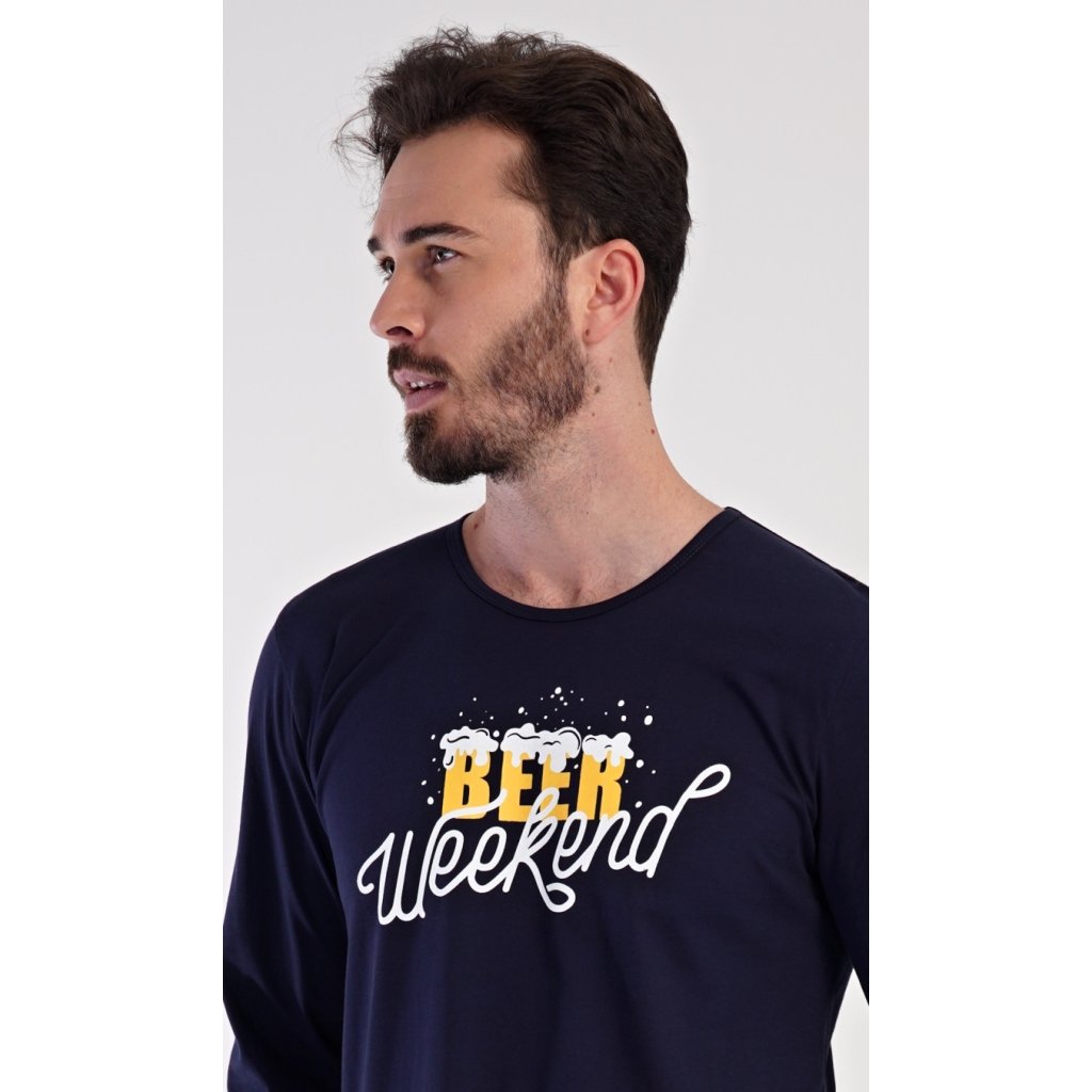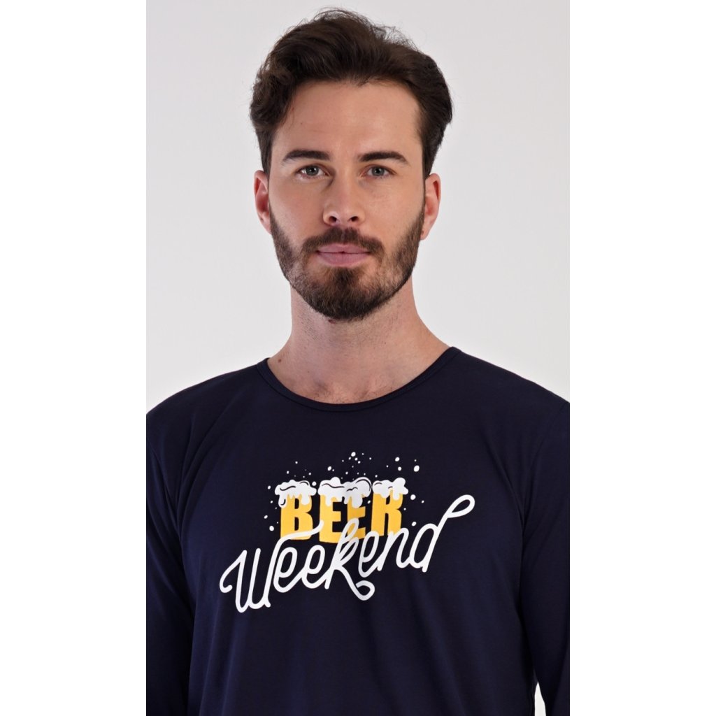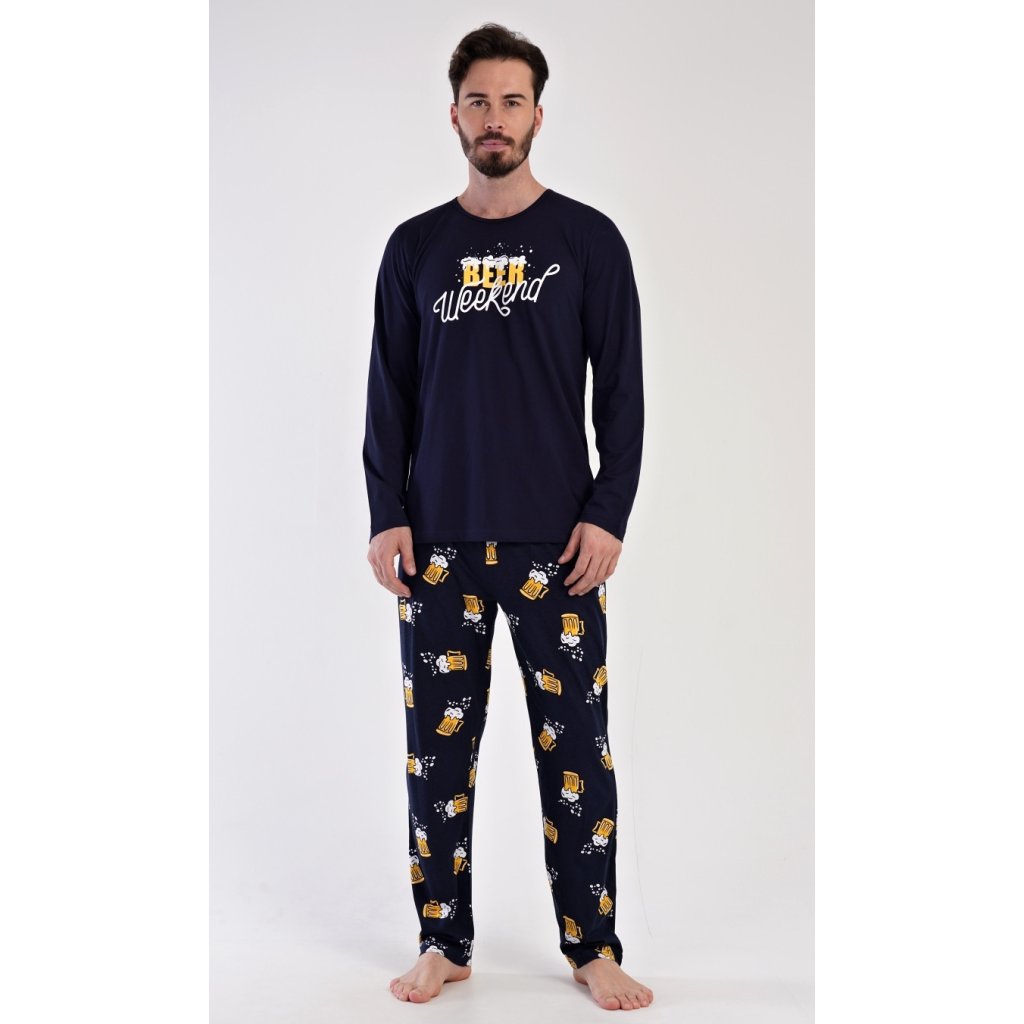 Pánské bavlněné pyžamo dlouhé Weekend. Pánské pyžamo se skládá z trika s dlouhým rukávem a dlouhých kalhot. Jednobarevné triko zdobí nápis BEER WEEKEND. Na kalhotách se motiv piva opakuje také. Kalhoty mají v pase gumu, šňůrku na stažení a praktické kapsy. Použitý materiál je jemný a poddajný na dotek. Podíl bavlny u trika a kalhot je 100%.