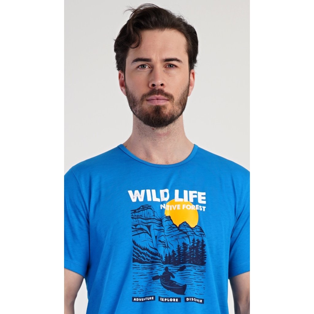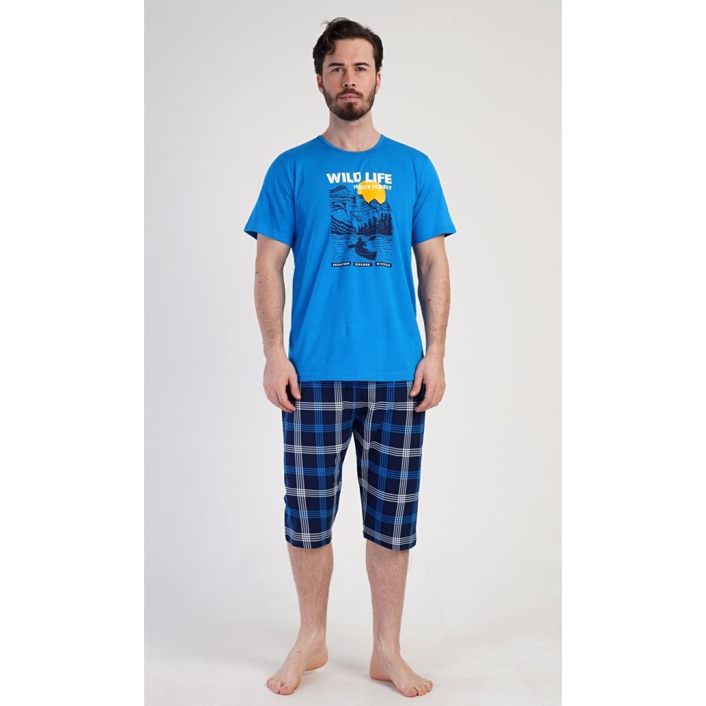 Pánské bavlněné kapri pyžamo Wild life. Pánské pyžamo se skládá z trička s krátkým rukávem a tříčtvrtečních kalhot. Jednobarevné tričko s kulatým výstřihem má na hrudi obrázek horského jezera a drobný nápis 'Wild life'. Tričko vhodně doplňují kárované kalhoty pod kolena, které mají v pase gumu, šňůrku na stažení a kapsy. Použitý materál s obsahem bavlny 100% je příjemný a poddajný na dotek.
