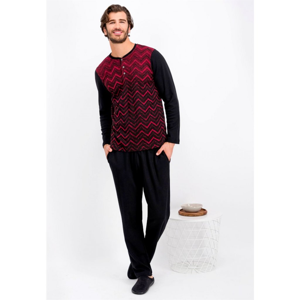 Pánské hřejivé, bavlněné pyžamo s dlouhým rukávem a dlouhou nohavicí. Horní díl je na rozepínání na knoflíčky. Složení vršek 60%viskoza 35%polyester 5%elastan spodní díl 100%bavlnaDoplňkové parametry