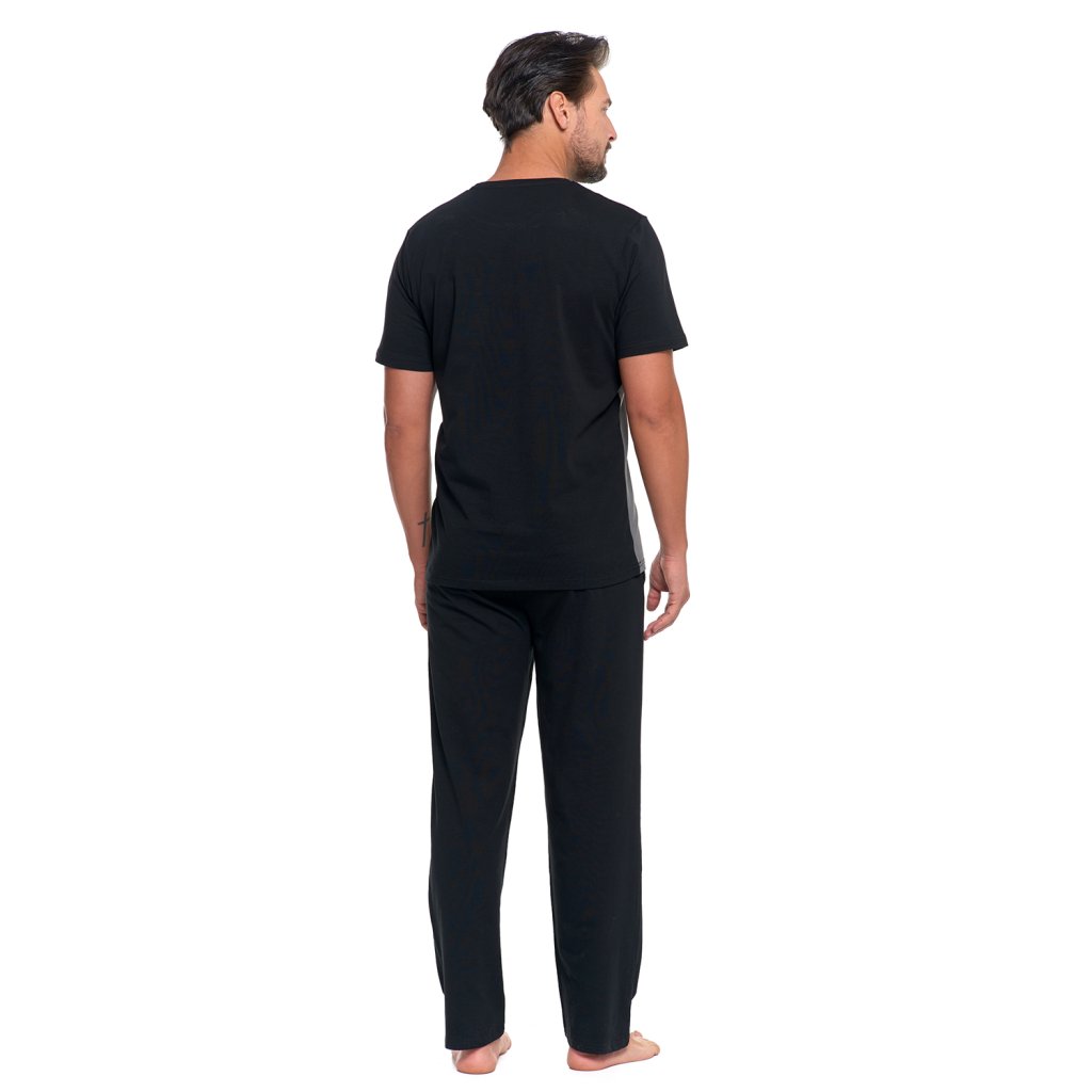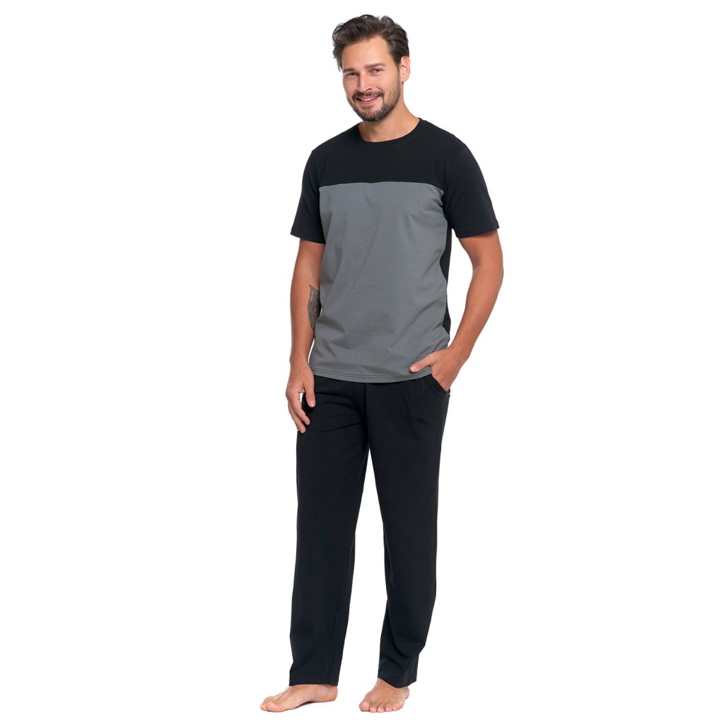 Pánské pyžamo Moraj PDM3400-006 kombinuje měkký bavlněný žerzej s pružným povrchem, díky čemuž je měkké na dotek a pohodlné na těle. Vrchní díl má krátké rukávy a klasický kulatý výstřih s úzkým lemem pro uvolněný, jednoduchý a každodenní pocit. Soupravu doplňují dlouhé rovné kalhoty, které nabízejí celoroční pohodlí. Střih je jednoduchý a funkční, bez zbytečných ozdob, což zajišťuje pohodlí při spánku a relaxaci doma. Přirozená prodyšnost bavlny podporuje tepelný komfort, zatímco přídavek elastanu zlepšuje střih. Tato praktická sada je ideální jak na noc, tak na klidné večery doma.Bavlněný žerzej s elastanem, měkký a pohodlný