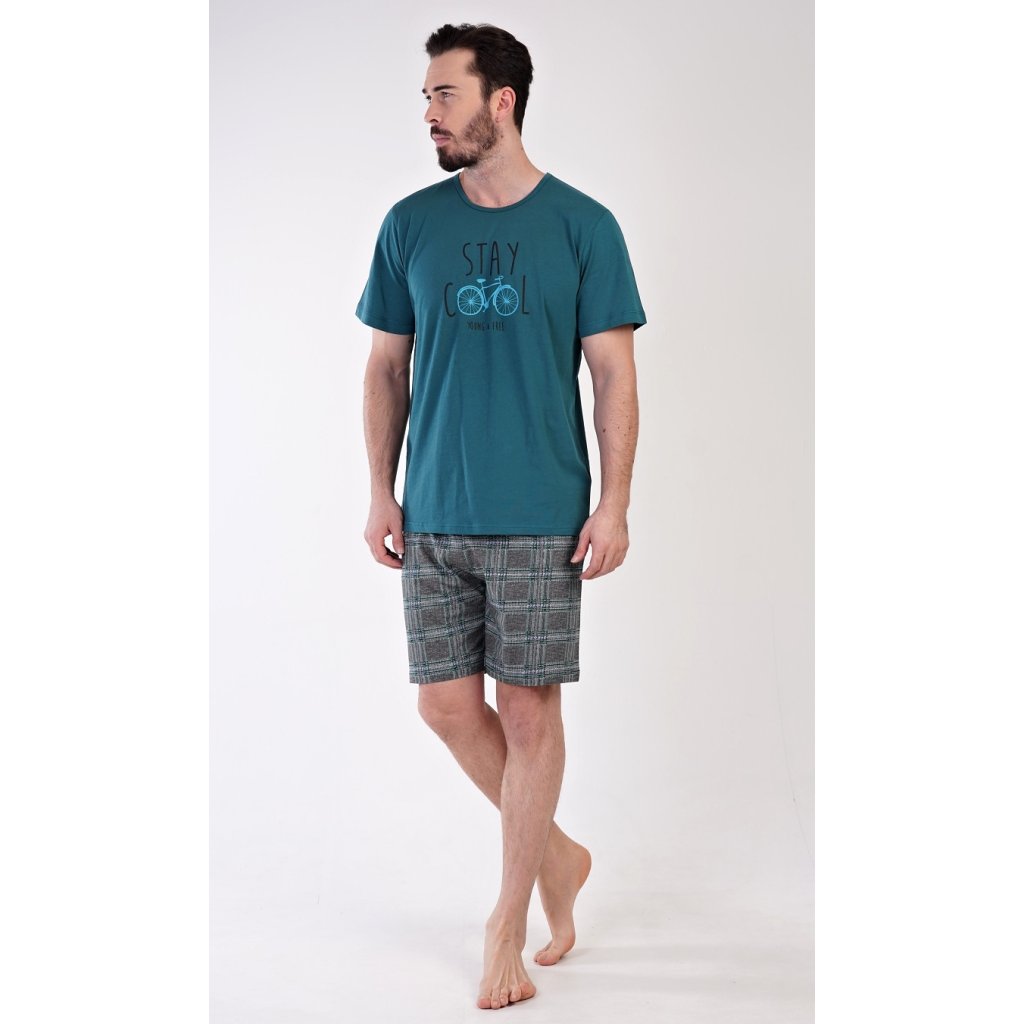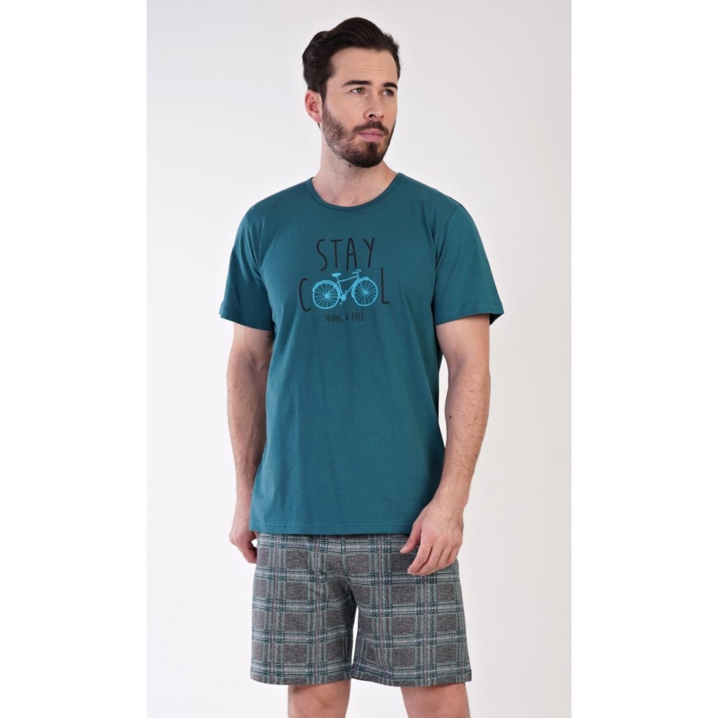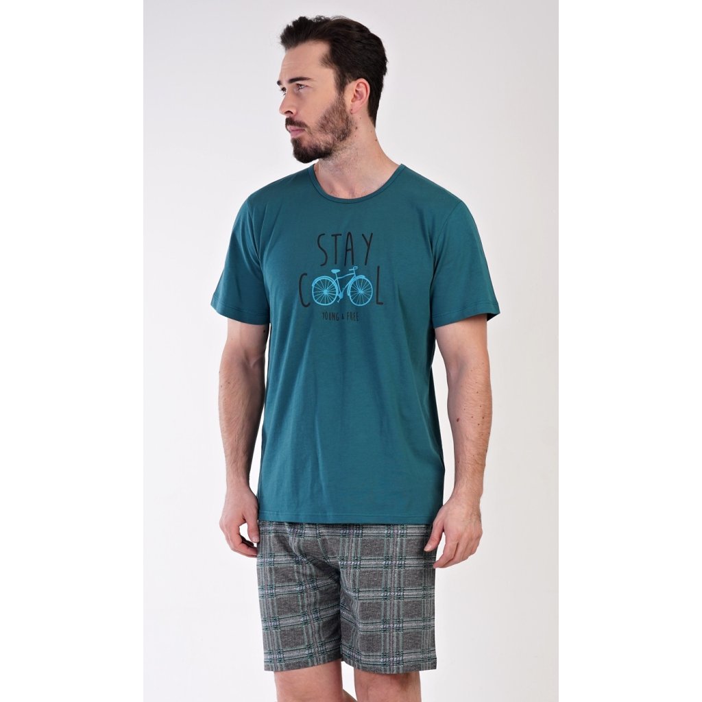 Pánské bavlněné pyžamo šortky Adam. Pánské pyžamo se skládá z trička s krátkým rukávem a krátkých šortkových kalhot. Na tričku je obrázek kola a nápis 'Stay cool, young and free'. Tričko doplňují kárované šortky, které mají v pase gumu a šňůrku na stažení. Nemají kapsy. Použitý materiál s obsahem bavlny 100% je příjemný a poddajný na dotek.