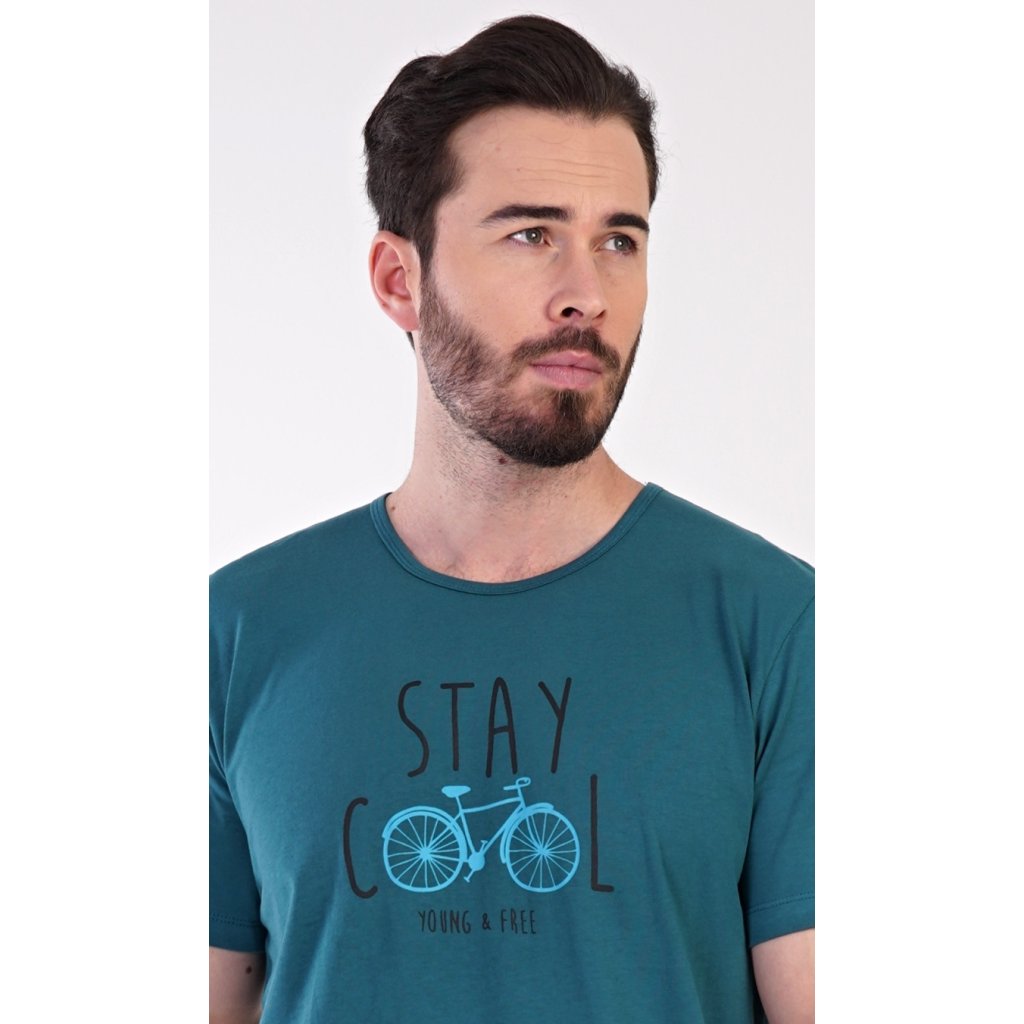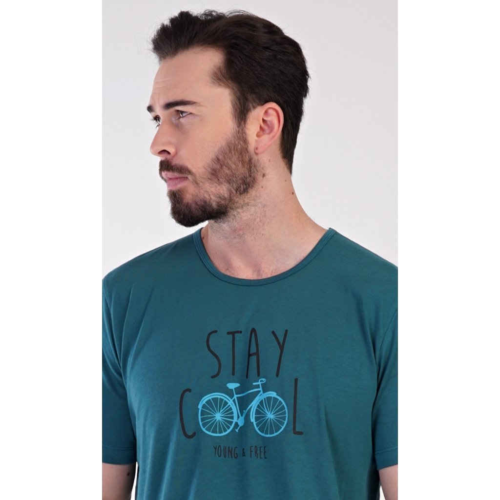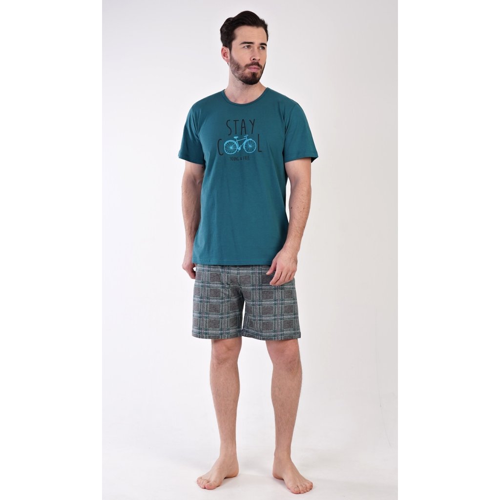 Pánské bavlněné pyžamo šortky Adam. Pánské pyžamo se skládá z trička s krátkým rukávem a krátkých šortkových kalhot. Na tričku je obrázek kola a nápis 'Stay cool, young and free'. Tričko doplňují kárované šortky, které mají v pase gumu a šňůrku na stažení. Nemají kapsy. Použitý materiál s obsahem bavlny 100% je příjemný a poddajný na dotek.