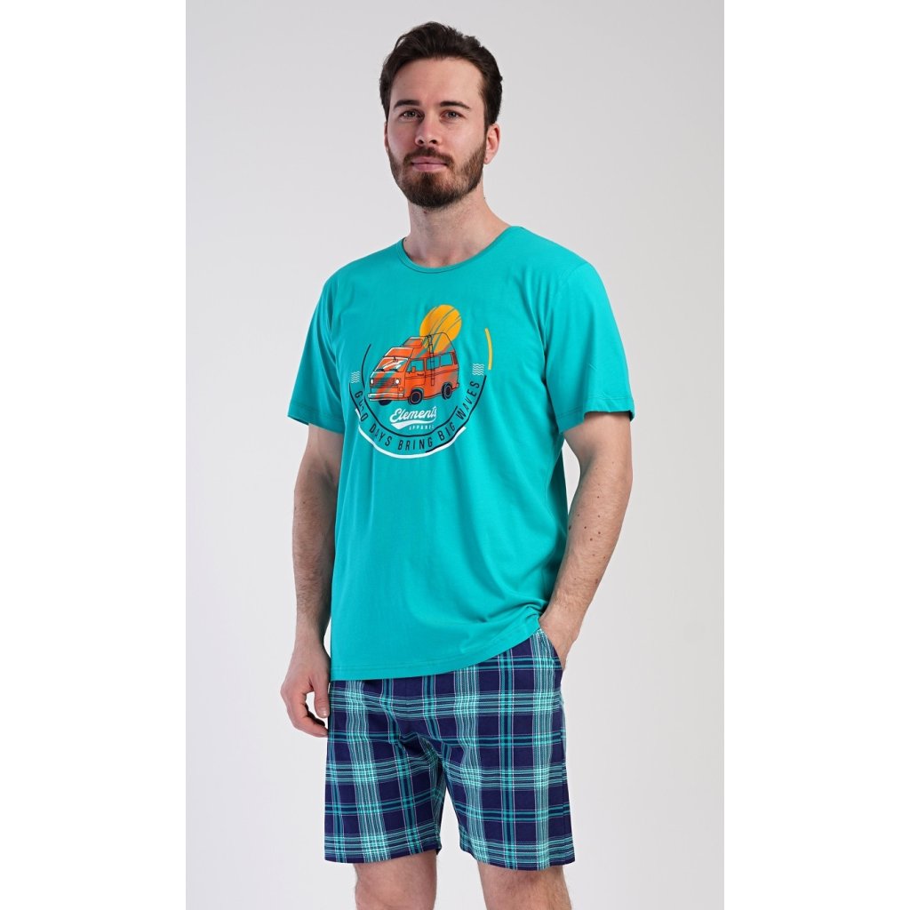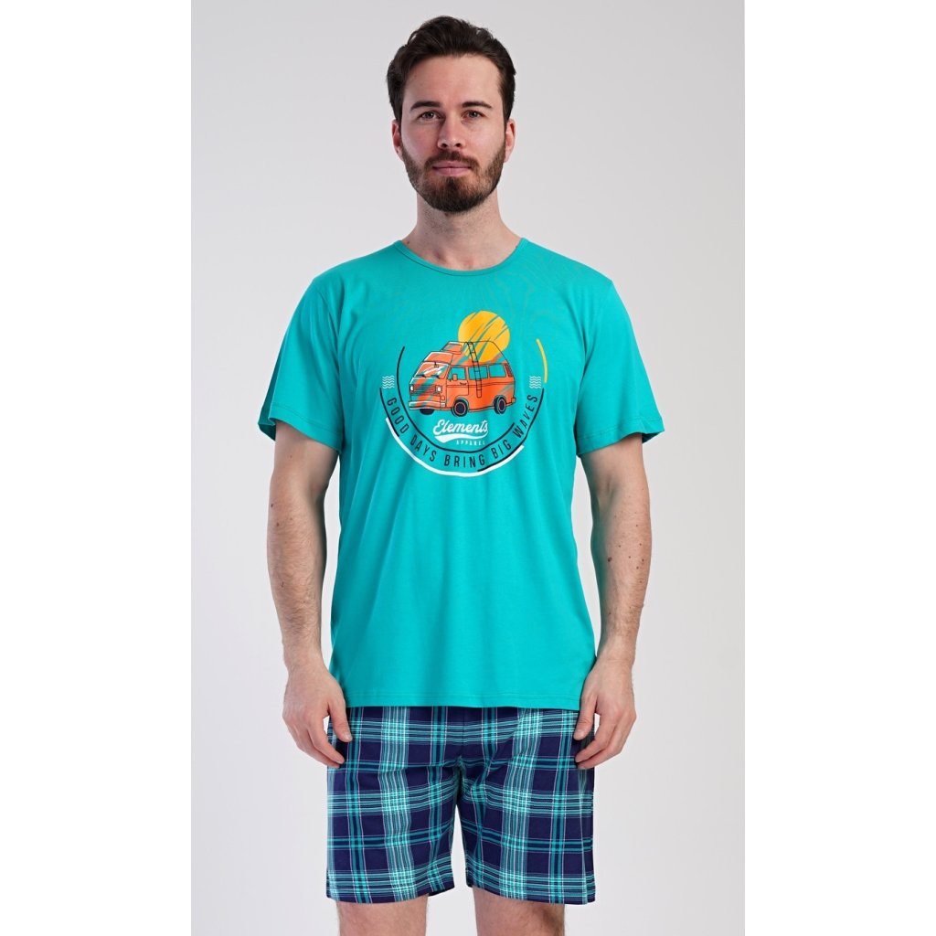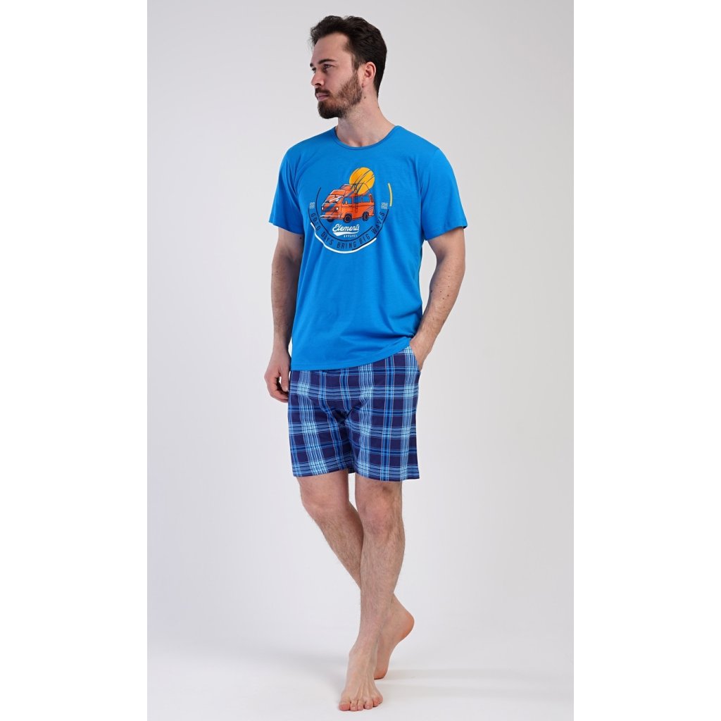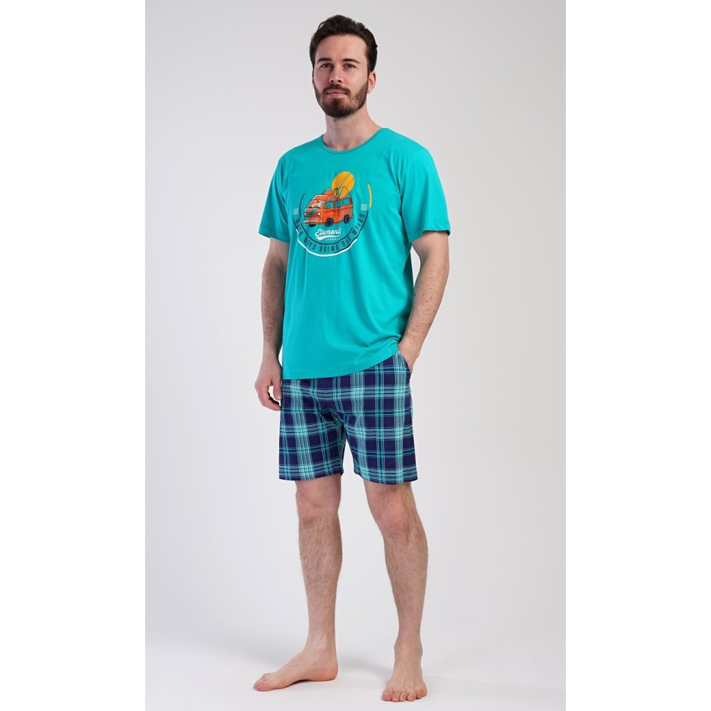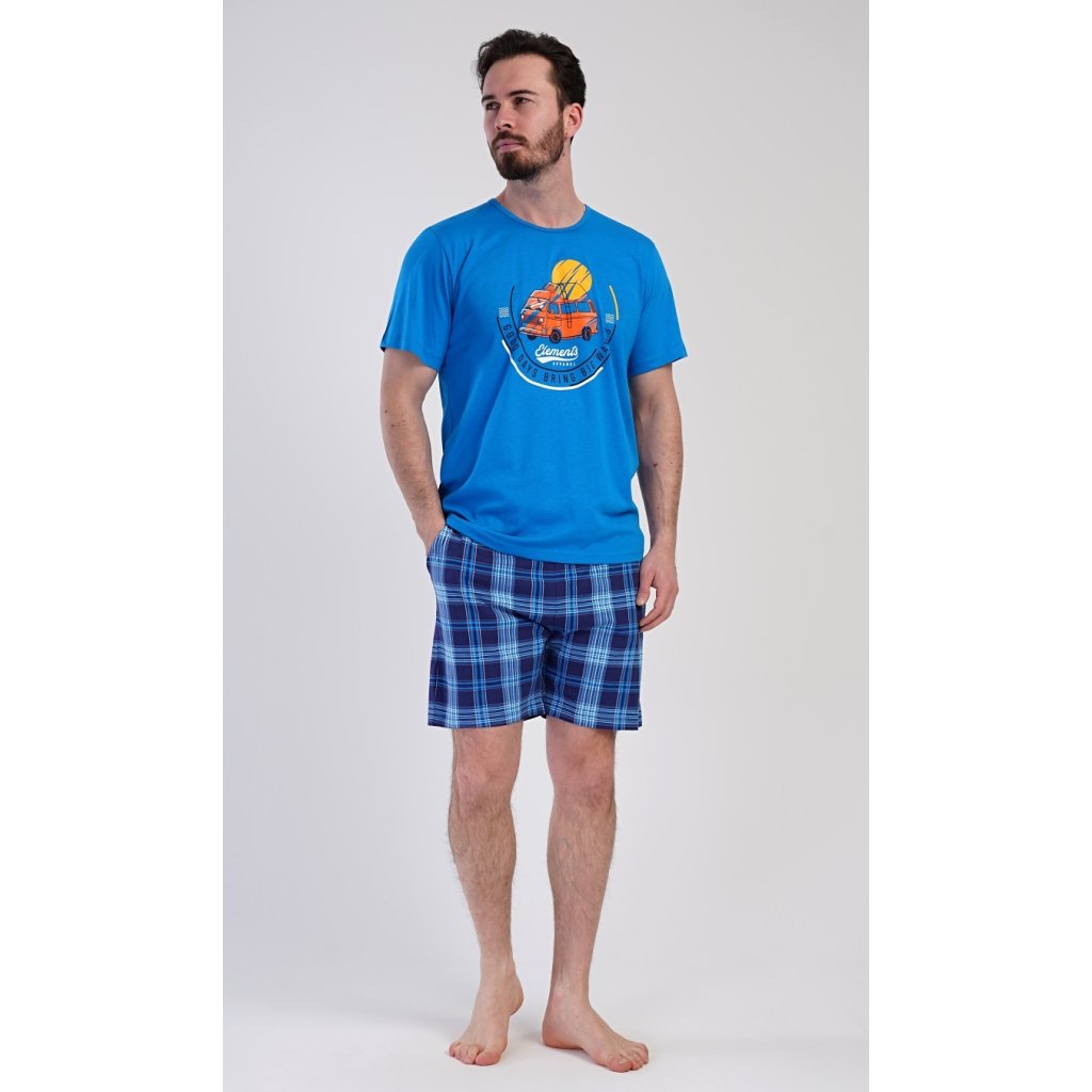 Pánské bavlněné šortkové pyžamo Adventure. Pánské pyžamo se skládá z trička s krátkým rukávem a krátkých šortkových kalhot. Na tričku je obrázek obytného vozu a nápis 'Good days bring big waves'. Tričko doplňují kárované šortky, které mají v pase gumu, šňůrku na stažení a praktické kapsy. Použitý materiál s obsahem bavlny 100% je příjemný a poddajný na dotek.