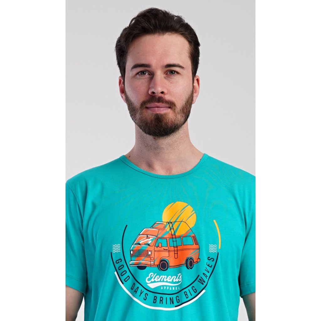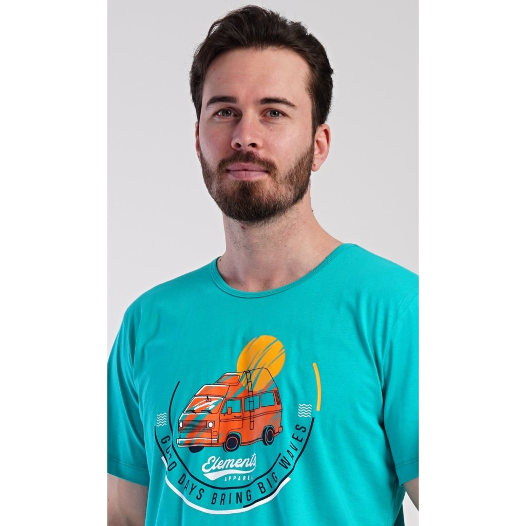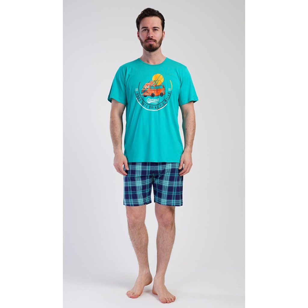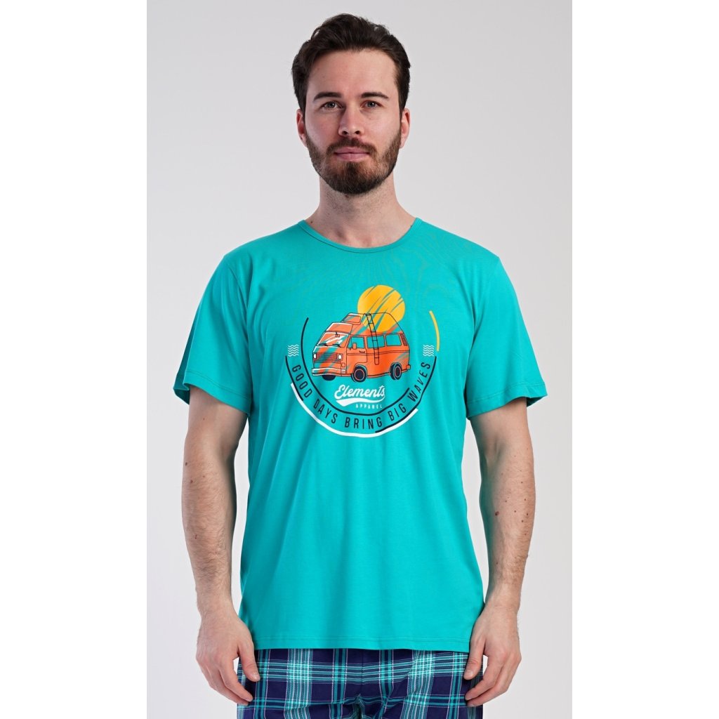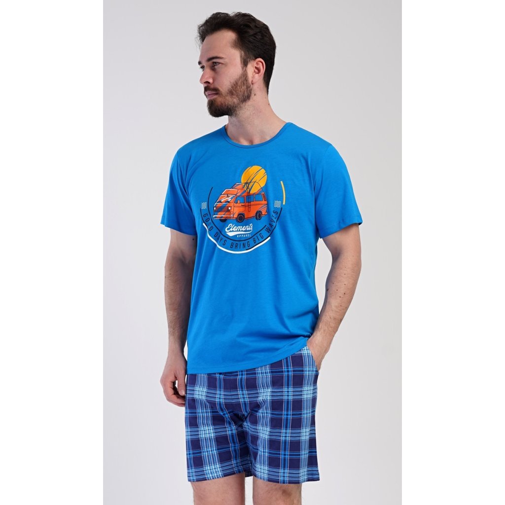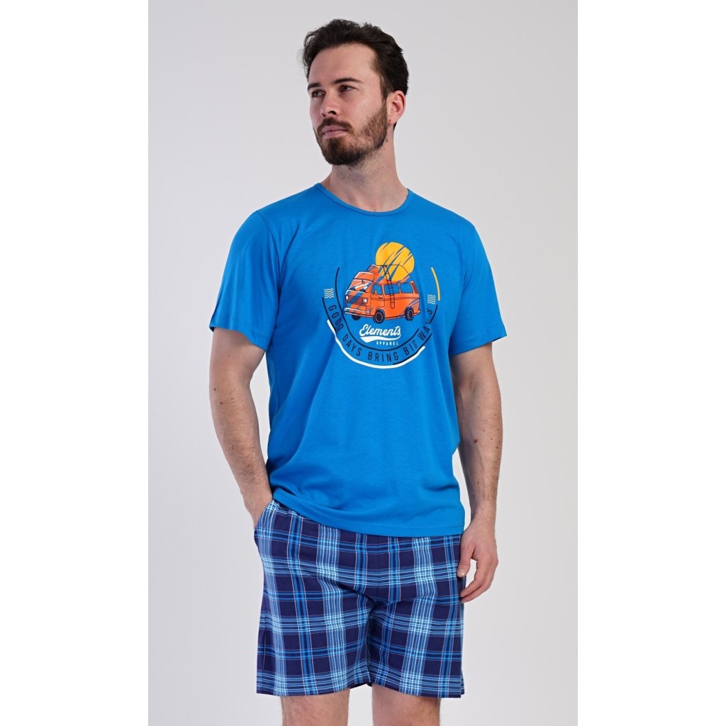 Pánské bavlněné šortkové pyžamo Adventure. Pánské pyžamo se skládá z trička s krátkým rukávem a krátkých šortkových kalhot. Na tričku je obrázek obytného vozu a nápis 'Good days bring big waves'. Tričko doplňují kárované šortky, které mají v pase gumu, šňůrku na stažení a praktické kapsy. Použitý materiál s obsahem bavlny 100% je příjemný a poddajný na dotek.