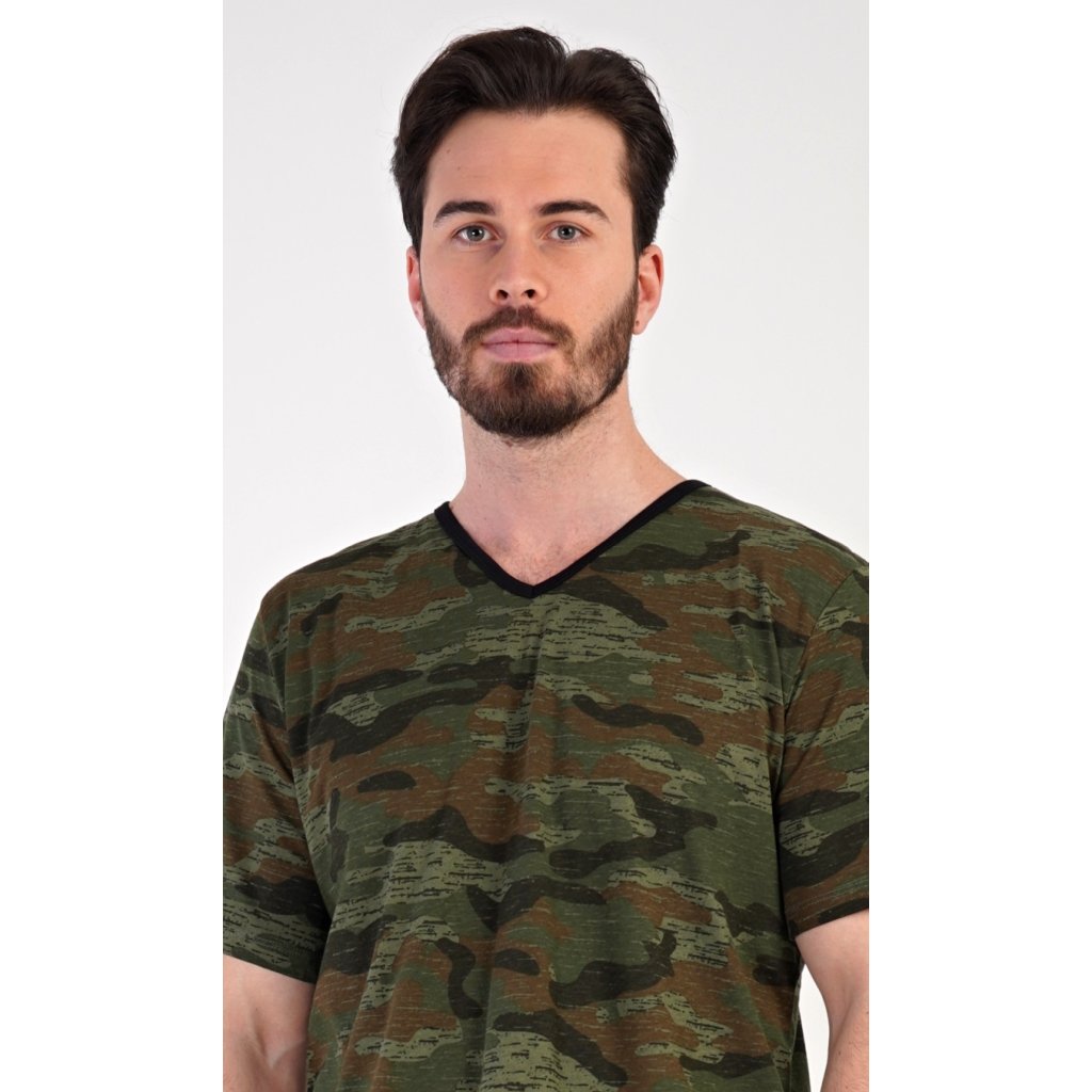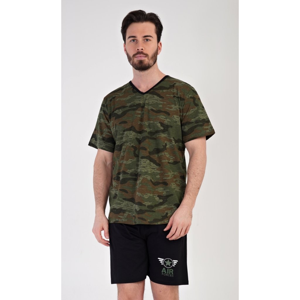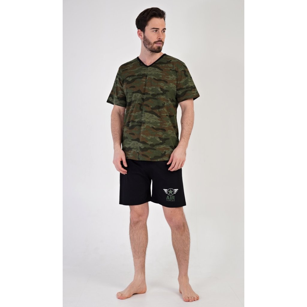 Pánské bavlněné pyžamo šortky Air forces. Pánské pyžamo se skládá z trička s krátkým rukávem a šortkových kalhot. Tričko s army potiskem má výstřih do V v černé barvě. Tričko doplňují černé šortky, které mají v pase gumu a šňůrku na stažení. Nemají kapsy. Použitý materiál s obsahem bavlny 100% je příjemný a poddajný na dotek.