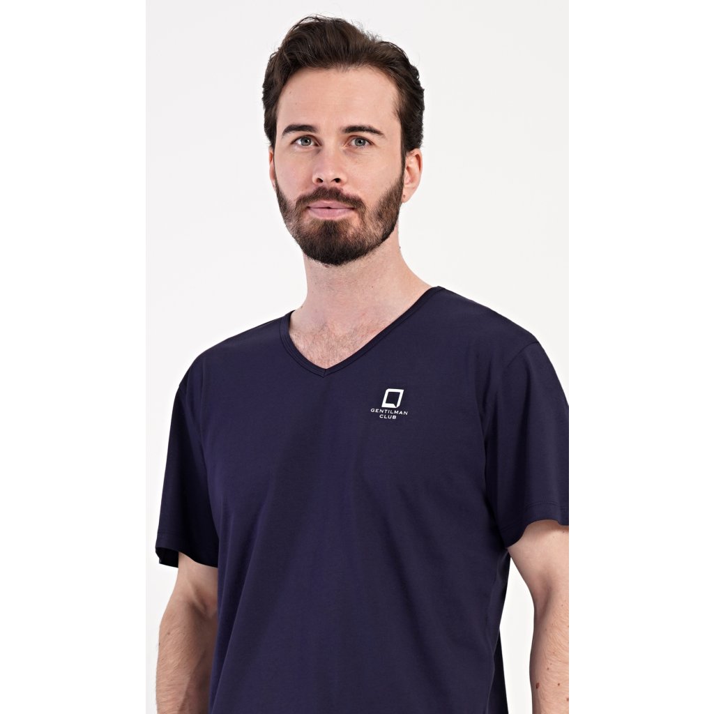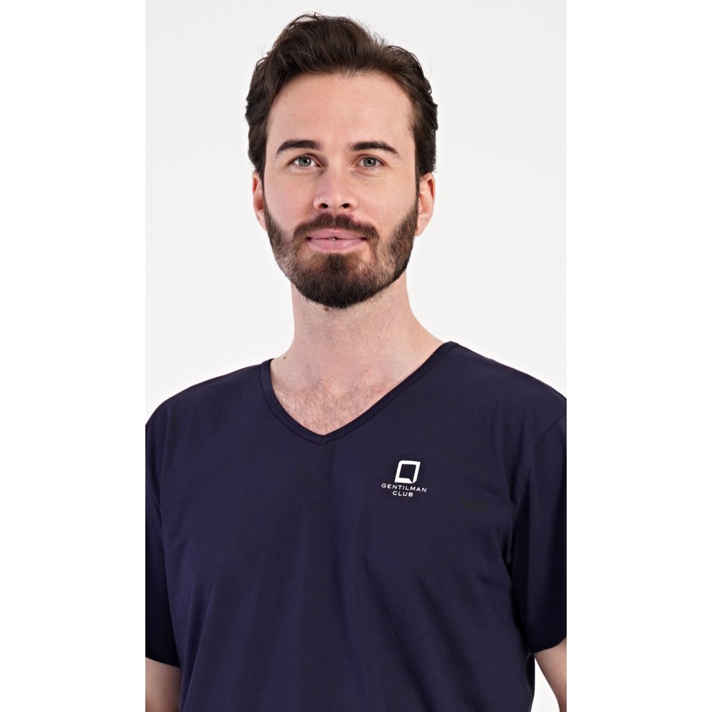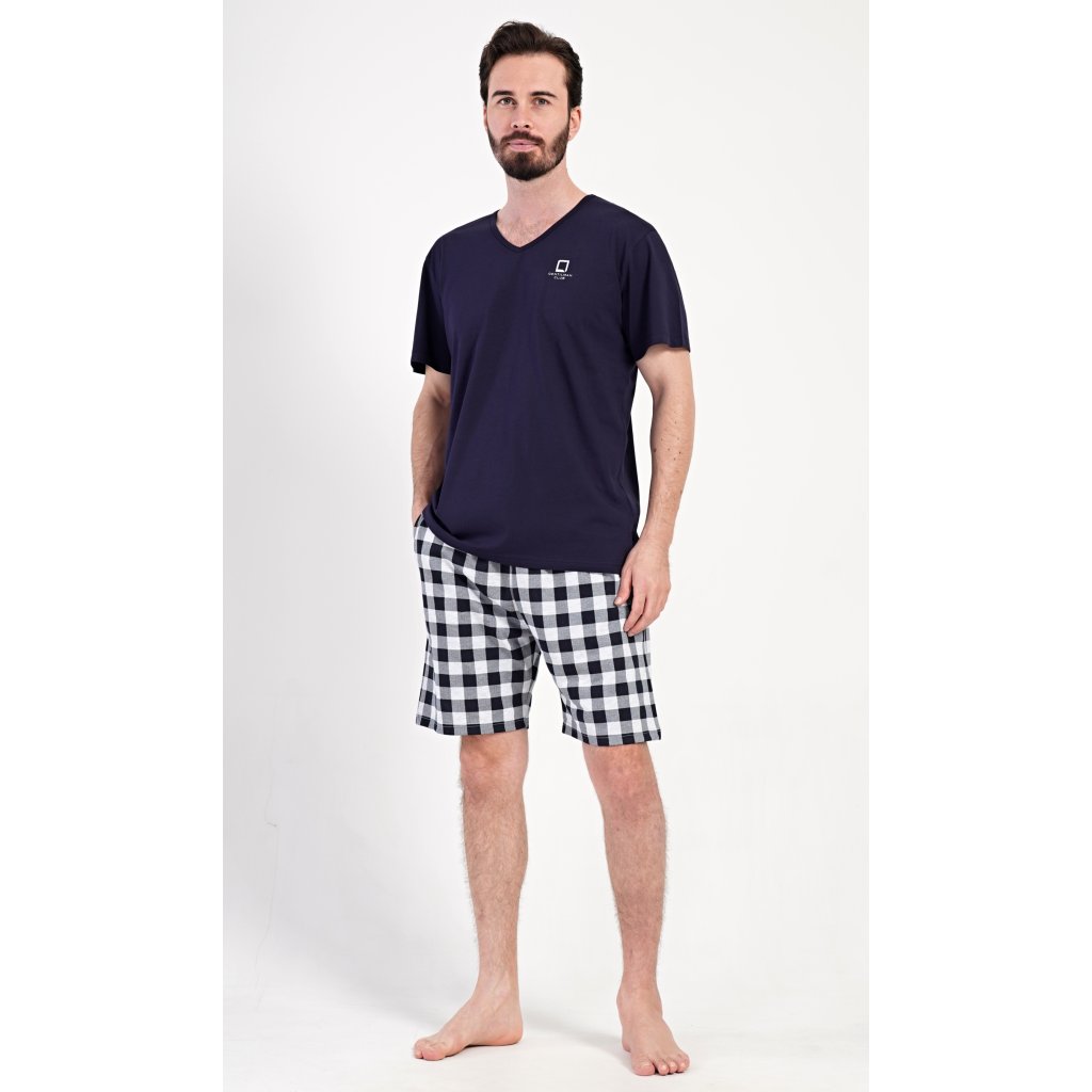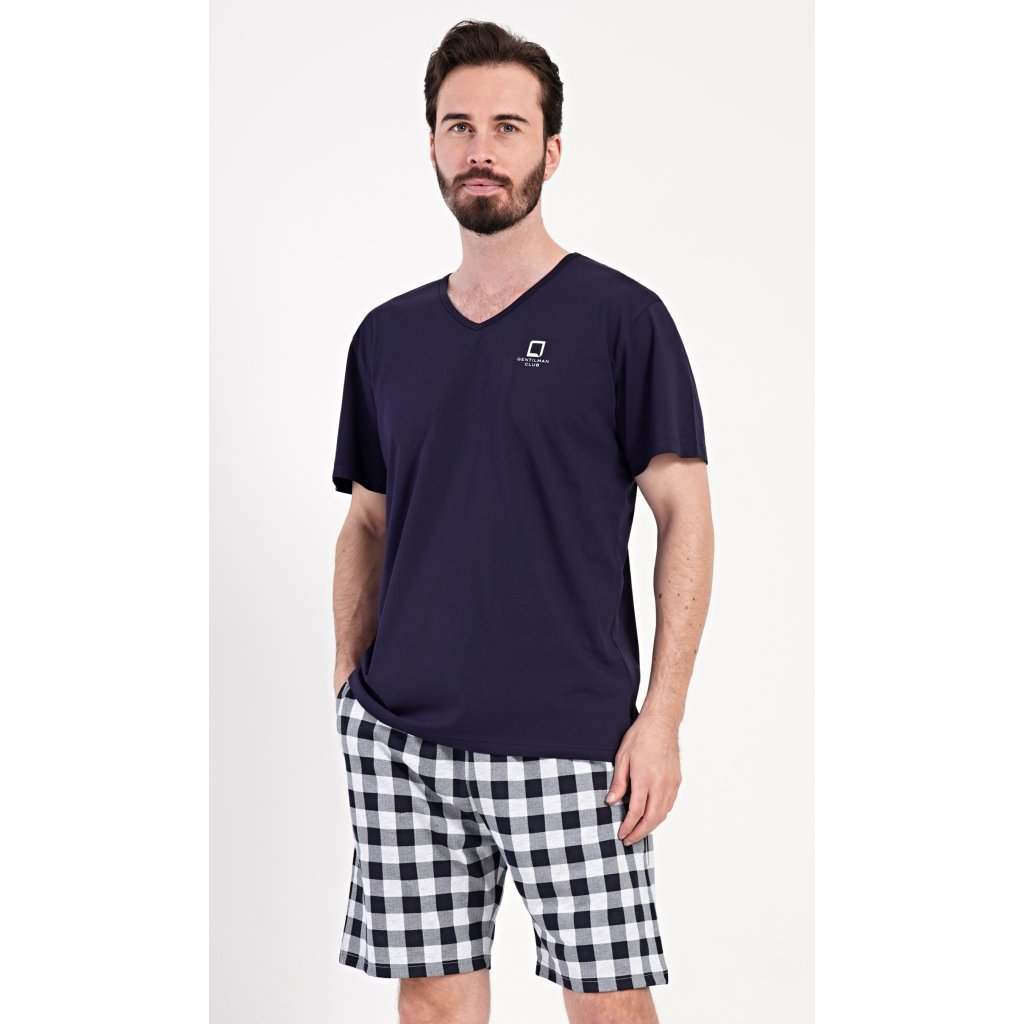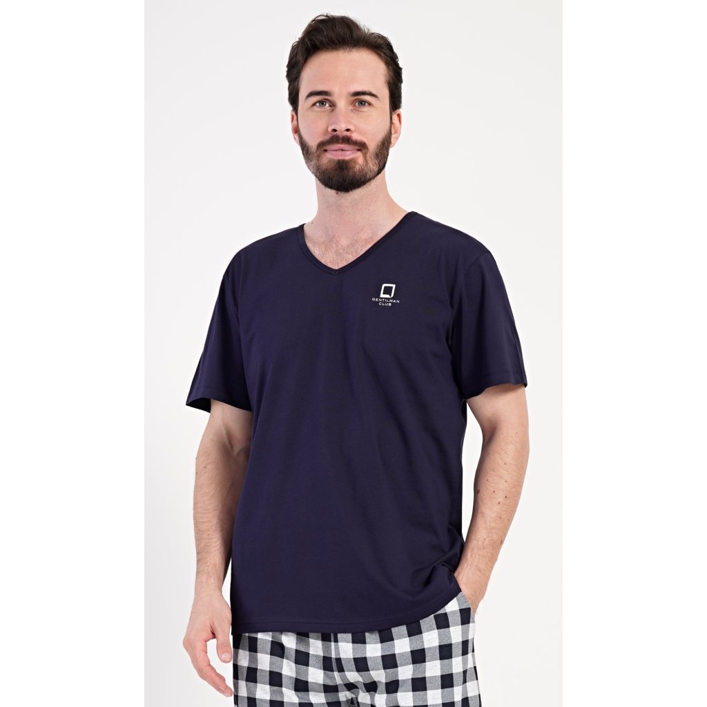 Pánské bavlněné šortkové pyžamo Alfréd. Pánské pyžamo se skládá z trička s krátkým rukávem a krátkých šortkových kalhot. Tričko s výstřihem do V zdobí na hrudi malé logo a nápis GENTLEMAN CLUB. Tričko doplňují kárované šortky, které mají v pase gumu, šňůrku na stažení a praktické kapsy. Použitý materiál s obsahem bavlny 100% je příjemný a poddajný na dotek.