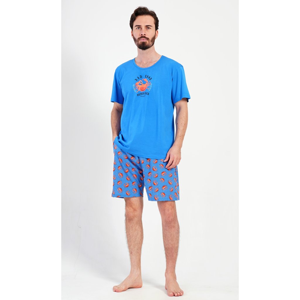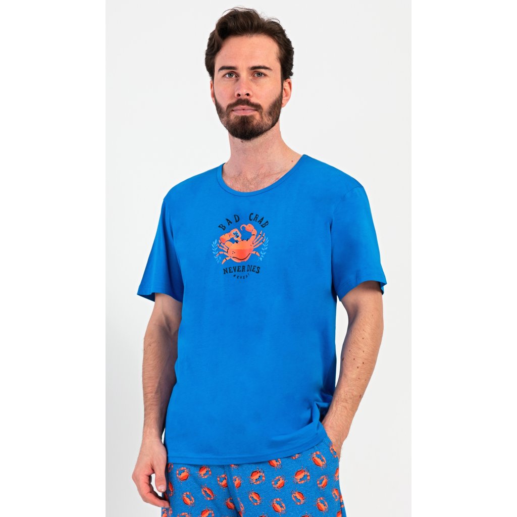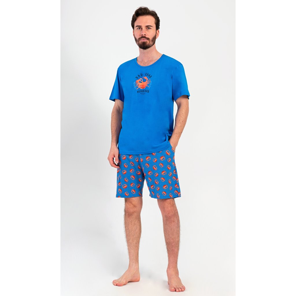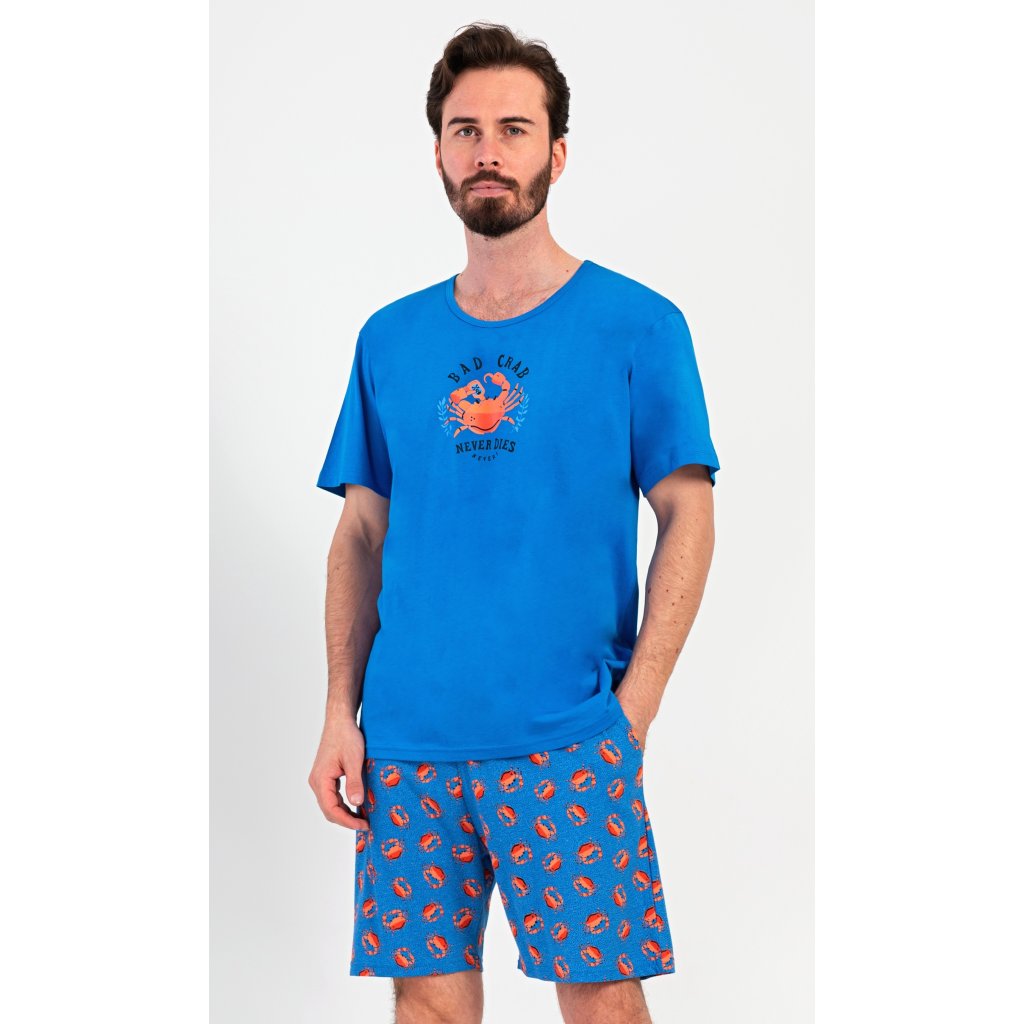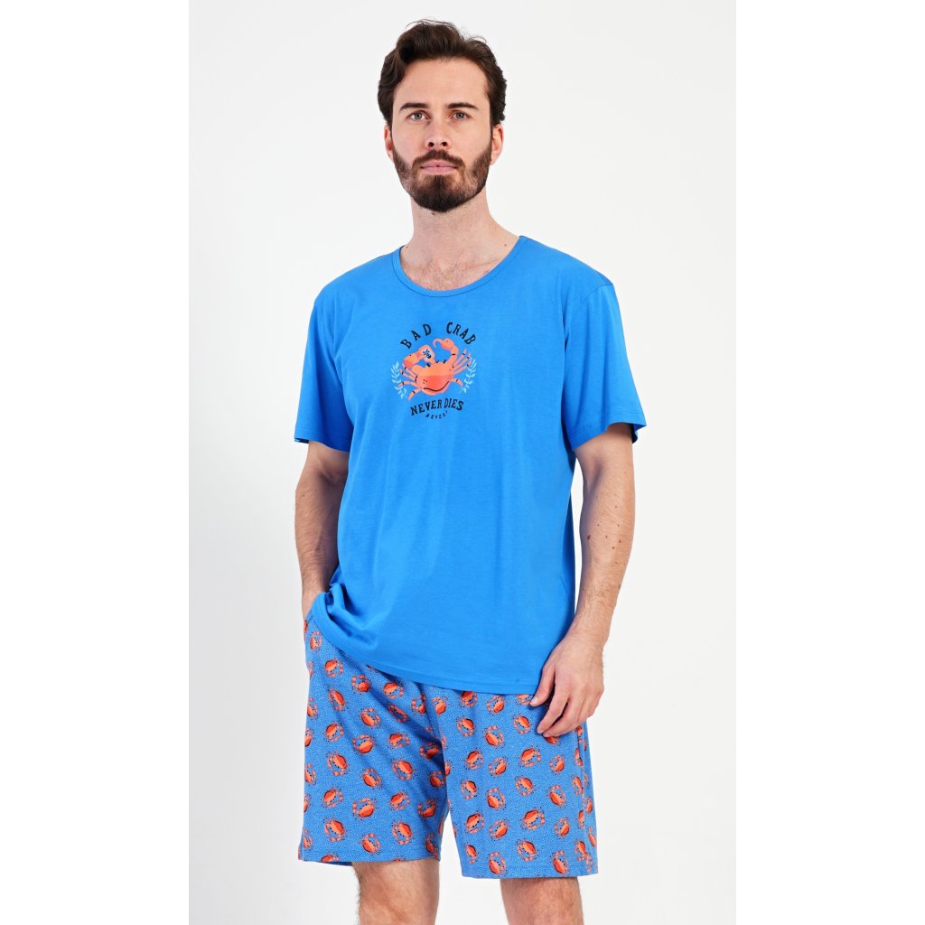 Pánské bavlněné šortkové pyžamo Bad crab. Pánské pyžamo se skládá z trička s krátkým rukávem a krátkých šortkových kalhot. Tričko s kulatým výstřihem zdobí obrázek kraba a nápis 'Bad crab'. Motiv kraba se opakuje i na šortkách, které mají v pase gumu, šňůrku na stažení a praktické kapsy. Použitý materiál s obsahem bavlny 100% je příjemný a poddajný na dotek.