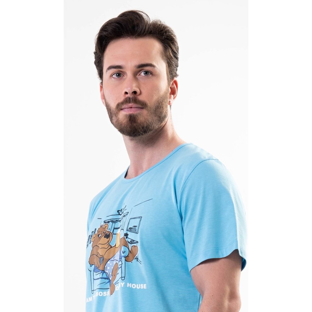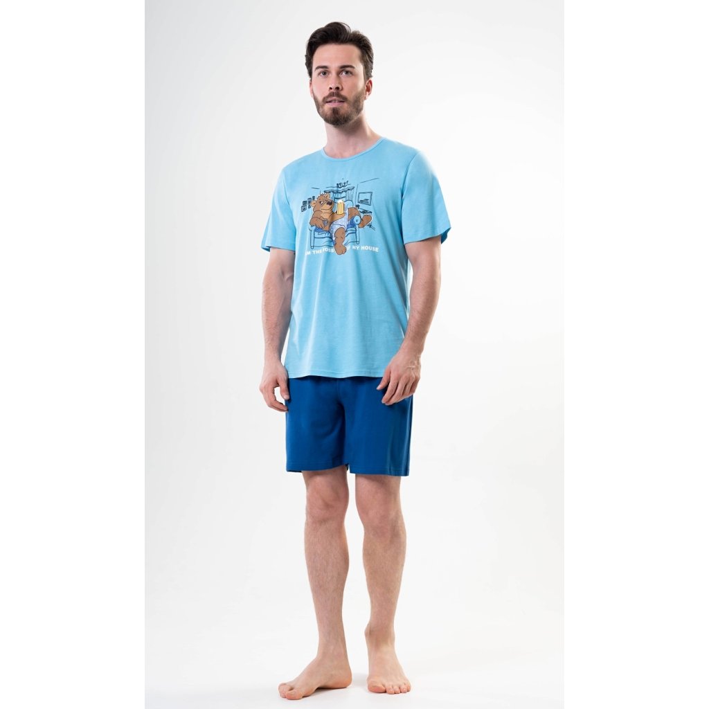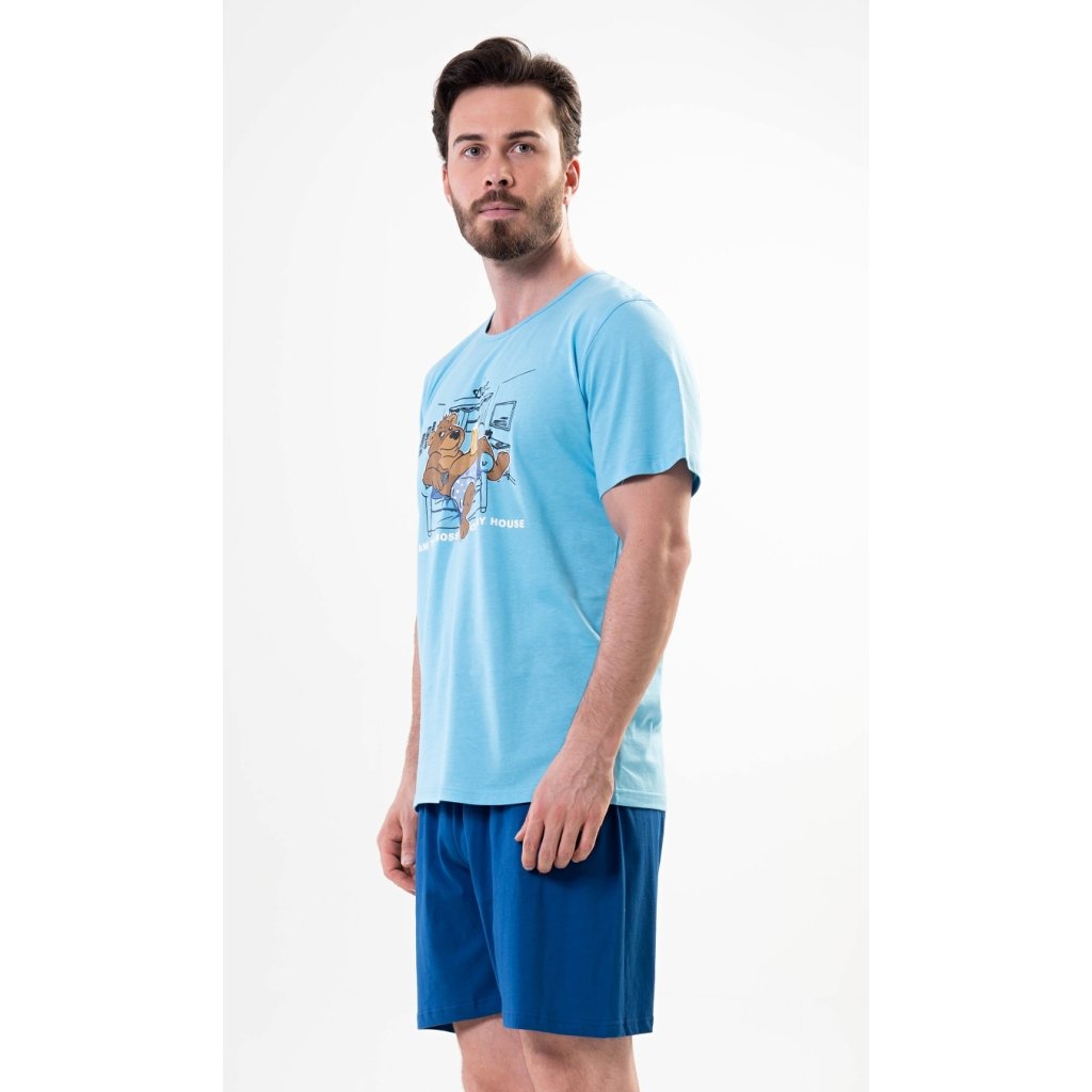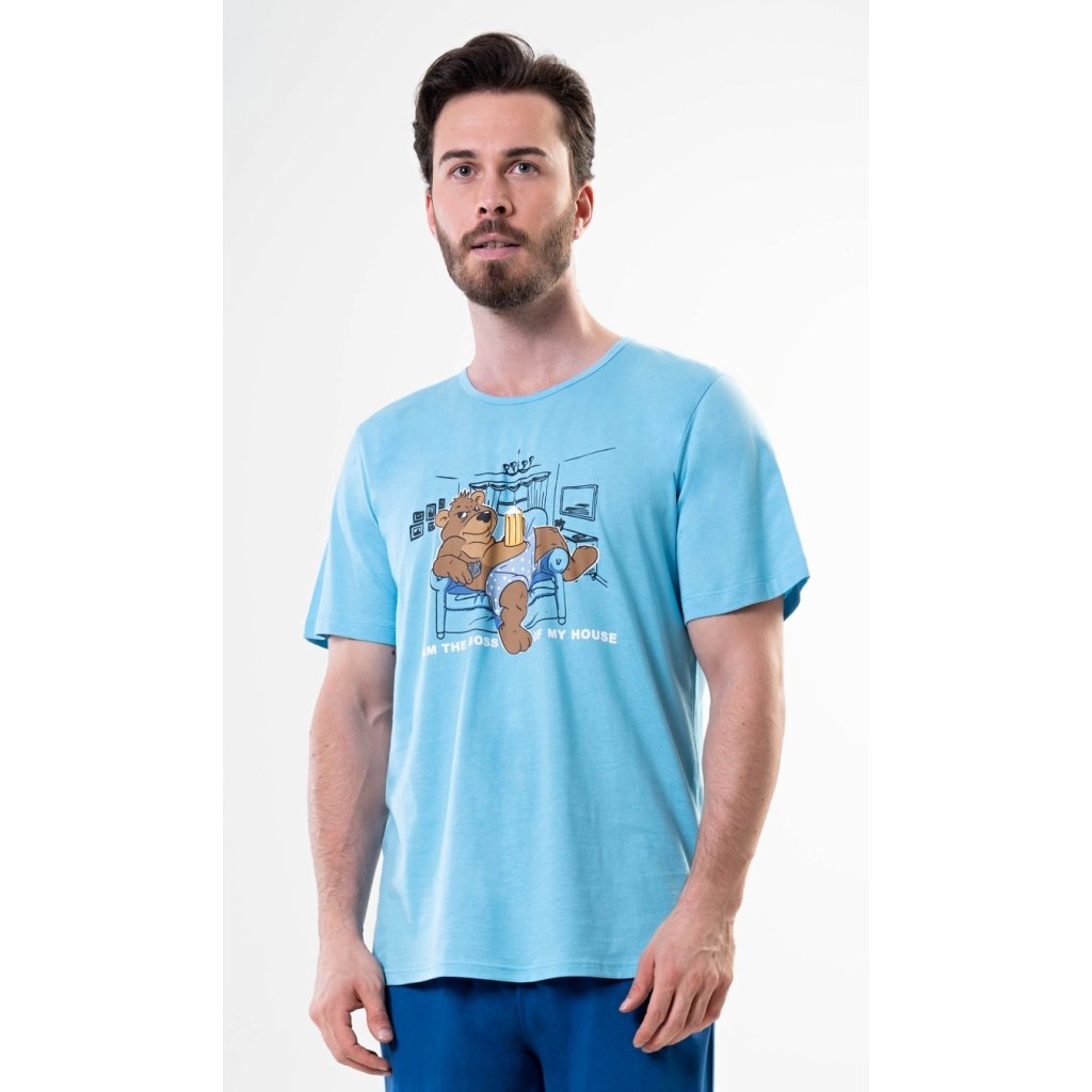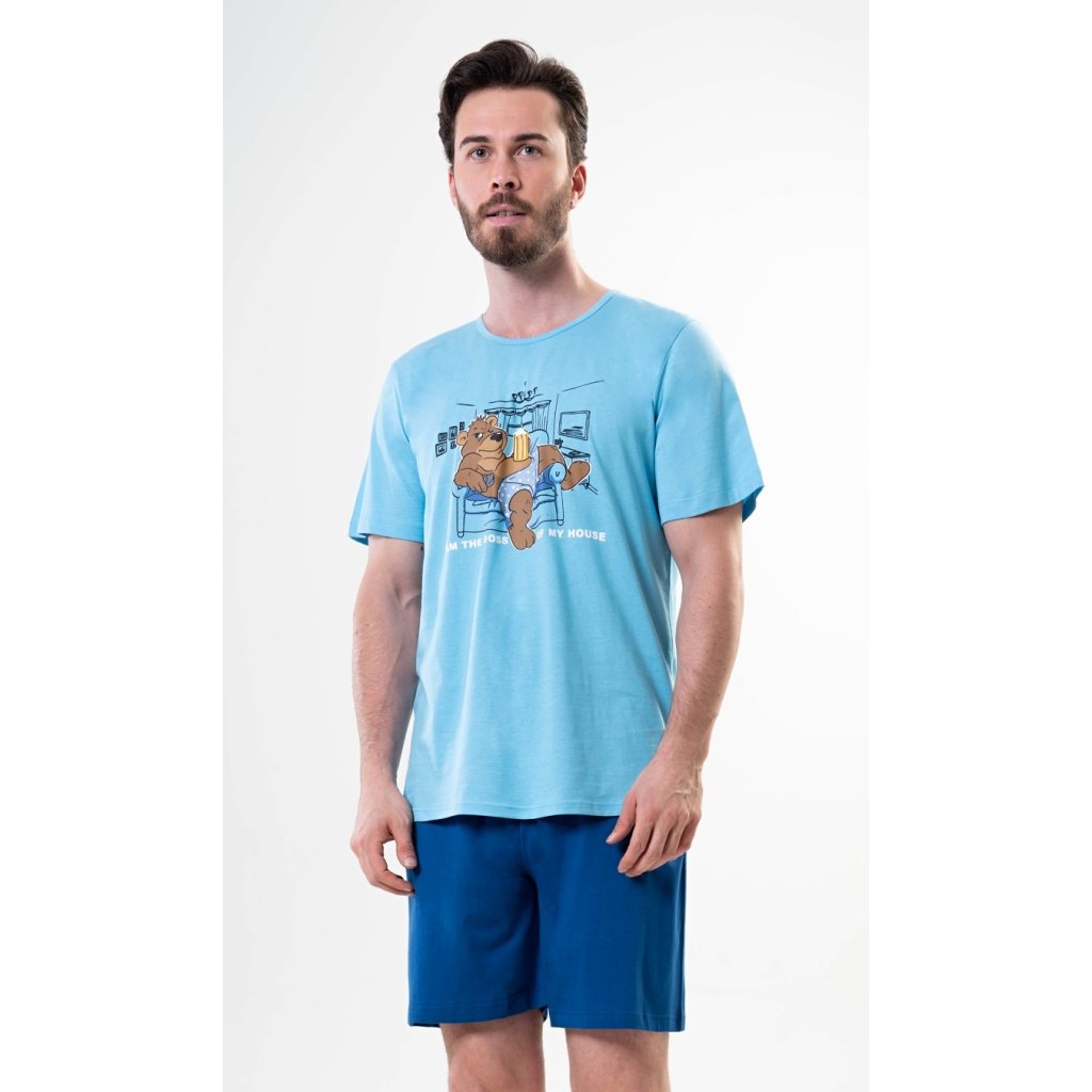 Pánské bavlněné pyžamo šortky Boss. Pánské pyžamo se skládá z trička s krátkým rukávem a krátkých šortkových kalhot. Na jednobarevném tričku s kulatým výstřihem je obrázek medvěda odpočívajícího v křesle a nápis 'Im the Boss of my House'. Tričko doplňují jednobarevné šortky, které mají v pase gumu a šňůrku ke stažení. Nemají kapsy. Použitý materiál je příjemný a poddajný na dotek. Podíl bavlny u trička a šortek je 100%. Pyžamo je vhodné i na denní nošení.