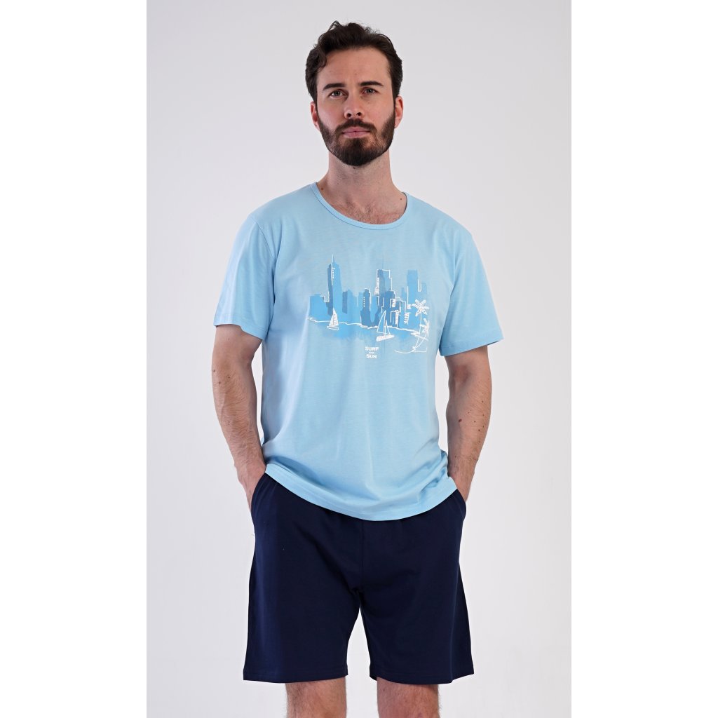 Pánské bavlněné šortkové pyžamo Bruno. Pánské pyžamo se skládá z trička s krátkým rukávem a krátkých šortkových kalhot. Jednobarevné tričko zdobí obrázek zátoky ve velkoměstě. Šortky mají praktické kapsy, v pase gumu a šňůrku na stáhnutí. Použitý materiál s podílem bavlny 100% je příjemný a poddaný na dotek. Pyžamo oceníte obzvlášť v horkých letních dnech.