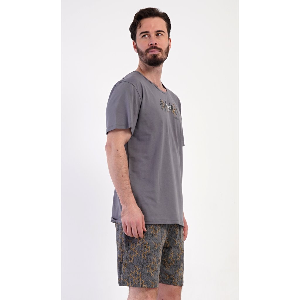 Pánské bavlněné šortkové pyžamo City. Pánské pyžamo se skládá z trička s krátkým rukávem a krátkých šortkových kalhot. Jednobarevné tričko s kulatým výstřihem zdobí na hrudi obázek výškových budov a nápis NEW WORLD. Tričko doplňují šortky, které mají v pase gumu, šňůrku na stažení a praktické kapsy. Použitý materiál s obsahem bavlny 100% je příjemný a poddajný na dotek.