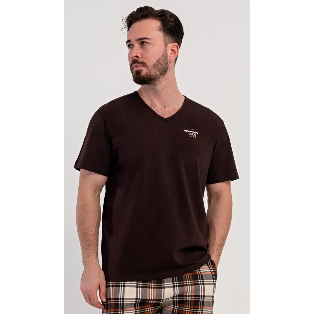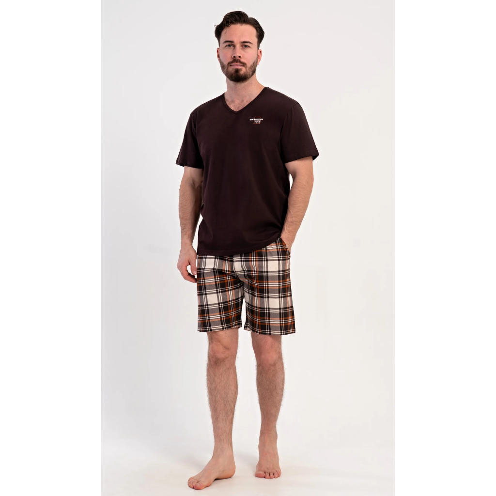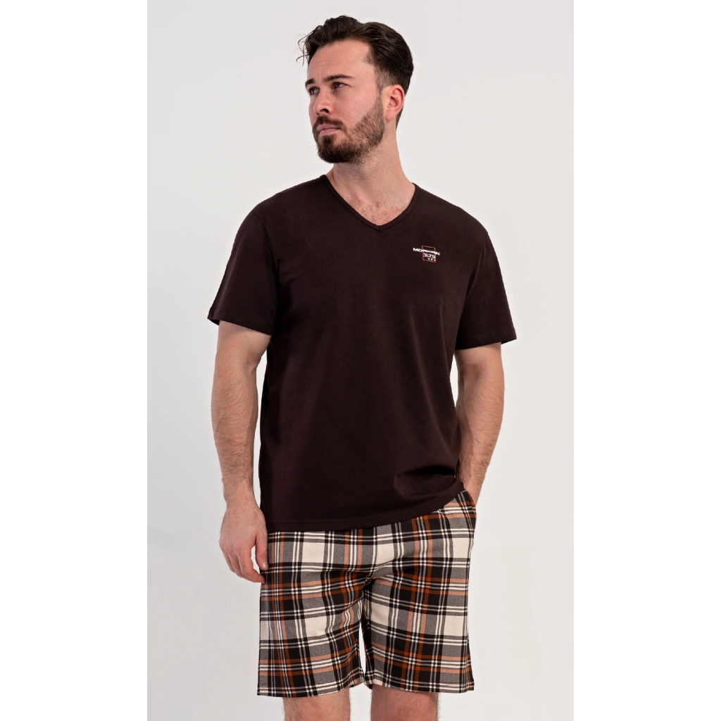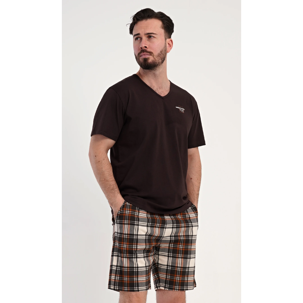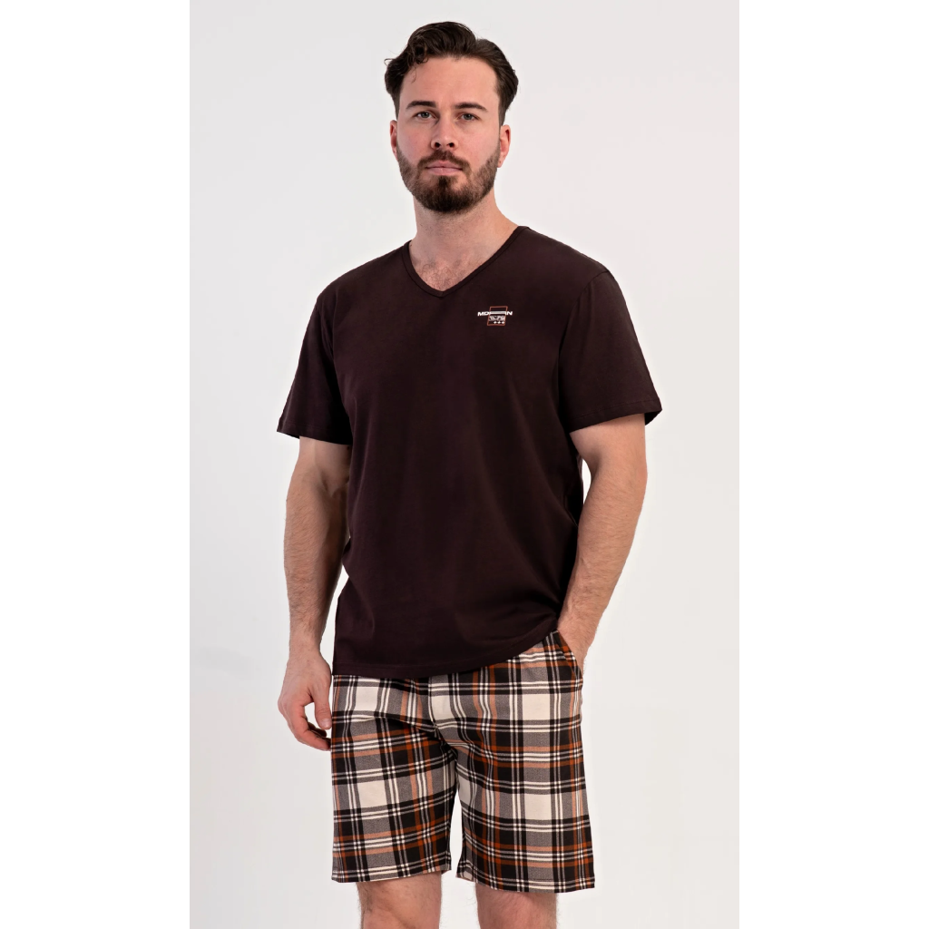 Pánské bavlněné šortkové pyžamo Daniel. Pánské pyžamo se skládá z trička s krátkým rukávem a krátkých šortkových kalhot. Tričko s kulatým výstřihem zdobí na hrudi drobný nápis. Tričko doplňují kárované šortky, které mají v pase gumu, šňůrku na stažení a praktické kapsy. Použitý materiál s obsahem bavlny 100% je příjemný a poddajný na dotek.