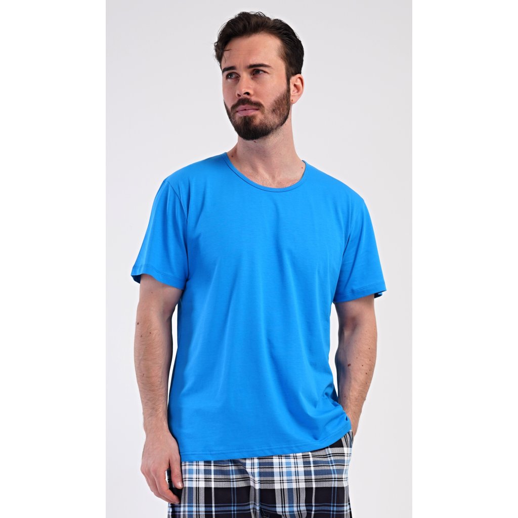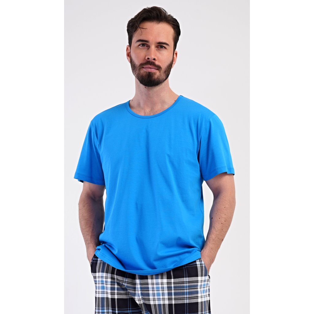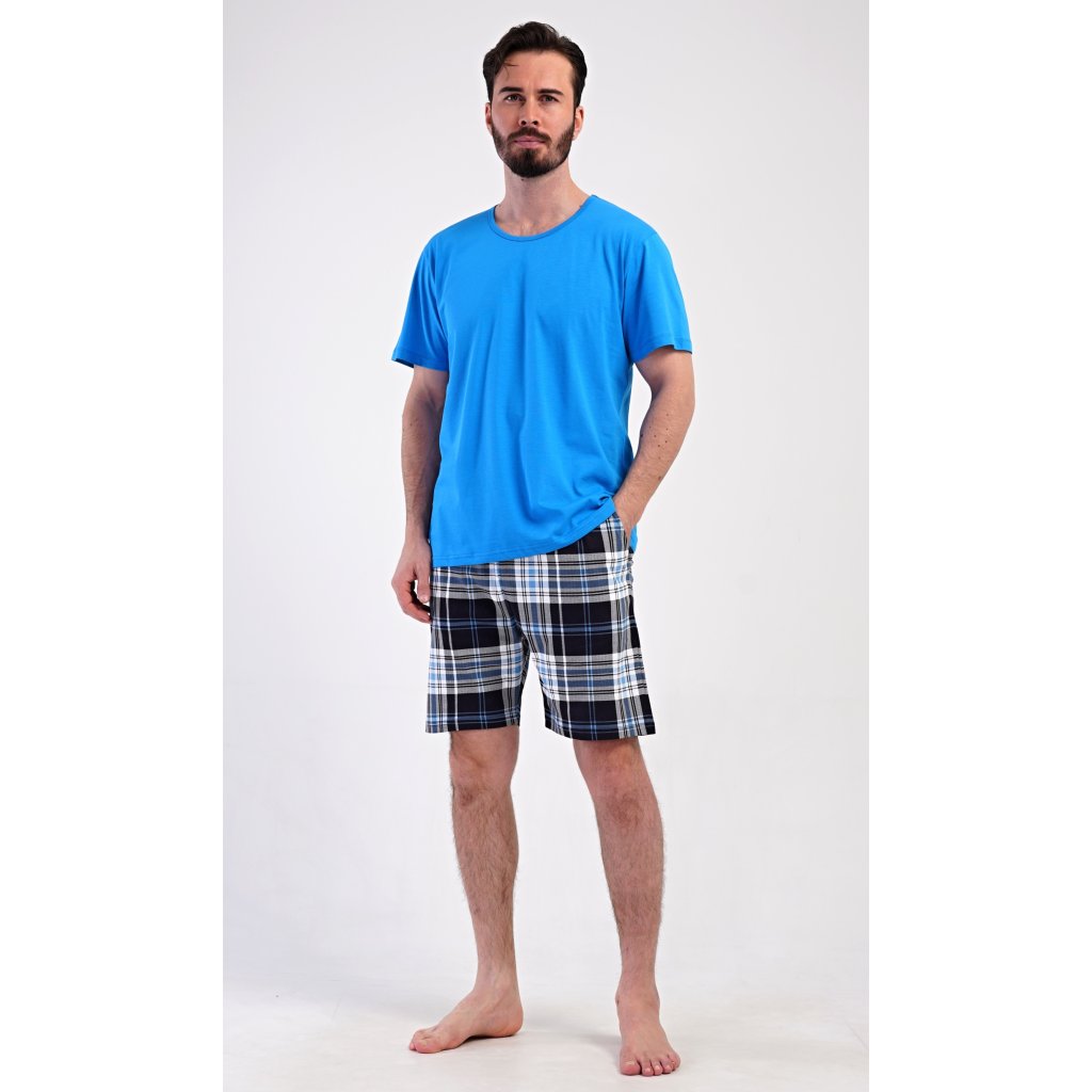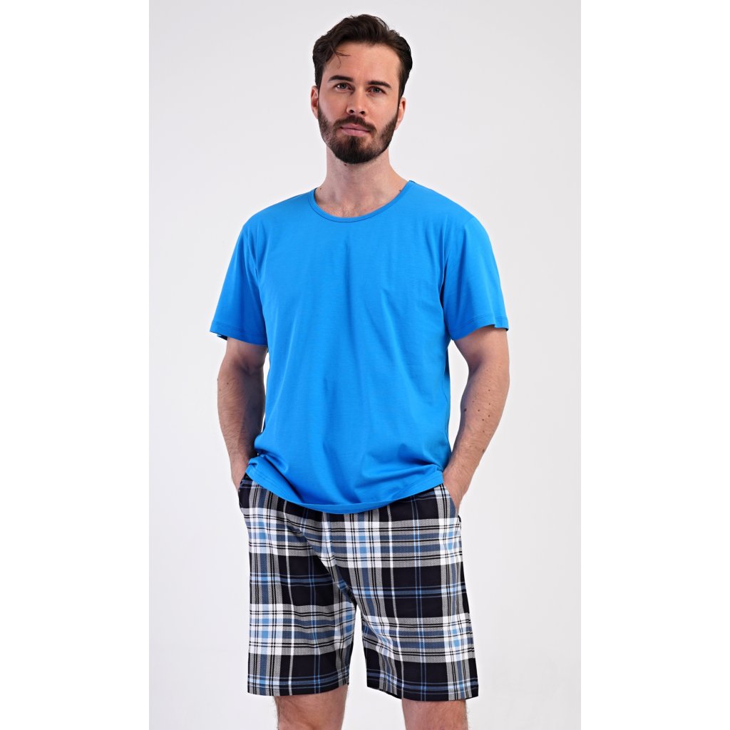 Pánské bavlněné šortkové pyžamo Henry. Pánské pyžamo se skládá z trička s krátkým rukávem a krátkých šortkových kalhot. Jednobarevné tričko má kulatý výstřih a je vhodné pro všechny milovníky pohodlné módy bez potisku. Tričko doplňují kárované šortky, které mají v pase gumu, šňůrku na stažení a praktické kapsy. Použitý materiál s obsahem bavlny 100% je příjemný a poddajný na dotek.