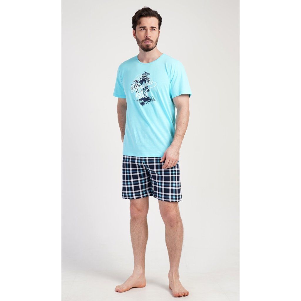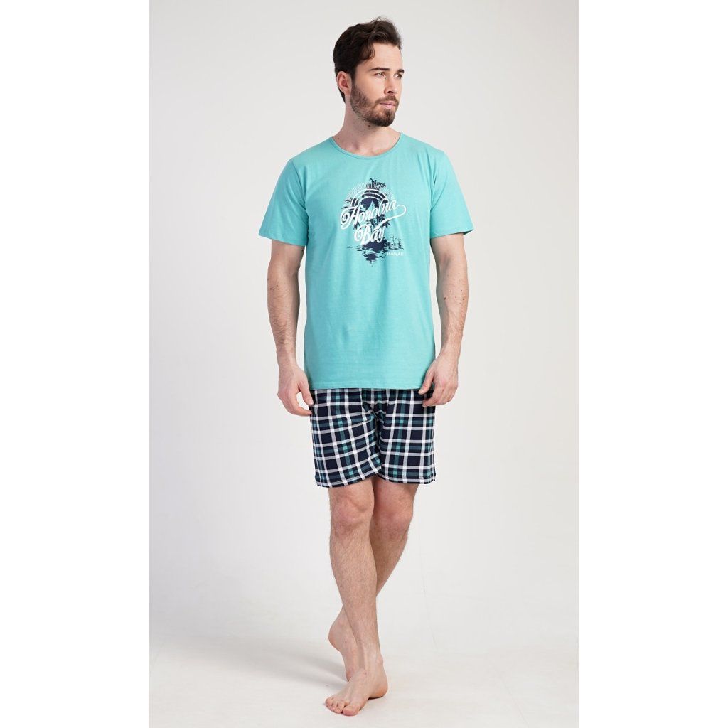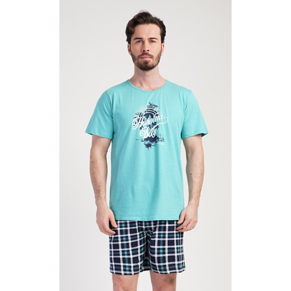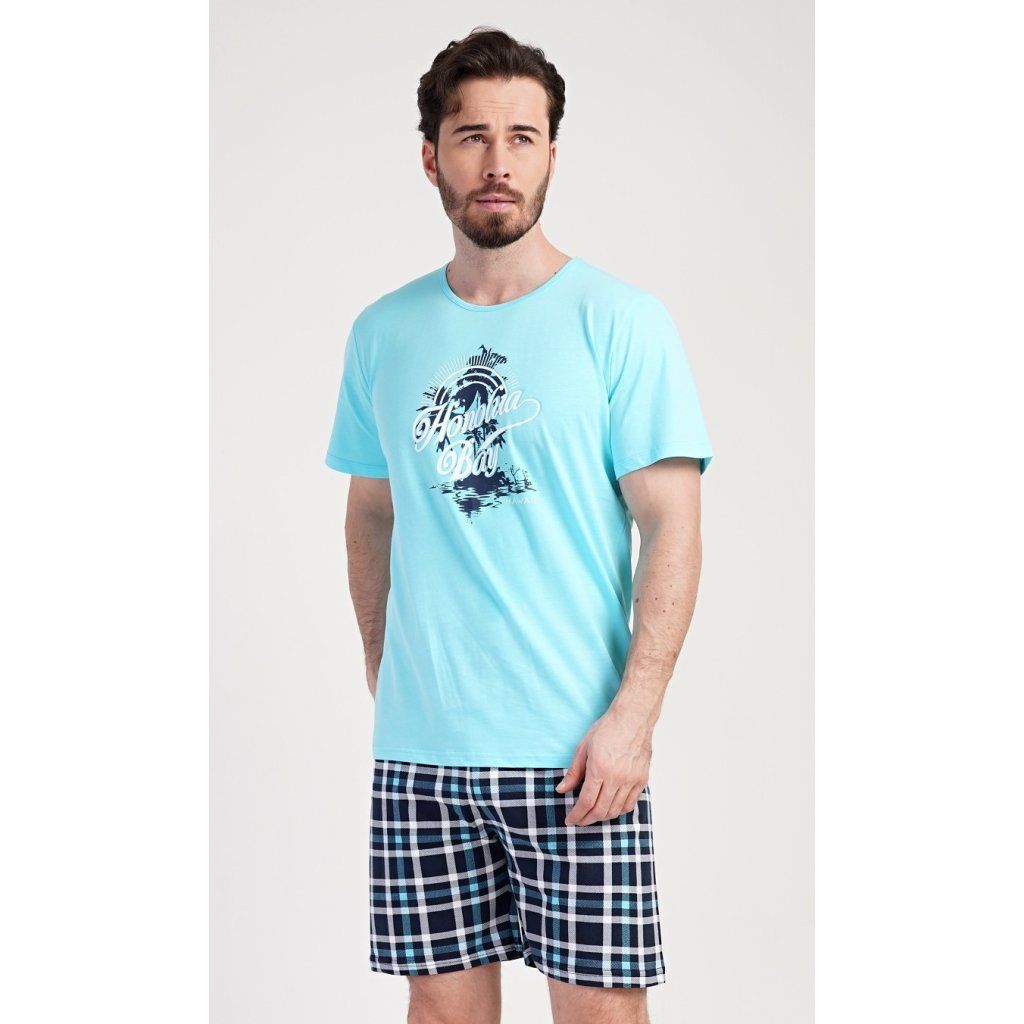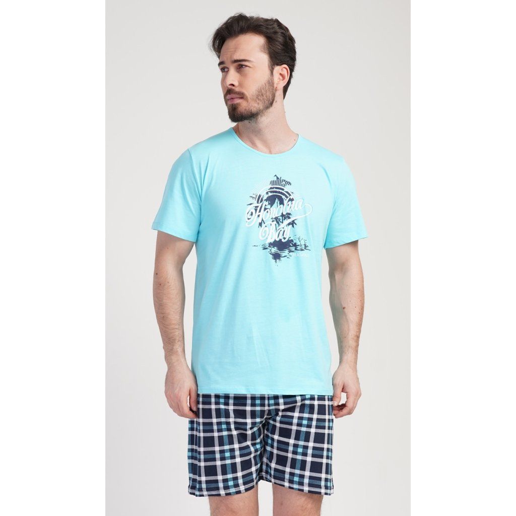 Pánské bavlněné pyžamo šortky Honolua bay. Pánské pyžamo se skládá z trička s krátkým rukávem a krátkých šortkových kalhot. Na tričku je obrázek malého ostrova a nápis 'Honolua bay'. Tričko doplňují kárované šortky, které mají v pase gumu a šňůrku na stažení, nemají kapsy. Použitý materiál s obsahem bavlny 100% je příjemný a poddajný na dotek.
