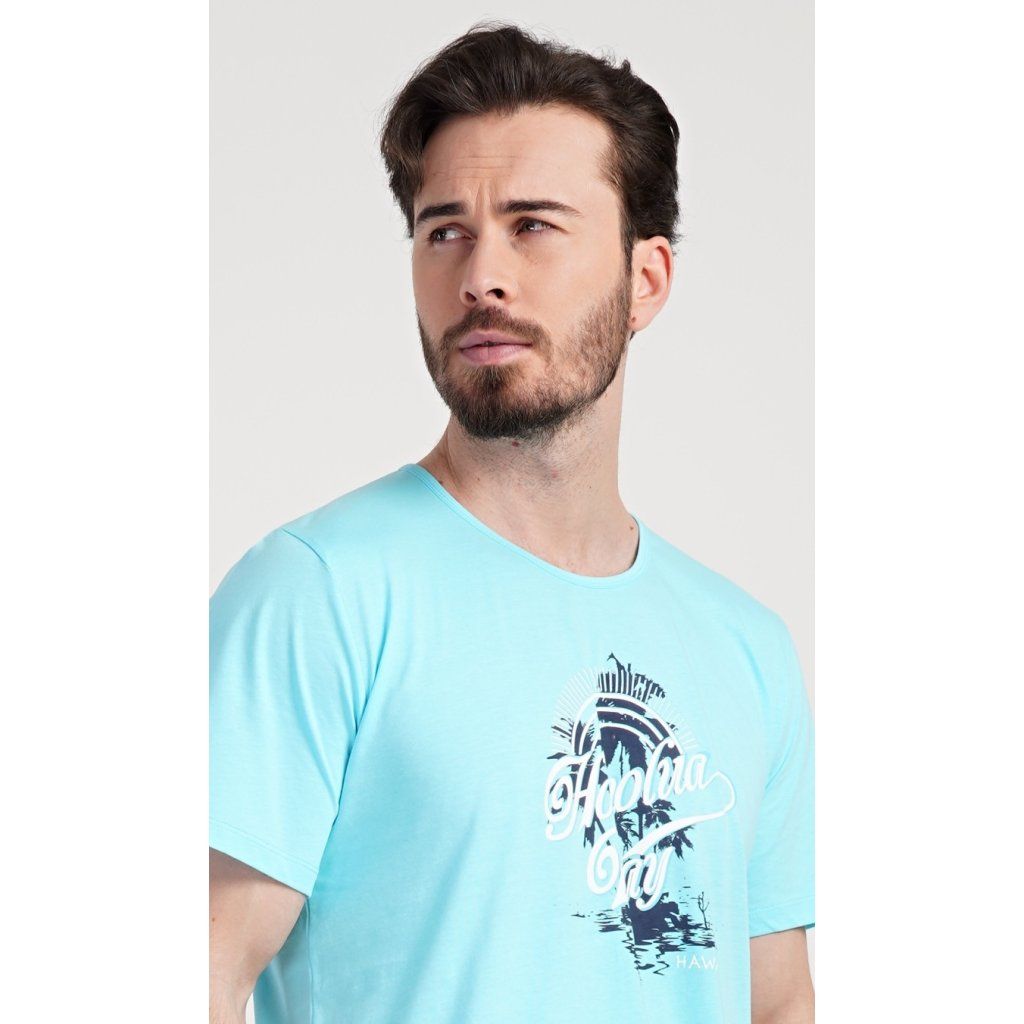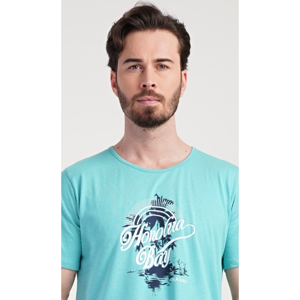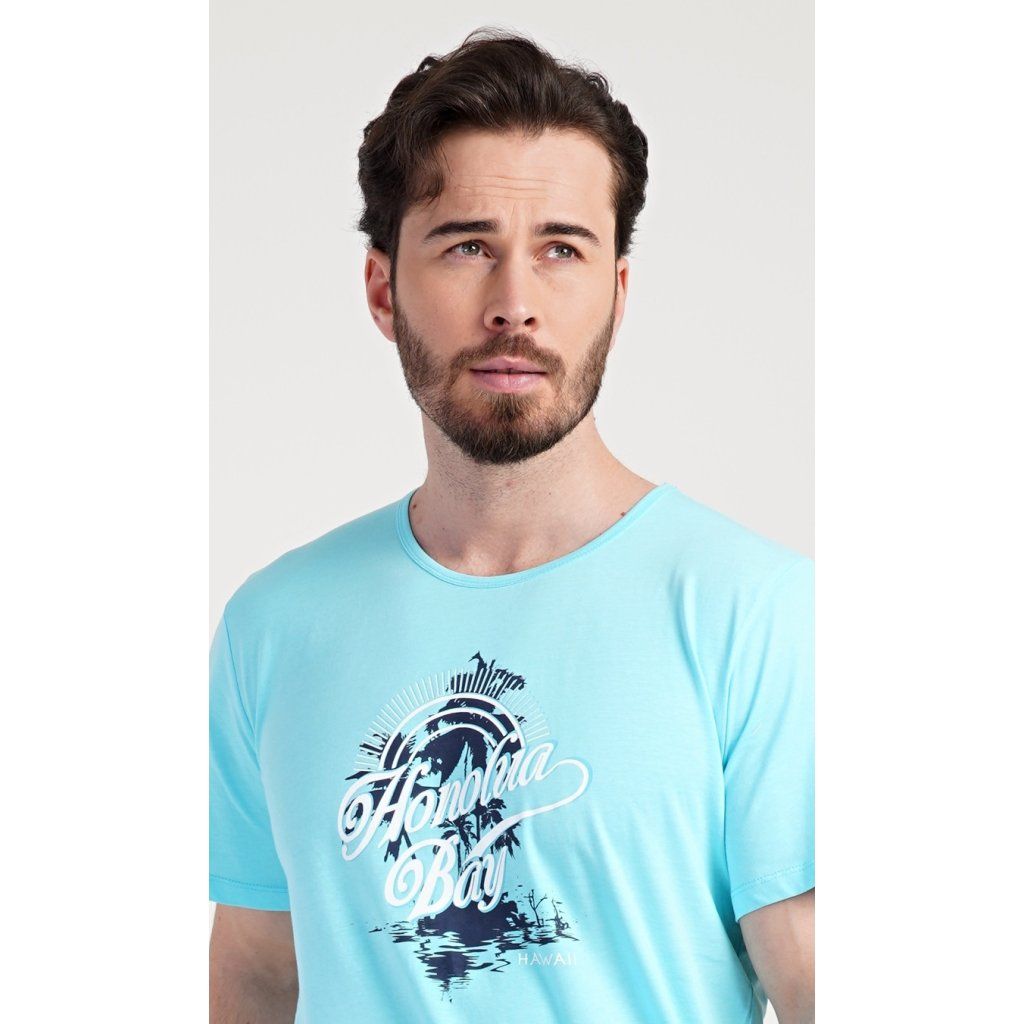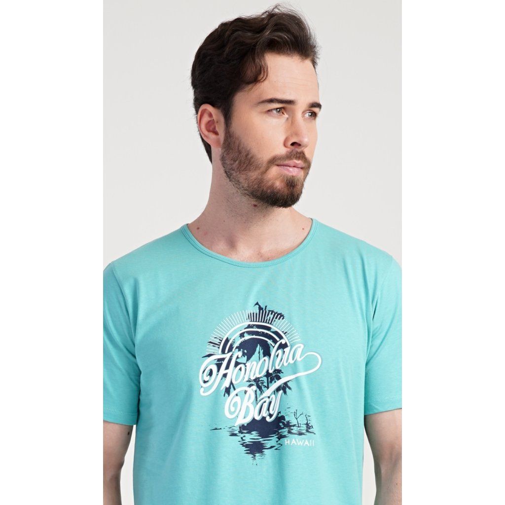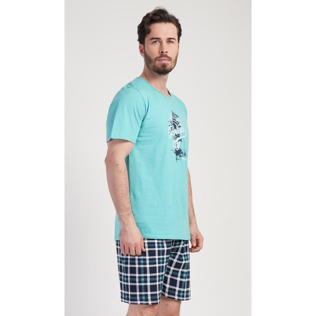 Pánské bavlněné pyžamo šortky Honolua bay. Pánské pyžamo se skládá z trička s krátkým rukávem a krátkých šortkových kalhot. Na tričku je obrázek malého ostrova a nápis 'Honolua bay'. Tričko doplňují kárované šortky, které mají v pase gumu a šňůrku na stažení, nemají kapsy. Použitý materiál s obsahem bavlny 100% je příjemný a poddajný na dotek.