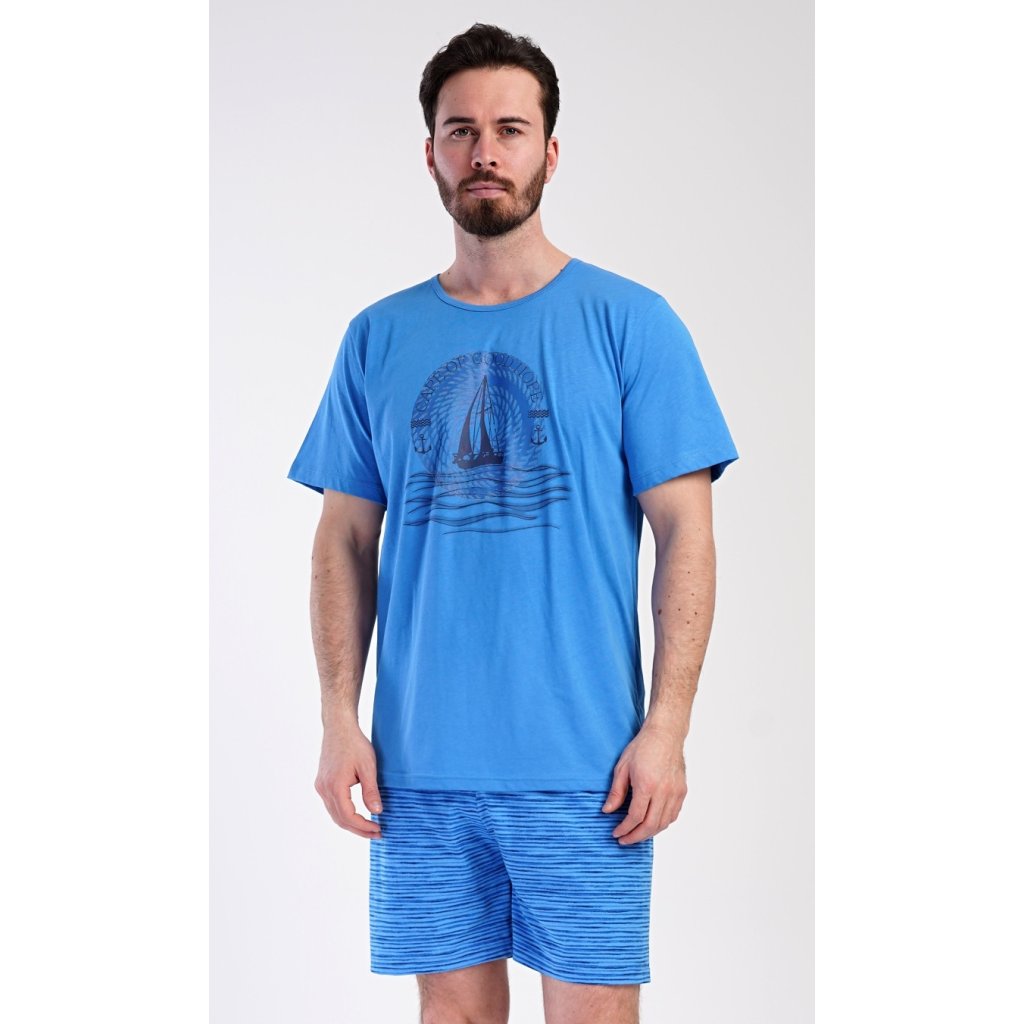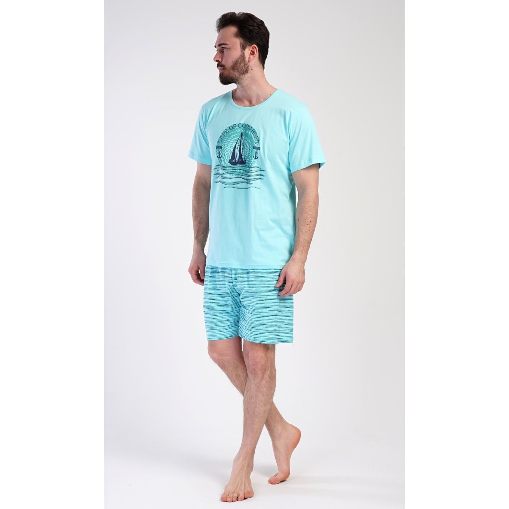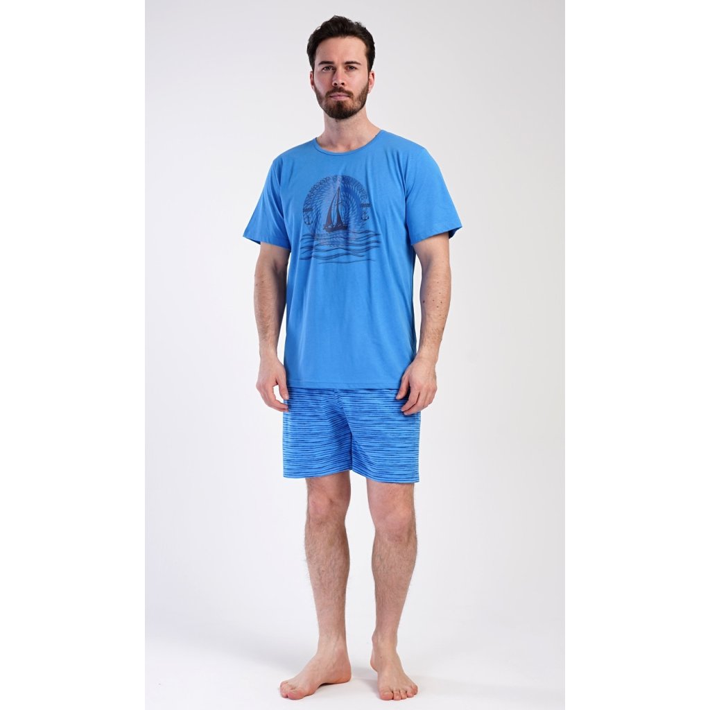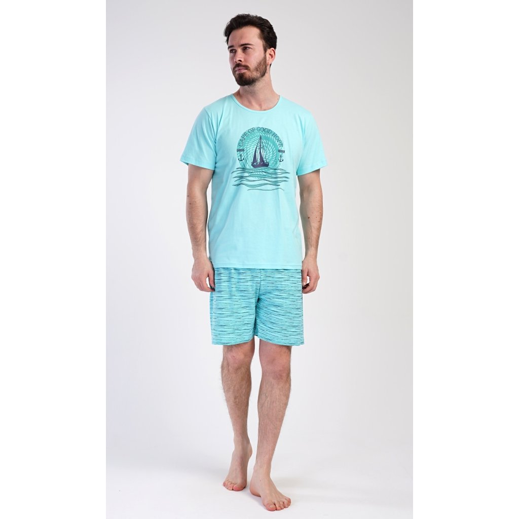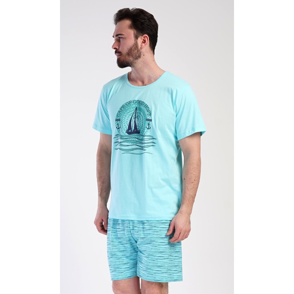 Pánské bavlněné šortkové pyžamo Jachting. Pánské pyžamo se skládá z trička s krátkým rukávem a krátkých šortkových kalhot. Jednobarevné tričko s kulatým výstřihem má na hrudi obrázek plachetnice a nápis 'Cape of good hope'. Tričko doplňují šortky s potiskem zvlněných proužků, které mají v pase gumu a šňůrku na stažení, nemají kapsy. Použitý materiál s obsahem bavlny 100% je příjemný a poddajný na dotek.