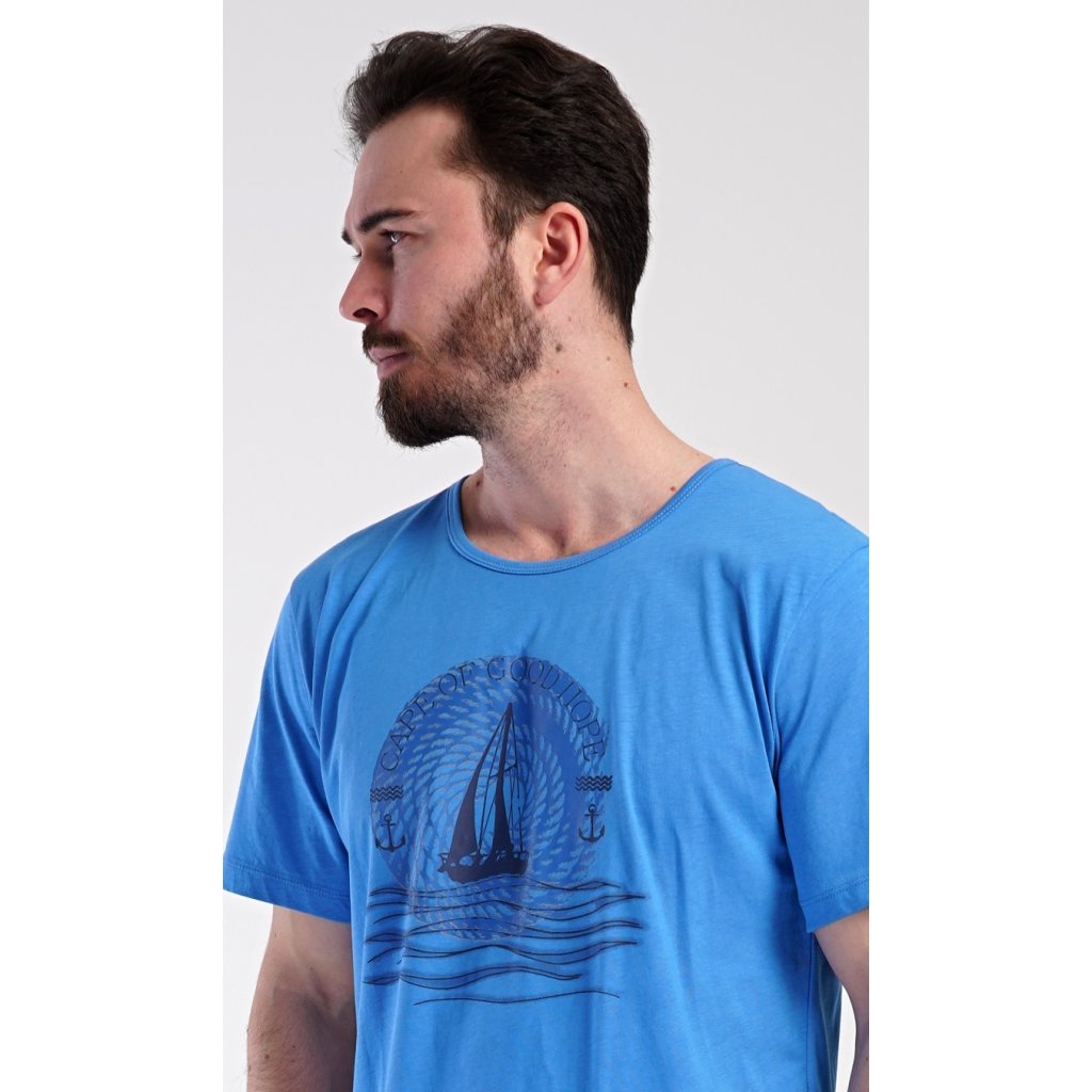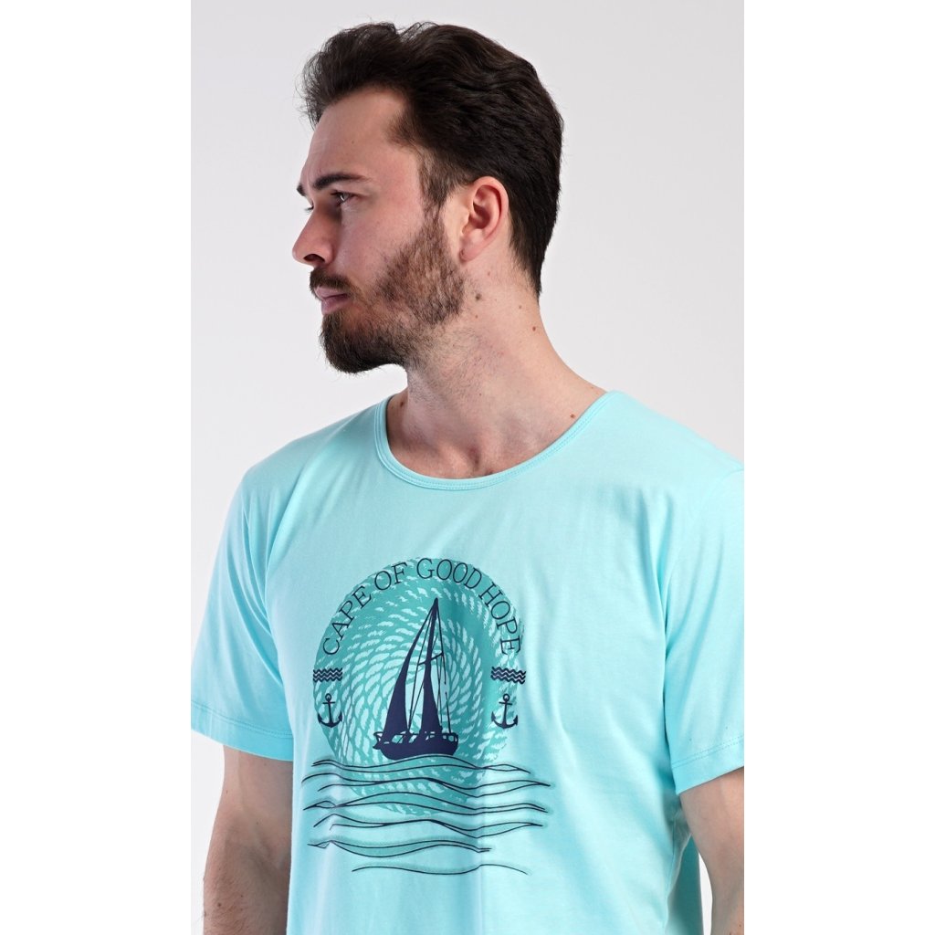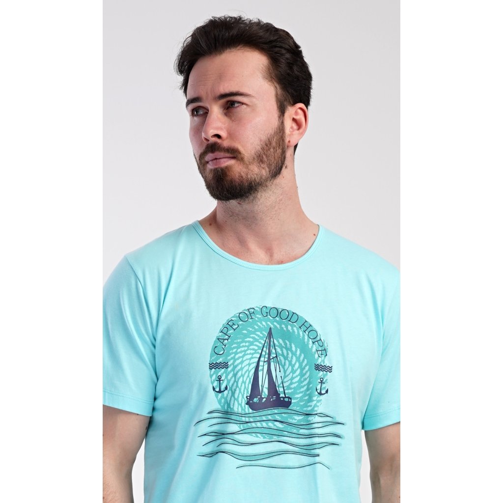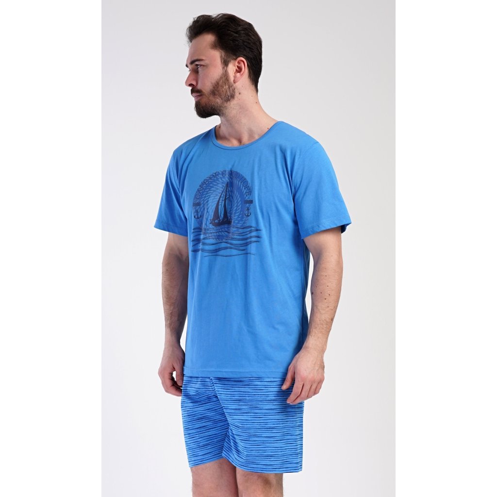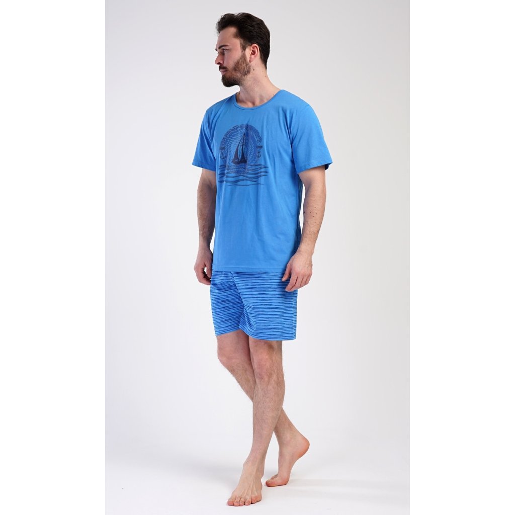 Pánské bavlněné šortkové pyžamo Jachting. Pánské pyžamo se skládá z trička s krátkým rukávem a krátkých šortkových kalhot. Jednobarevné tričko s kulatým výstřihem má na hrudi obrázek plachetnice a nápis 'Cape of good hope'. Tričko doplňují šortky s potiskem zvlněných proužků, které mají v pase gumu a šňůrku na stažení, nemají kapsy. Použitý materiál s obsahem bavlny 100% je příjemný a poddajný na dotek.