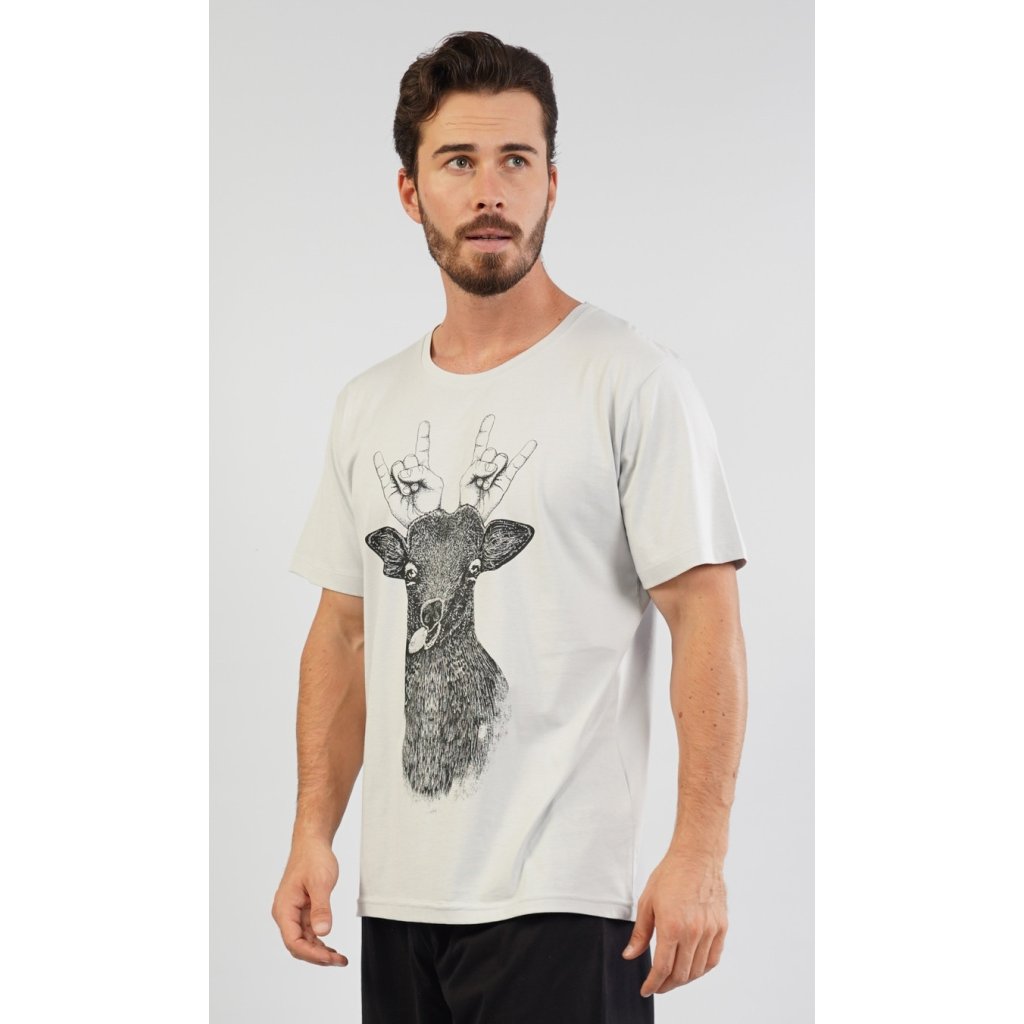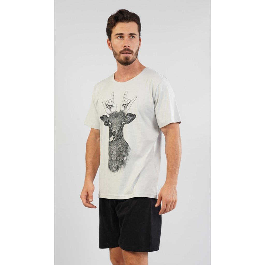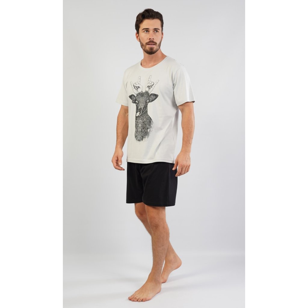 Pánské bavlněné pyžamo šortky Jelen. Pánské pyžamo se skládá z trička s krátkým rukávem a krátkých šortkových kalhot. Na jednobarevném tričku je vtipný obrázek jelena s lidskýma rukama místo paroží. Kostkované kalhoty jsou bez kapes, mají gumu a šňůrku na stažení. Použitý materiál je příjemný a poddajný na dotek.
