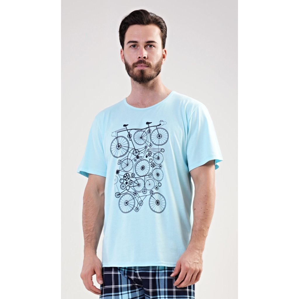 Pánské bavlněné pyžamo šortky Kolo. Pánské pyžamo se skládá z trička s krátkým rukávem a krátkých šortkových kalhot. Na tričku je obrázek kola v několika opakováních. Tričko doplňují kárované šortky, které mají v pase gumu a šňůrku na stažení. Nemají kapsy. Použitý materiál s obsahem bavlny 100% je příjemný a poddajný na dotek.