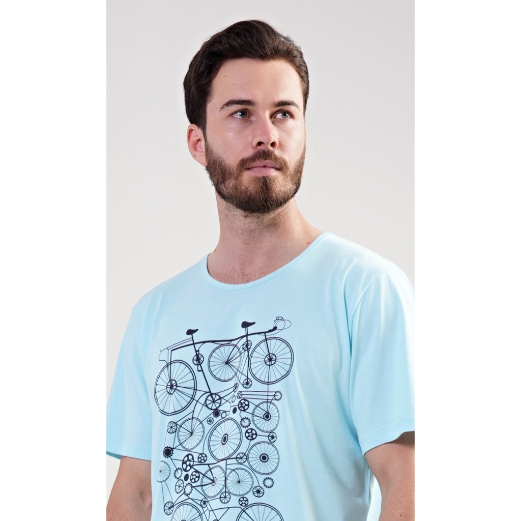 Pánské bavlněné pyžamo šortky Kolo. Pánské pyžamo se skládá z trička s krátkým rukávem a krátkých šortkových kalhot. Na tričku je obrázek kola v několika opakováních. Tričko doplňují kárované šortky, které mají v pase gumu a šňůrku na stažení. Nemají kapsy. Použitý materiál s obsahem bavlny 100% je příjemný a poddajný na dotek.