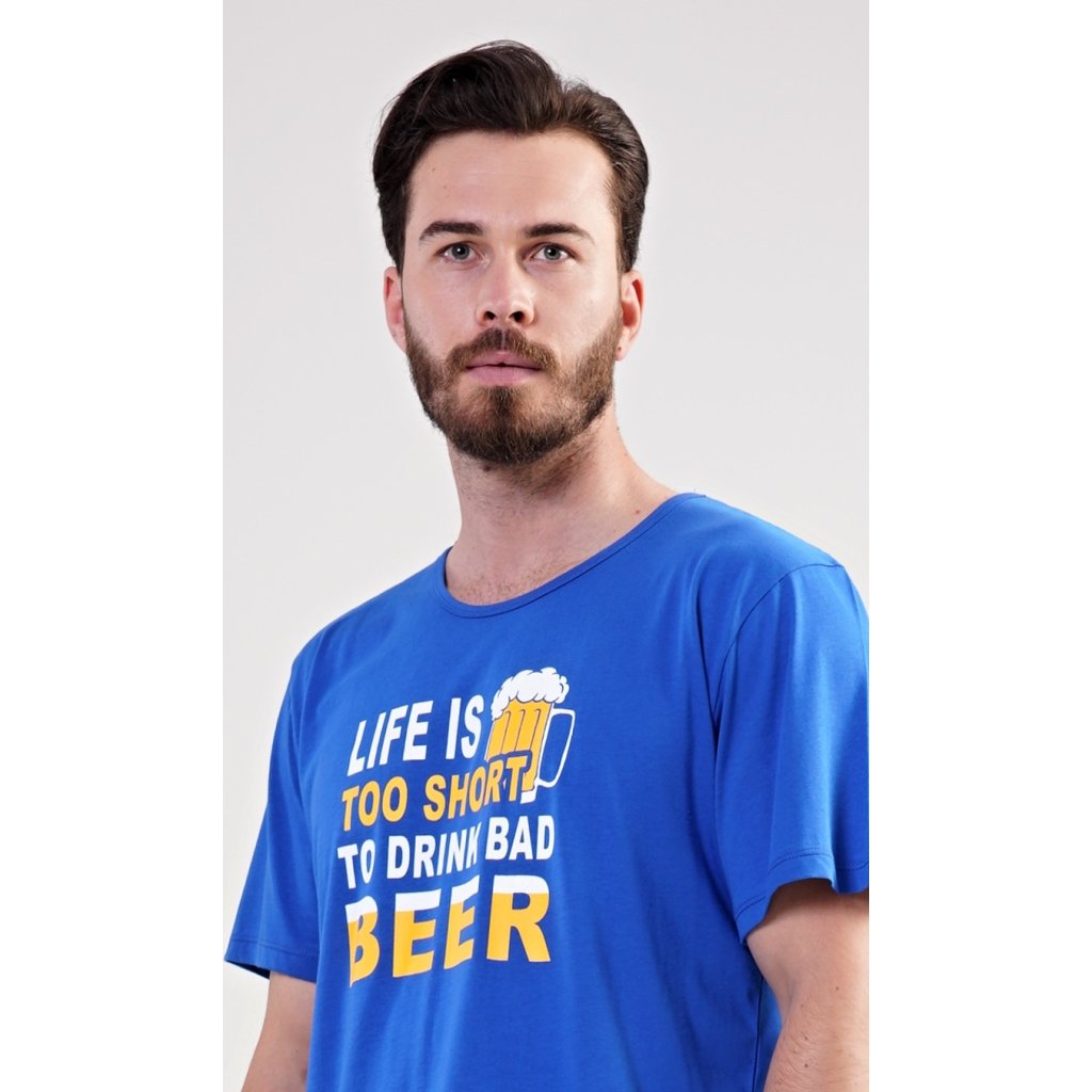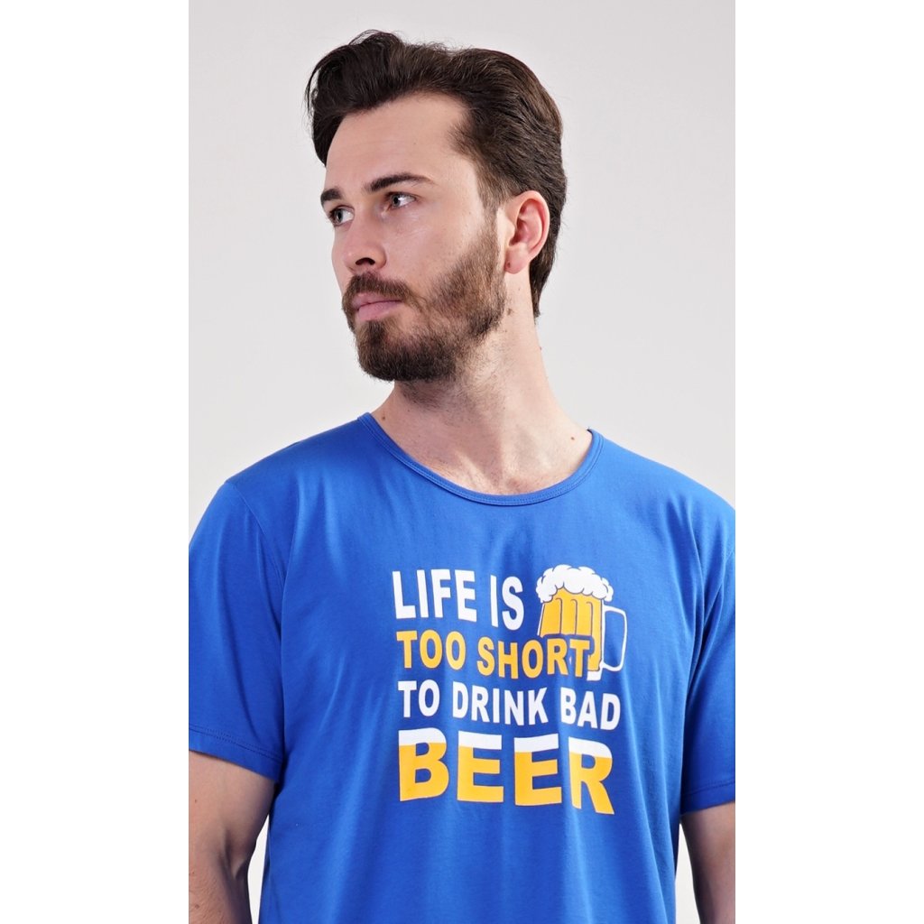 Pánské bavlněné pyžamo šotky Life is beer. Pánské pyžamo se skládá z trička s krátkým rukávem a krátkých šortkových kalhot. Na tričku je nápis Life is too short to drink bad beer. Výrazné tričko vhodně doplňují kostkované kalhoty. Šortky jsou bez kapes, mají gumu a šňůrku na stažení. Použitý materiál s podílem bavlny 100% je příjemný a poddajný na dotek. Pyžamo je vhodné i na denní nošení.