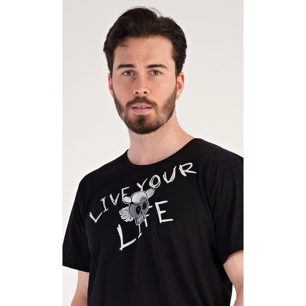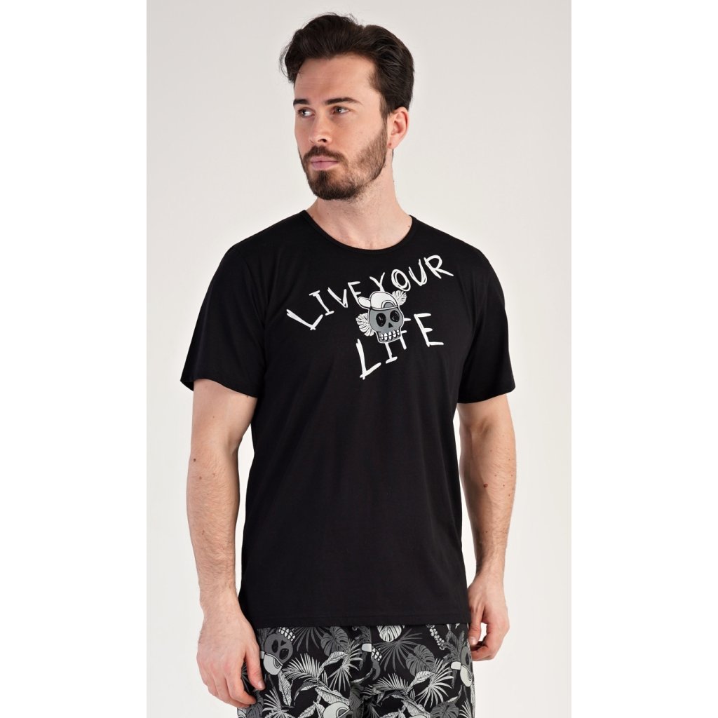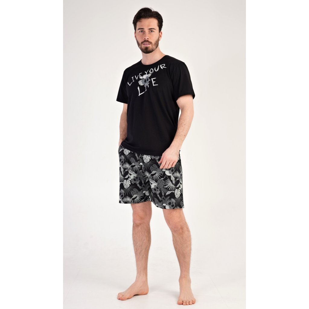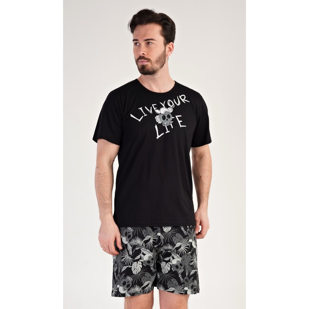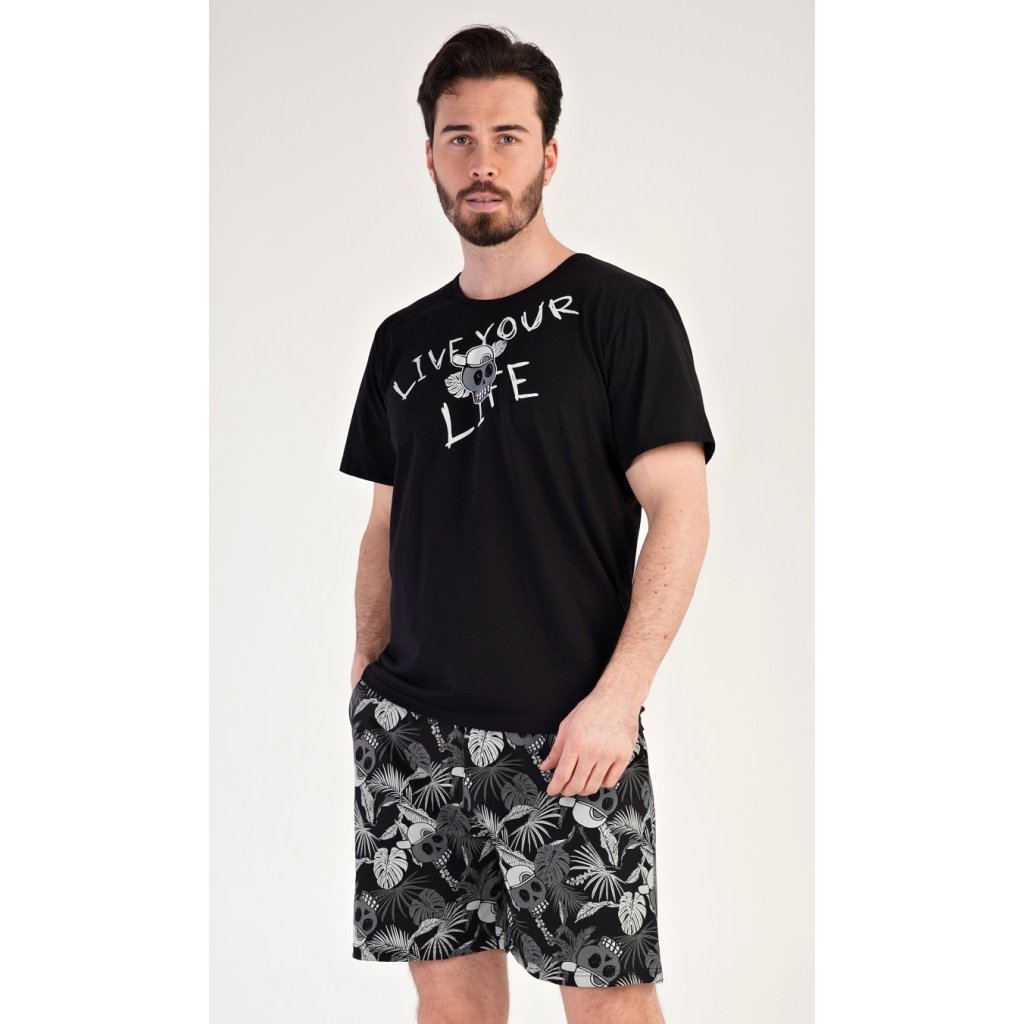 Pánské bavlněné pyžamo šortky Live your life. Pánské pyžamo se skládá z trička s krátkým rukávem a krátkých šortkových kalhot. Na jednobarevném tričku je obrázek lebky a nápis 'Live your life'. Tričko doplňují šortky potištěné lebkami. Šortky mají v pase gumu, šňůrku ke stažení a praktické kapsy. Použitý materiál je příjemný a poddajný na dotek. Pyžamo je vhodné i na denní nošení.