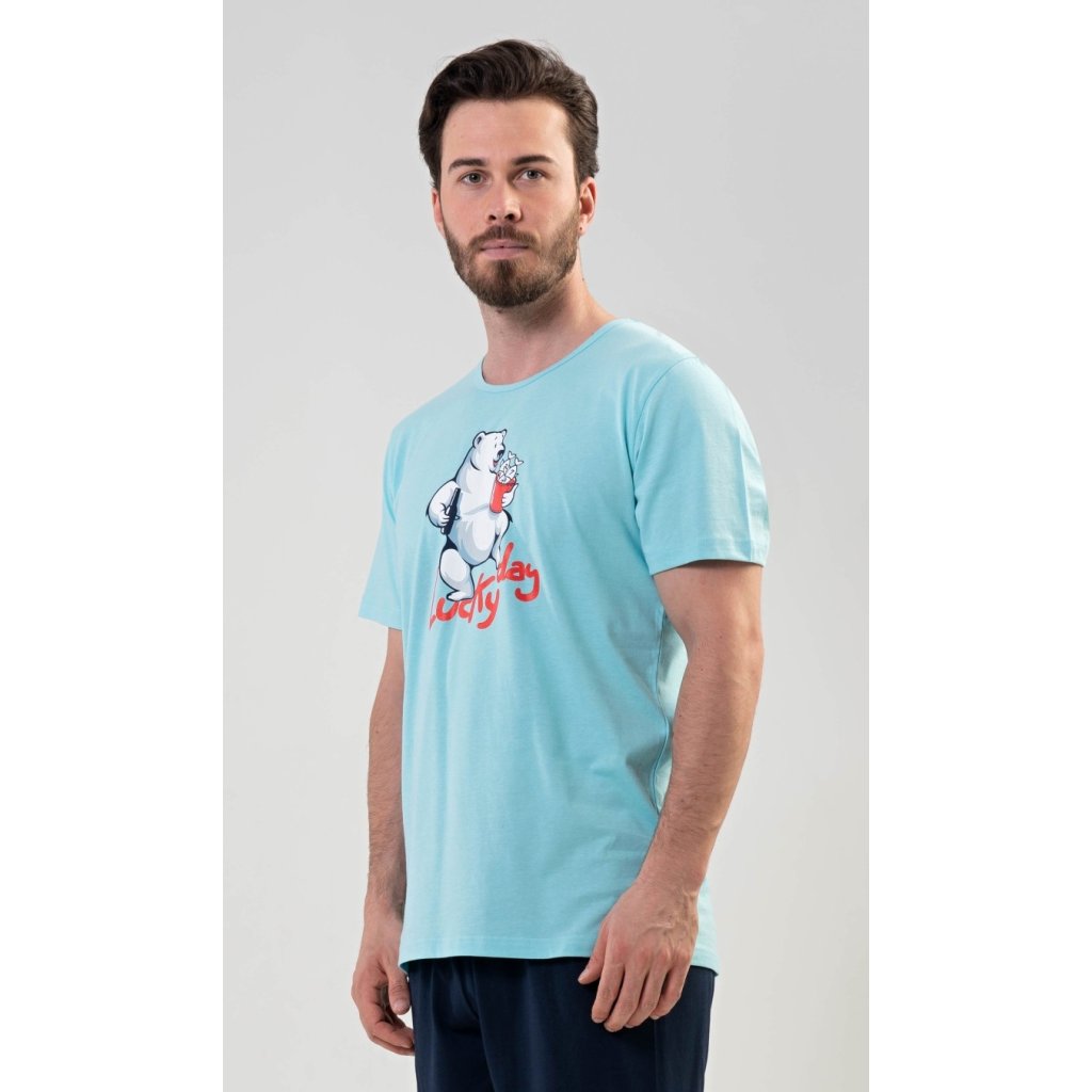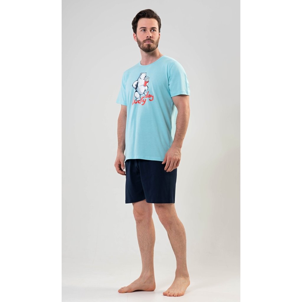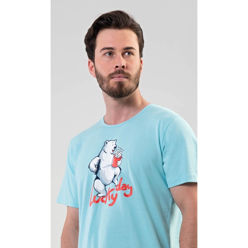 Pánské bavlněné pyžamo šortky Lucky day. Pánské pyžamo se skládá z trička s krátkým rukávem a krátkých šortkových kalhot. Na jednobarevném tričku s kulatým výstřihem je nápis LUCKY DAY a obrázek veselého ledního medvěda. Tričko doplňují jednobarevné šortky, které mají v pase gumu a šňůrku ke stažení. Nemají kapsy. Použitý materiál je příjemný a poddajný na dotek. Podíl bavlny u trička a šortek je 100%. Pyžamo je vhodné i na denní nošení.
