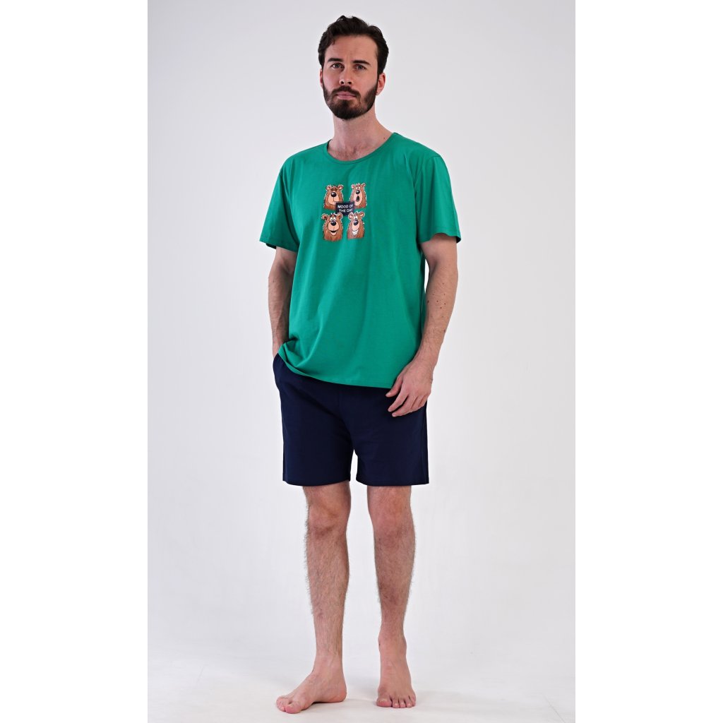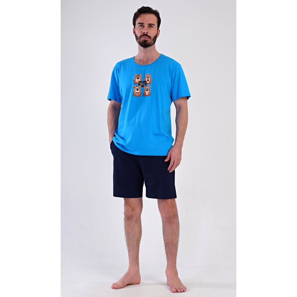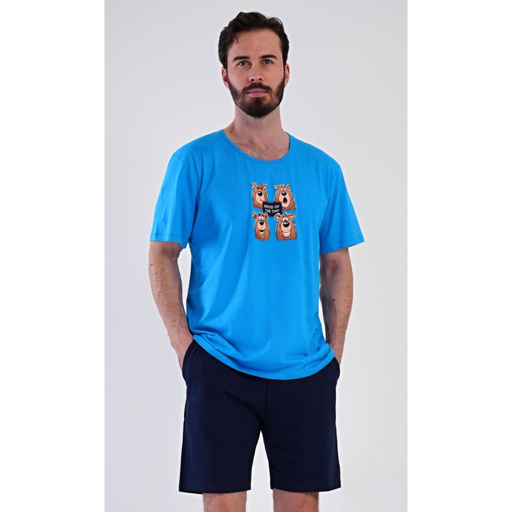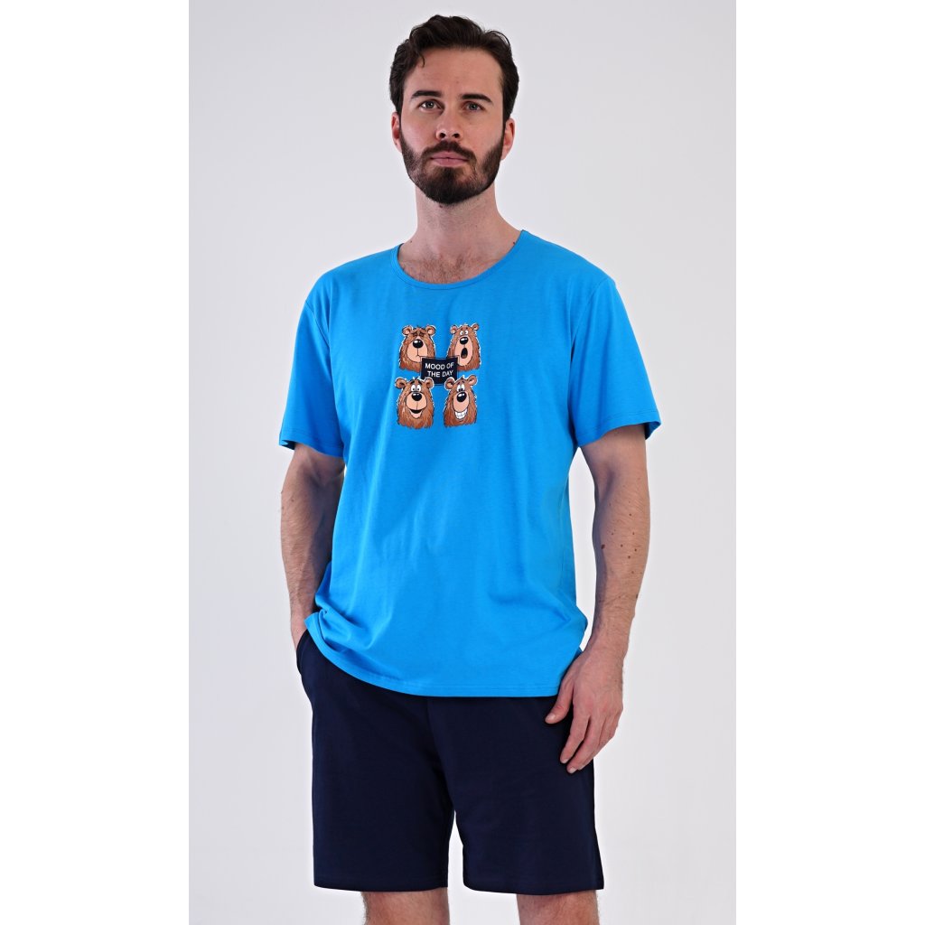 Pánské bavlněné šortkové pyžamo Méďa Happy. Pánské pyžamo se skládá z trička s krátkým rukávem a krátkých šortkových kalhot. Na jednobarevném tričku je obrázek medvěda, jehož výraz se mění v průběhu (pracovního) dne. Šortky mají praktické kapsy, v pase gumu a šňůrku na stáhnutí. Použitý materiál s podílem bavlny 100% je příjemný a poddaný na dotek. Pyžamo je vhodné i na denní nošení a oceníte ho obzvlášť v horkých letních dnech.
