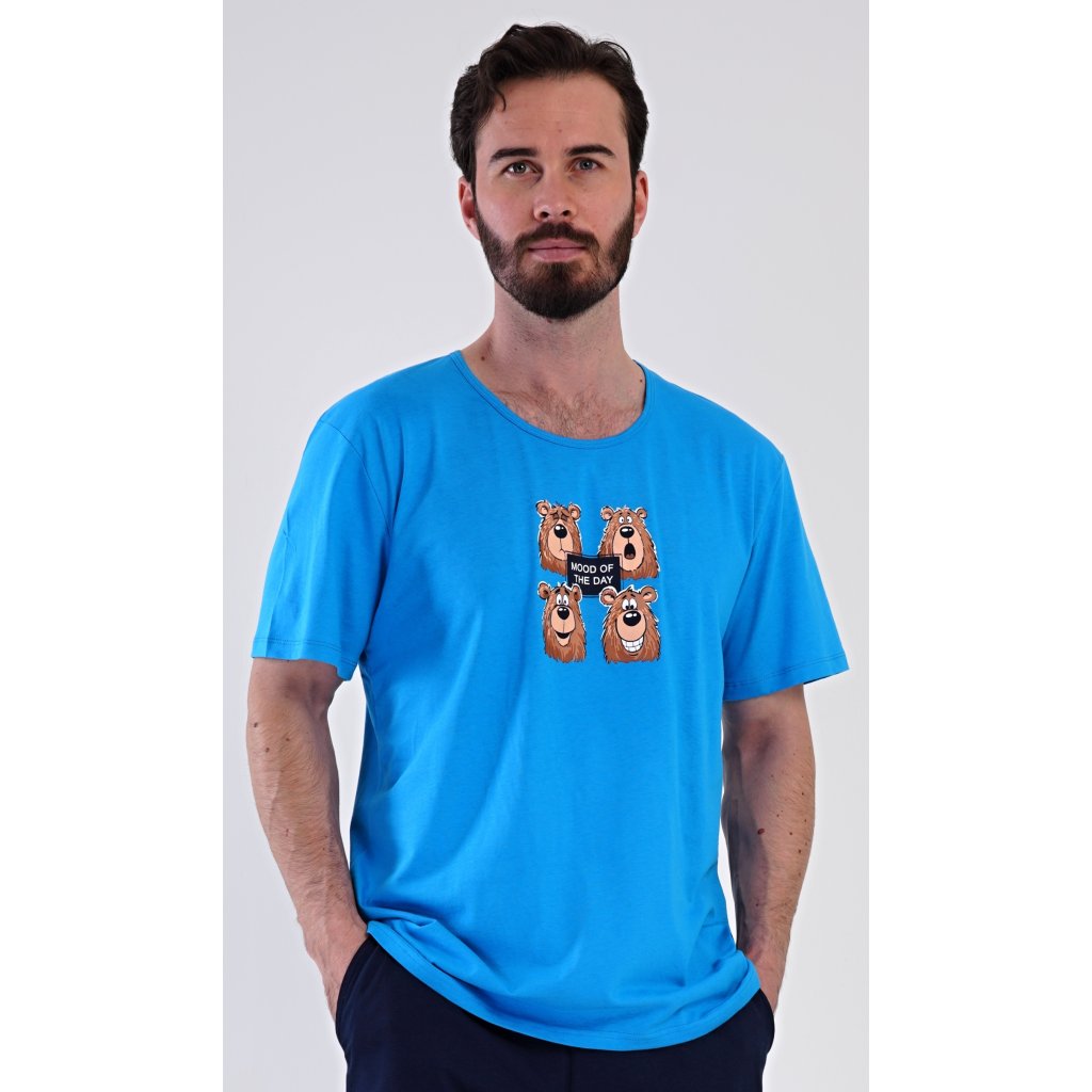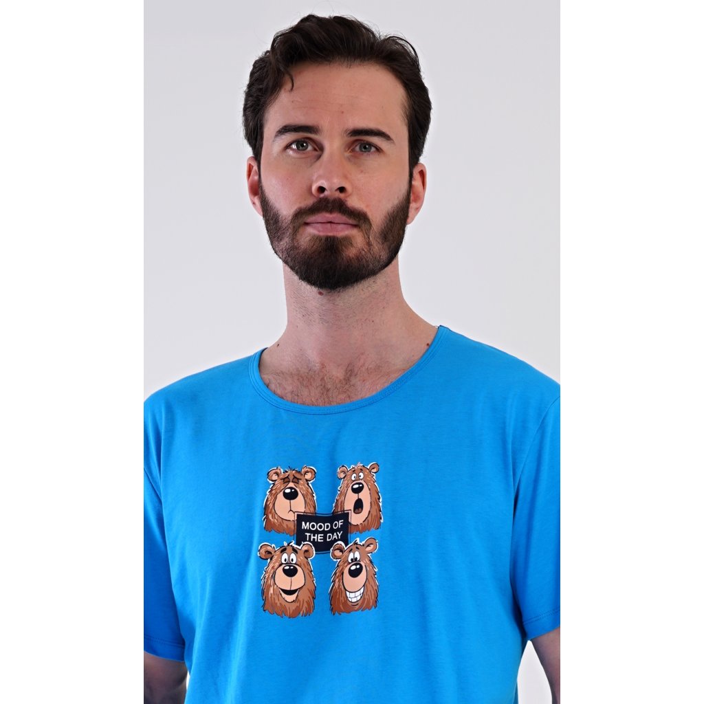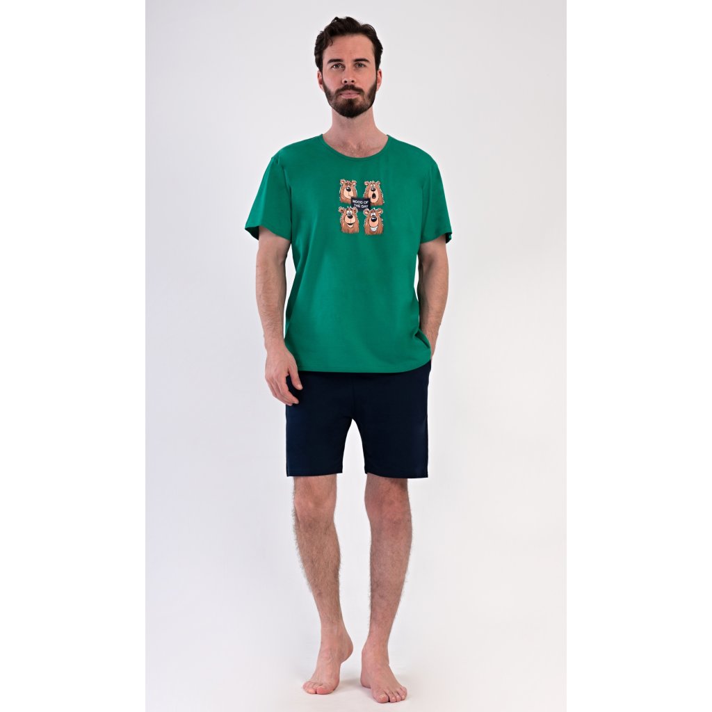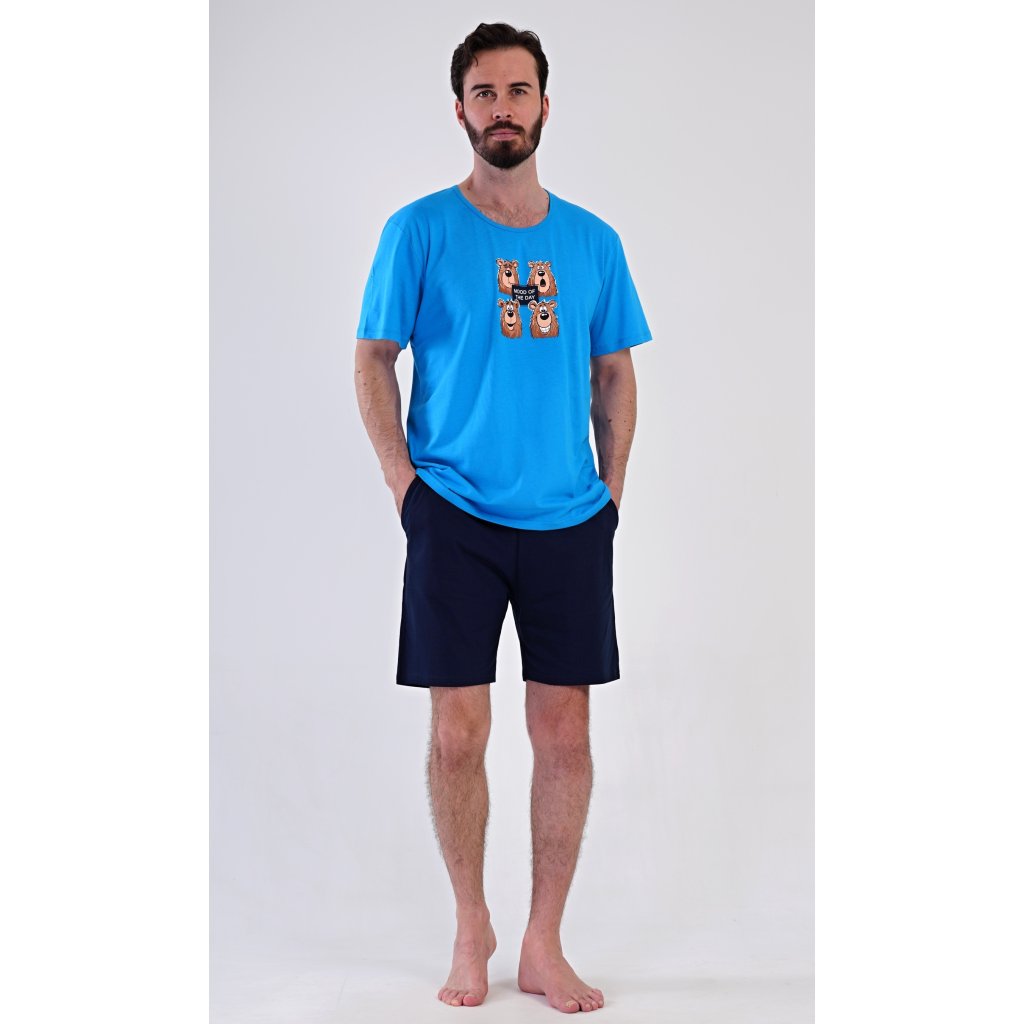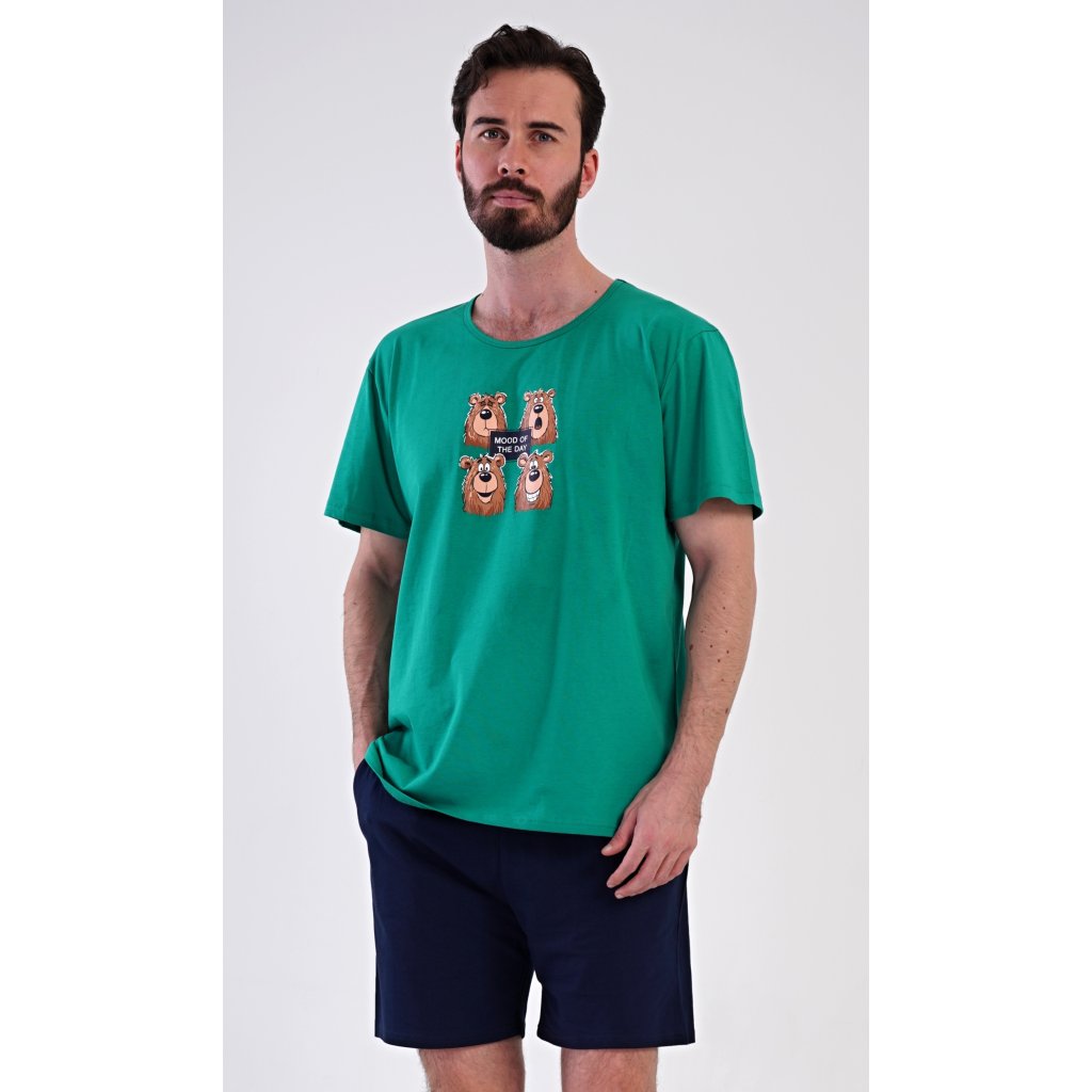 Pánské bavlněné šortkové pyžamo Méďa Happy. Pánské pyžamo se skládá z trička s krátkým rukávem a krátkých šortkových kalhot. Na jednobarevném tričku je obrázek medvěda, jehož výraz se mění v průběhu (pracovního) dne. Šortky mají praktické kapsy, v pase gumu a šňůrku na stáhnutí. Použitý materiál s podílem bavlny 100% je příjemný a poddaný na dotek. Pyžamo je vhodné i na denní nošení a oceníte ho obzvlášť v horkých letních dnech.
