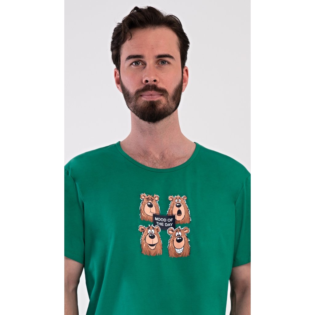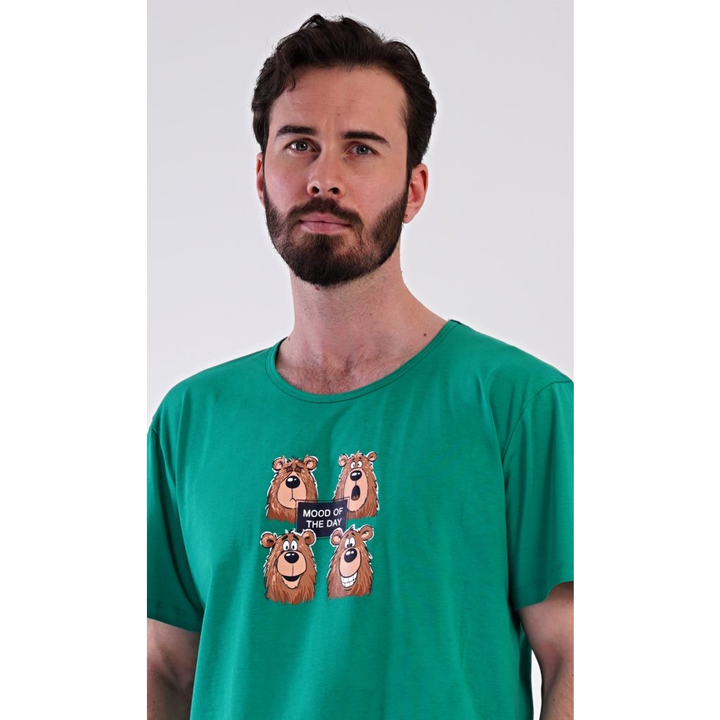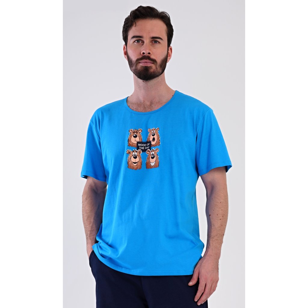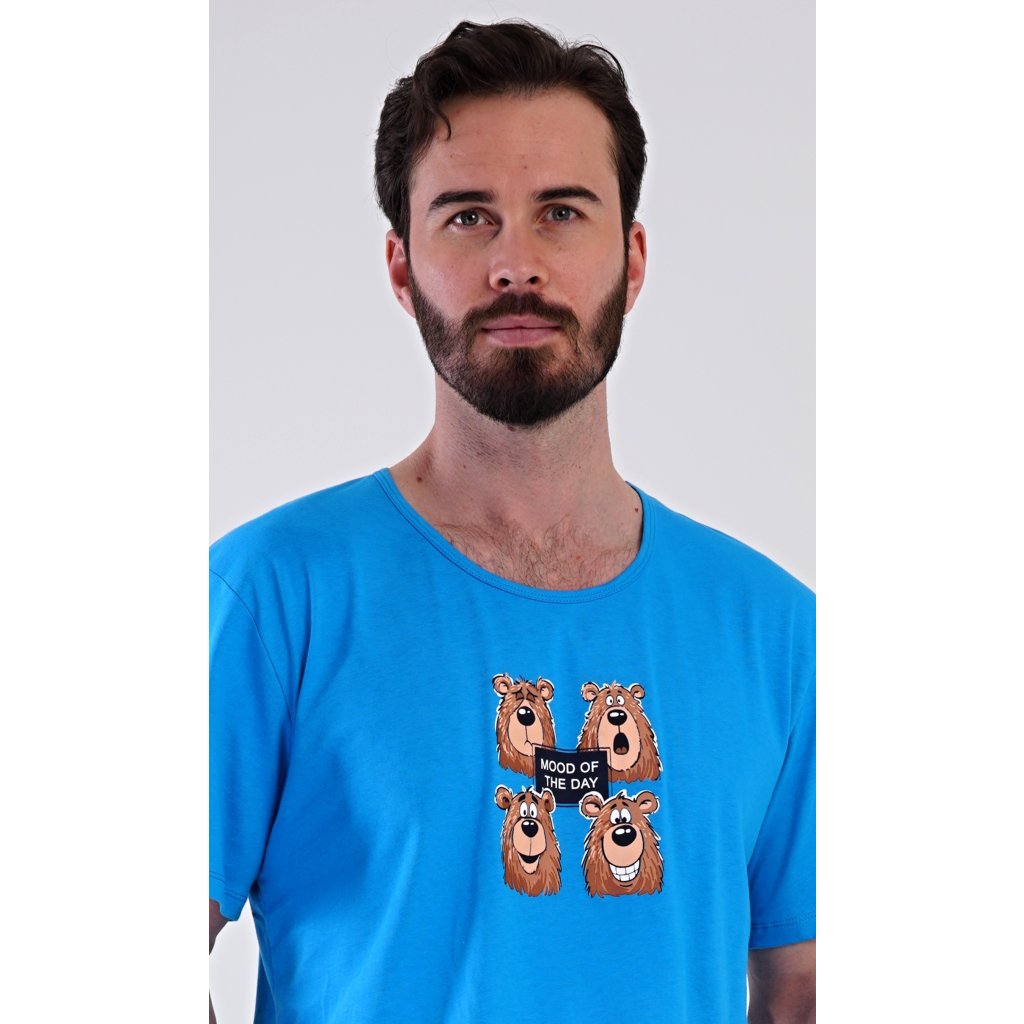 Pánské bavlněné šortkové pyžamo Méďa Happy. Pánské pyžamo se skládá z trička s krátkým rukávem a krátkých šortkových kalhot. Na jednobarevném tričku je obrázek medvěda, jehož výraz se mění v průběhu (pracovního) dne. Šortky mají praktické kapsy, v pase gumu a šňůrku na stáhnutí. Použitý materiál s podílem bavlny 100% je příjemný a poddaný na dotek. Pyžamo je vhodné i na denní nošení a oceníte ho obzvlášť v horkých letních dnech.