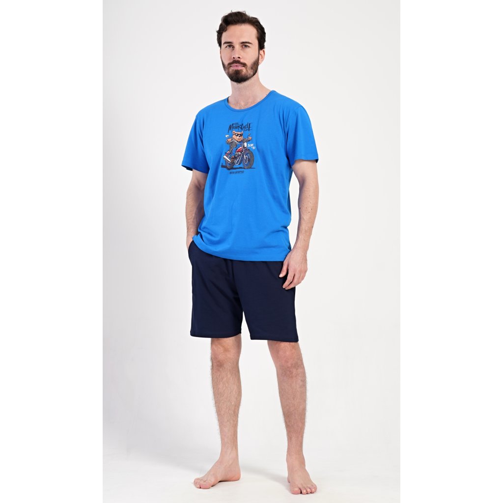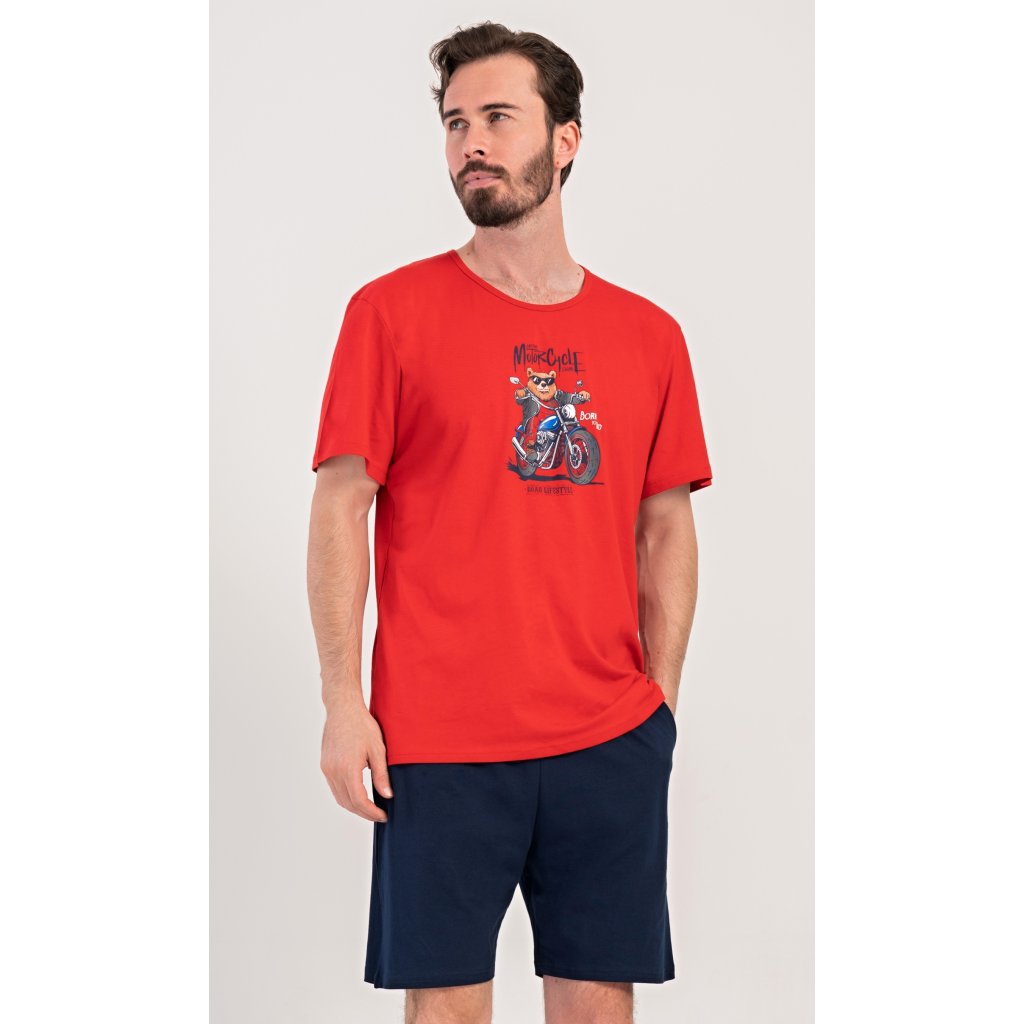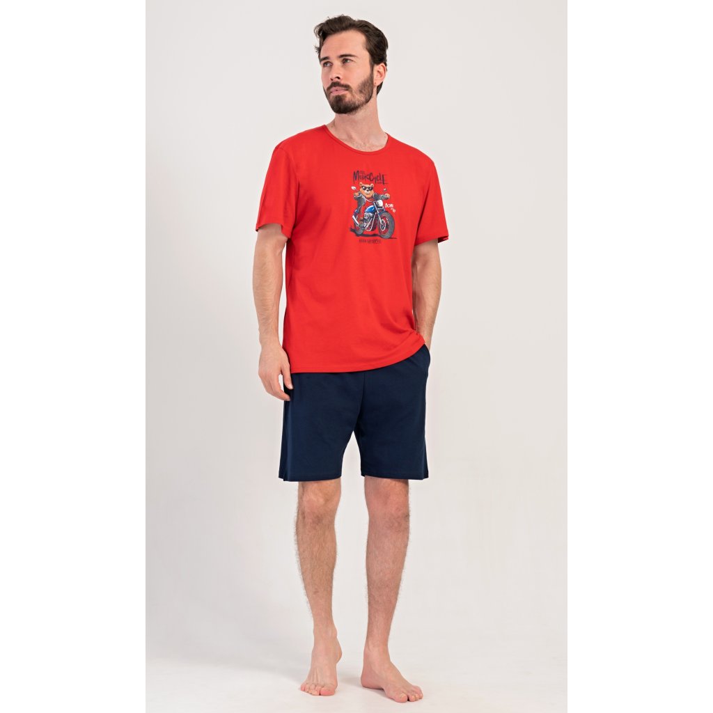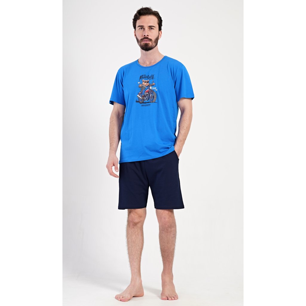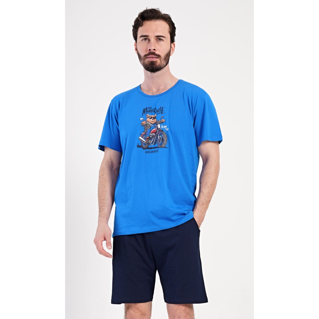 Pánské bavlněné šortkové pyžamo Motorkář. Pánské pyžamo se skládá z trička s krátkým rukávem a krátkých šortkových kalhot. Na jednobarevném tričku je obrázek medvěda na motorce a nápis 'Motorcycle'. Šortky mají praktické kapsy, v pase gumu a šňůrku na stáhnutí. Použitý materiál s podílem bavlny 100% je příjemný a poddaný na dotek. Pyžamo je vhodné i na denní nošení a oceníte ho obzvlášť v horkých letních dnech.