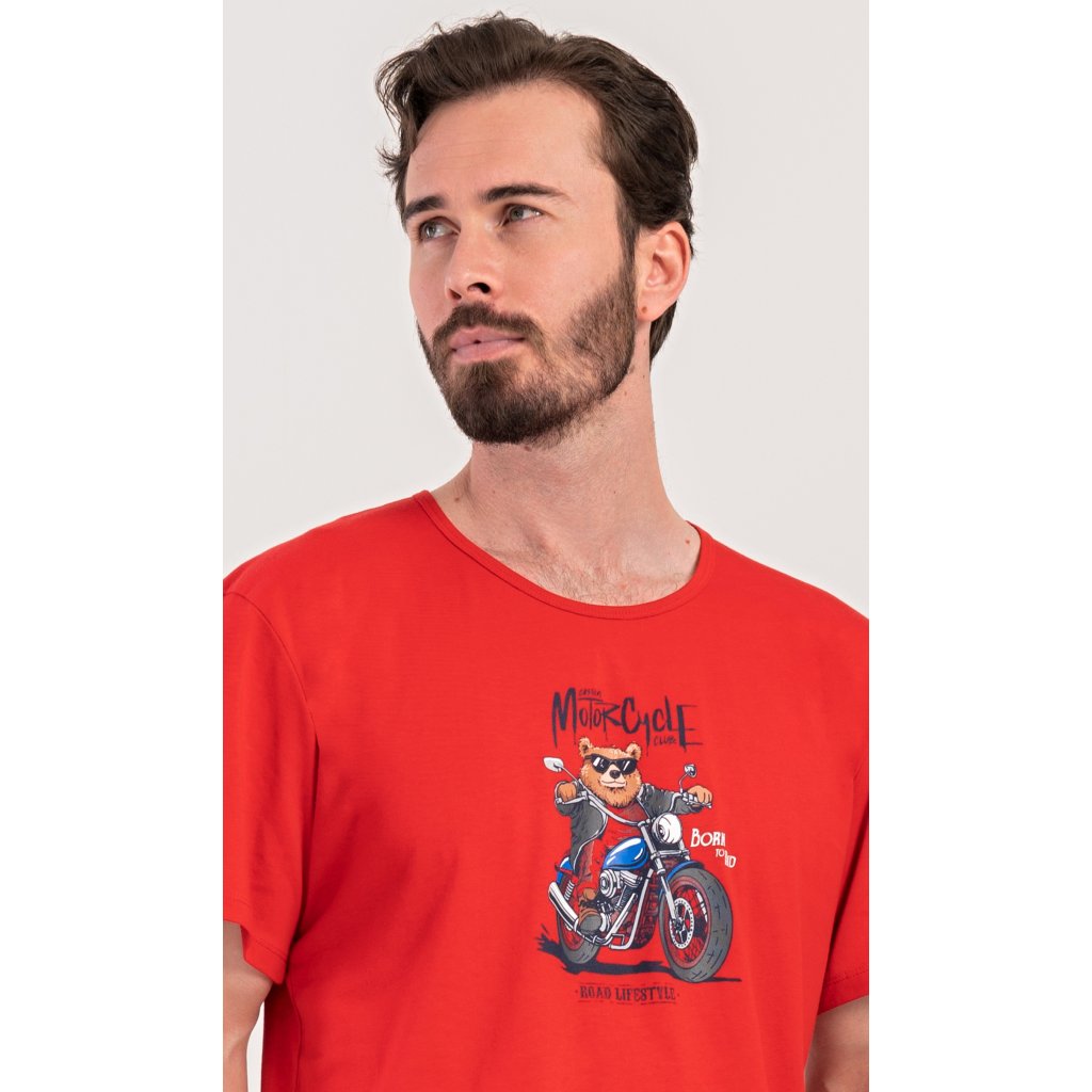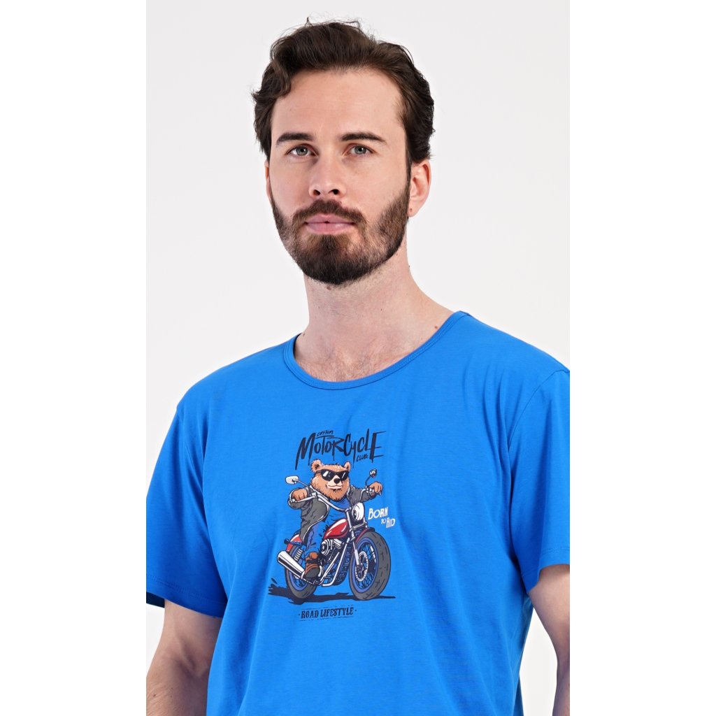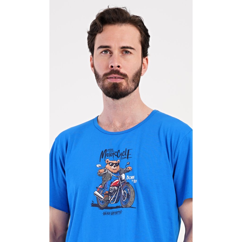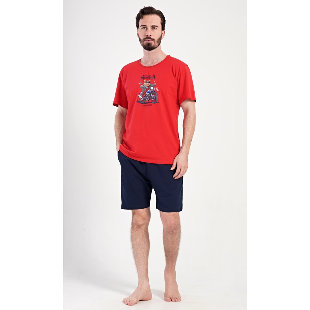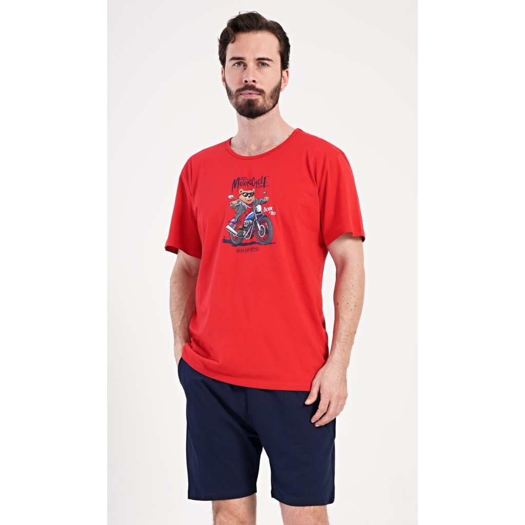 Pánské bavlněné šortkové pyžamo Motorkář. Pánské pyžamo se skládá z trička s krátkým rukávem a krátkých šortkových kalhot. Na jednobarevném tričku je obrázek medvěda na motorce a nápis 'Motorcycle'. Šortky mají praktické kapsy, v pase gumu a šňůrku na stáhnutí. Použitý materiál s podílem bavlny 100% je příjemný a poddaný na dotek. Pyžamo je vhodné i na denní nošení a oceníte ho obzvlášť v horkých letních dnech.