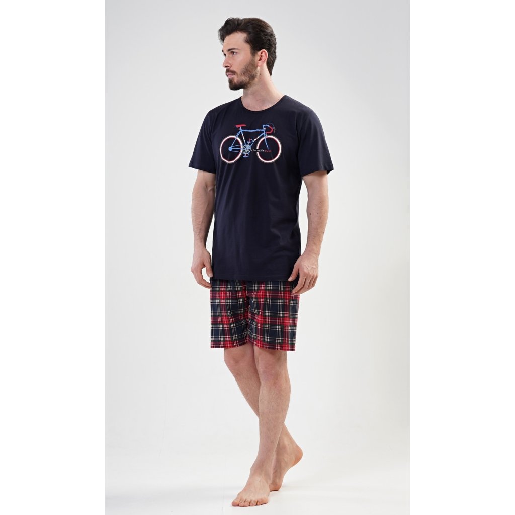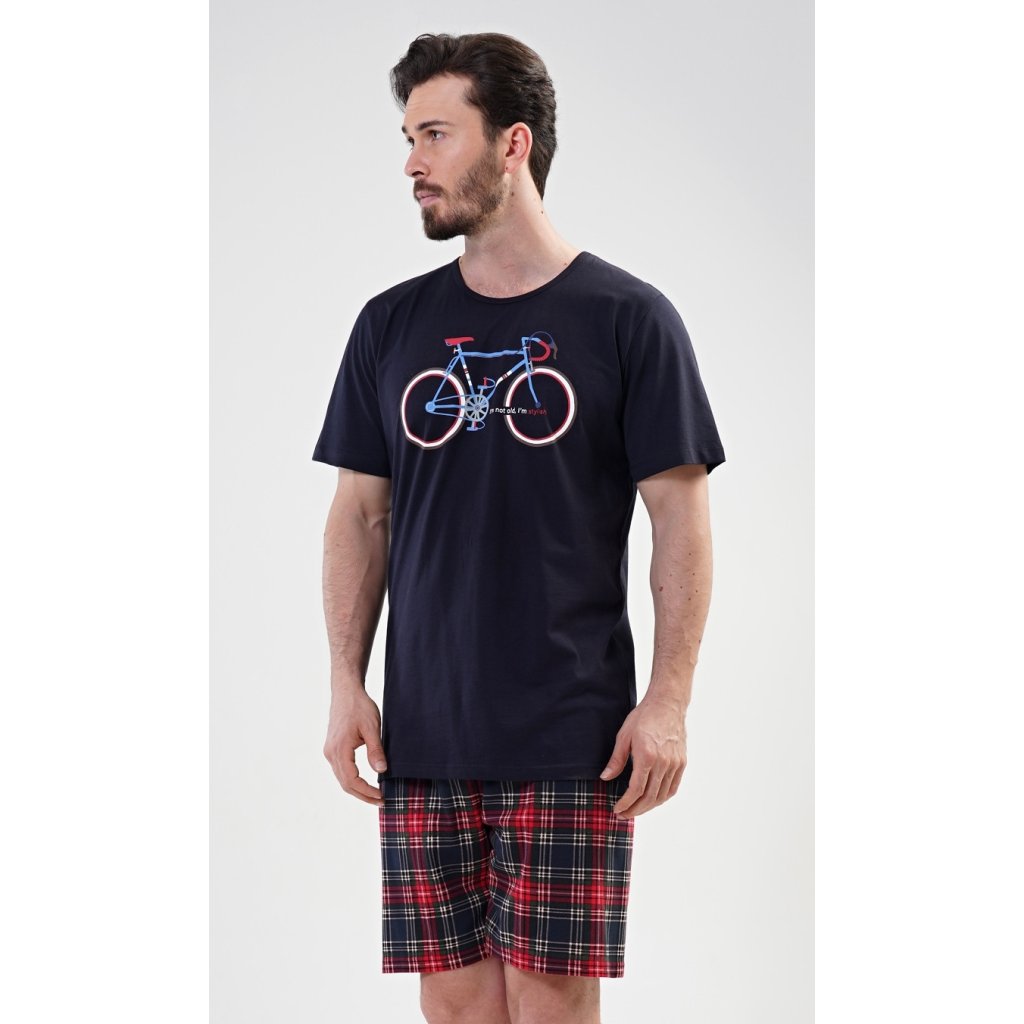Pánské bavlněné pyžamo šortky Old bike. Pánské pyžamo se skládá z trička s krátkým rukávem a krátkých šortkových kalhot. Na tričku je obrázek kola a nápis I´m not old, I´m stylish. Výrazné tričko vhodně doplňují kostkované kalhoty. Šortky jsou bez kapes, mají gumu a šňůrku na stažení. Použitý materiál s podílem bavlny 100% je příjemný a poddajný na dotek. Pyžamo je vhodné i na denní nošení.