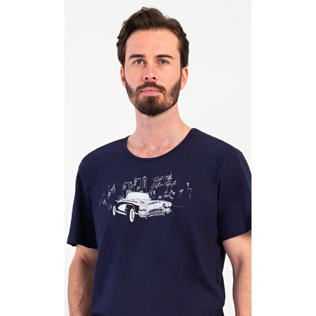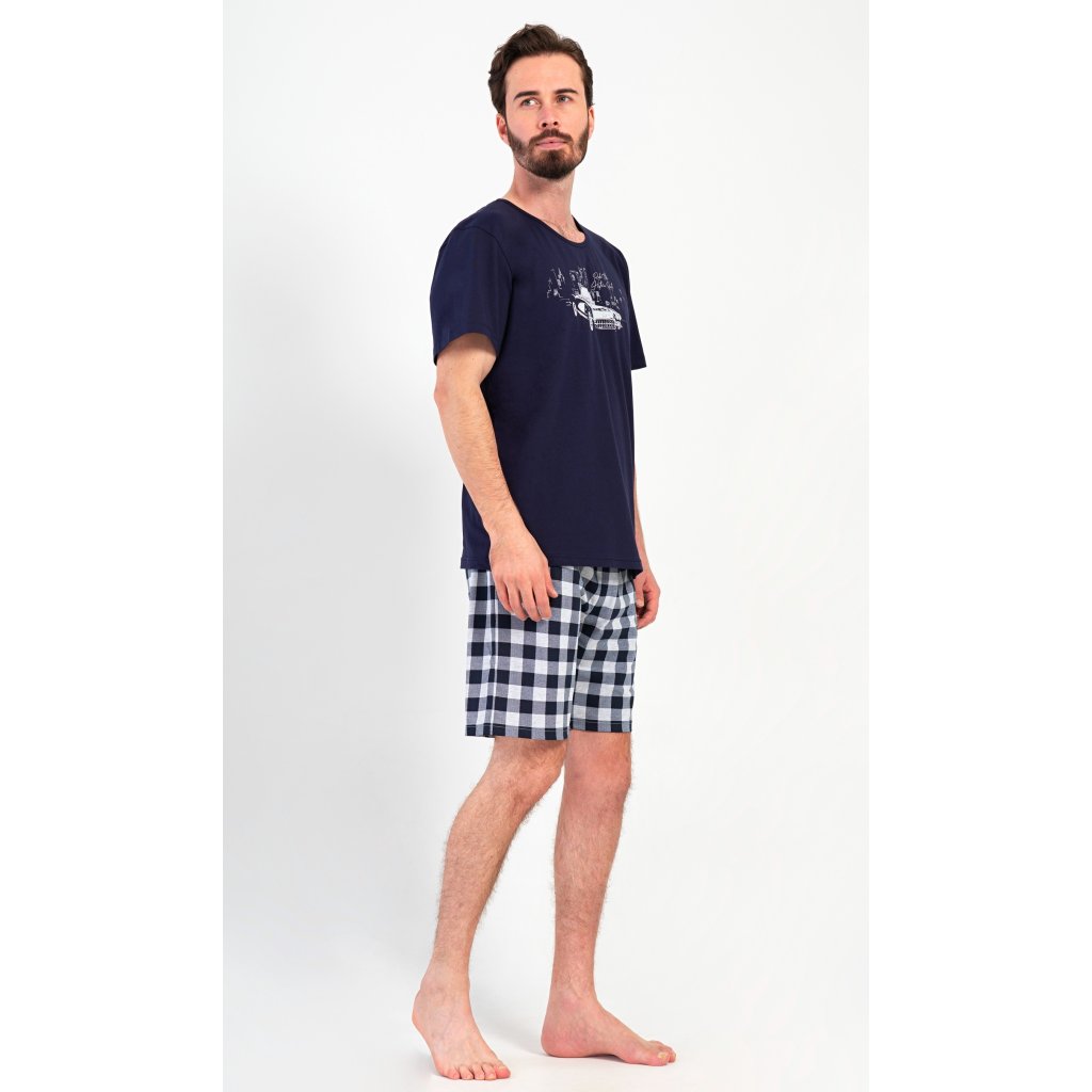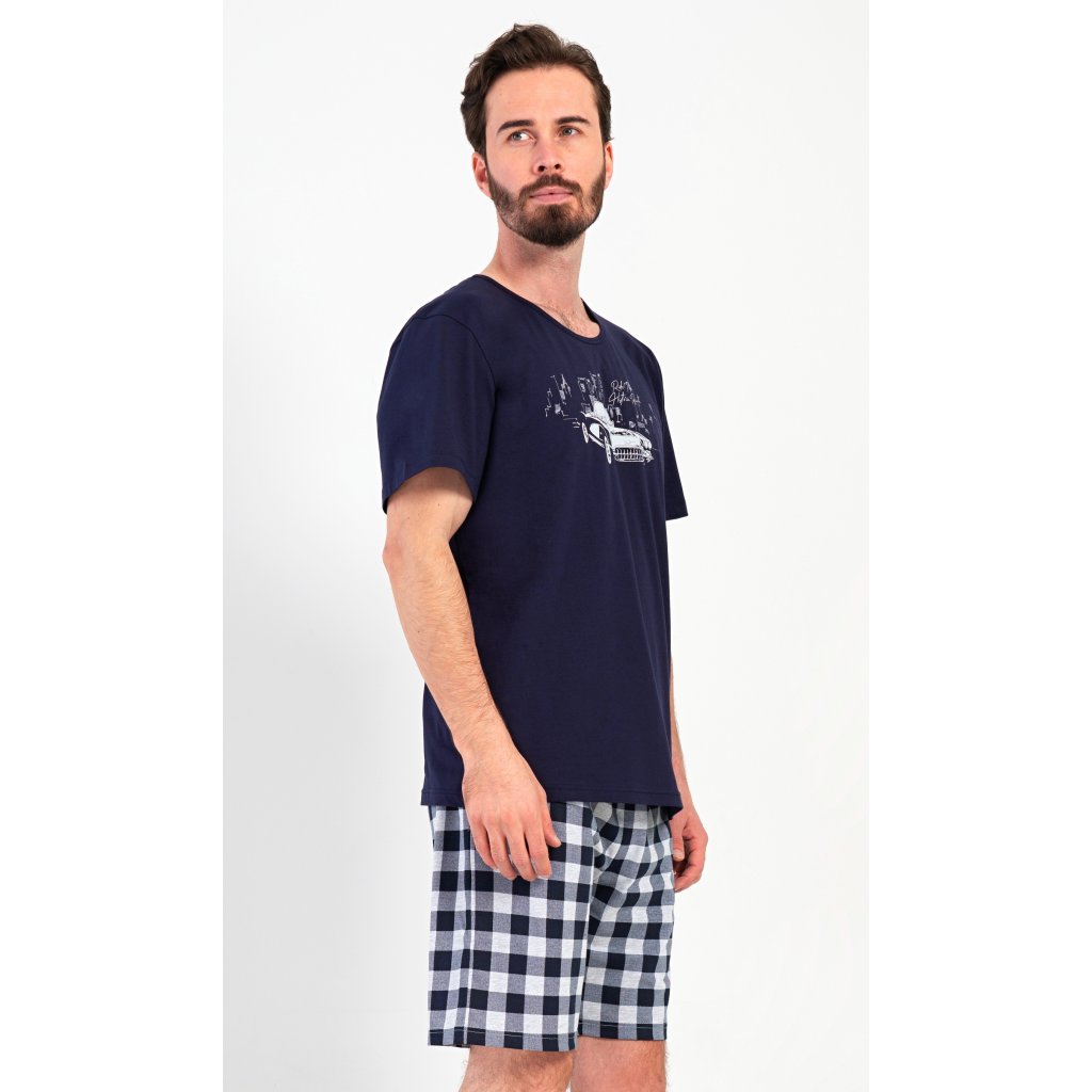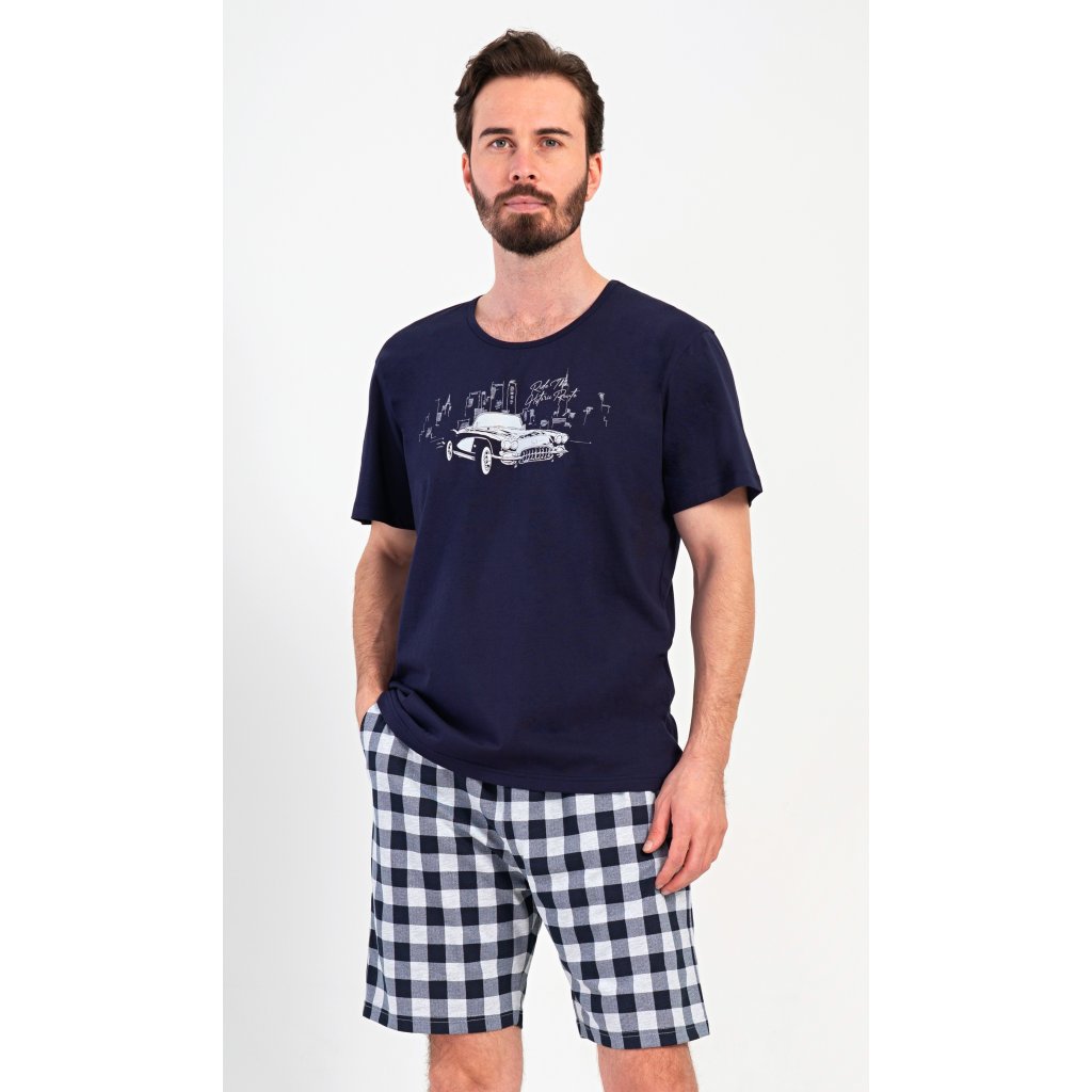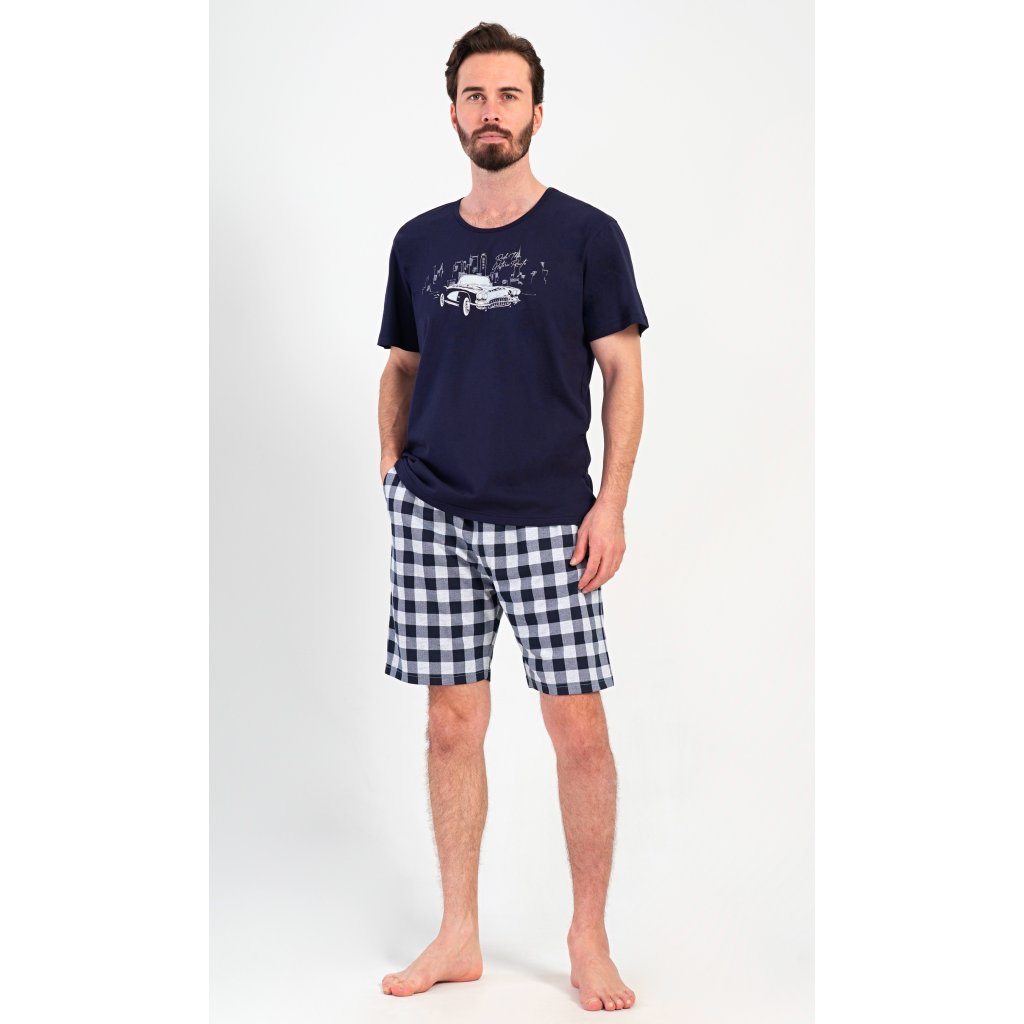 Pánské bavlněné šortkové pyžamo Old car. Pánské pyžamo se skládá z trička s krátkým rukávem a krátkých šortkových kalhot. Tričko s kulatým výstřihem zdobí obrázek historického auta. Tričko doplňují kárované šortky, které mají v pase gumu, šňůrku na stažení a praktické kapsy. Použitý materiál s obsahem bavlny 100% je příjemný a poddajný na dotek.