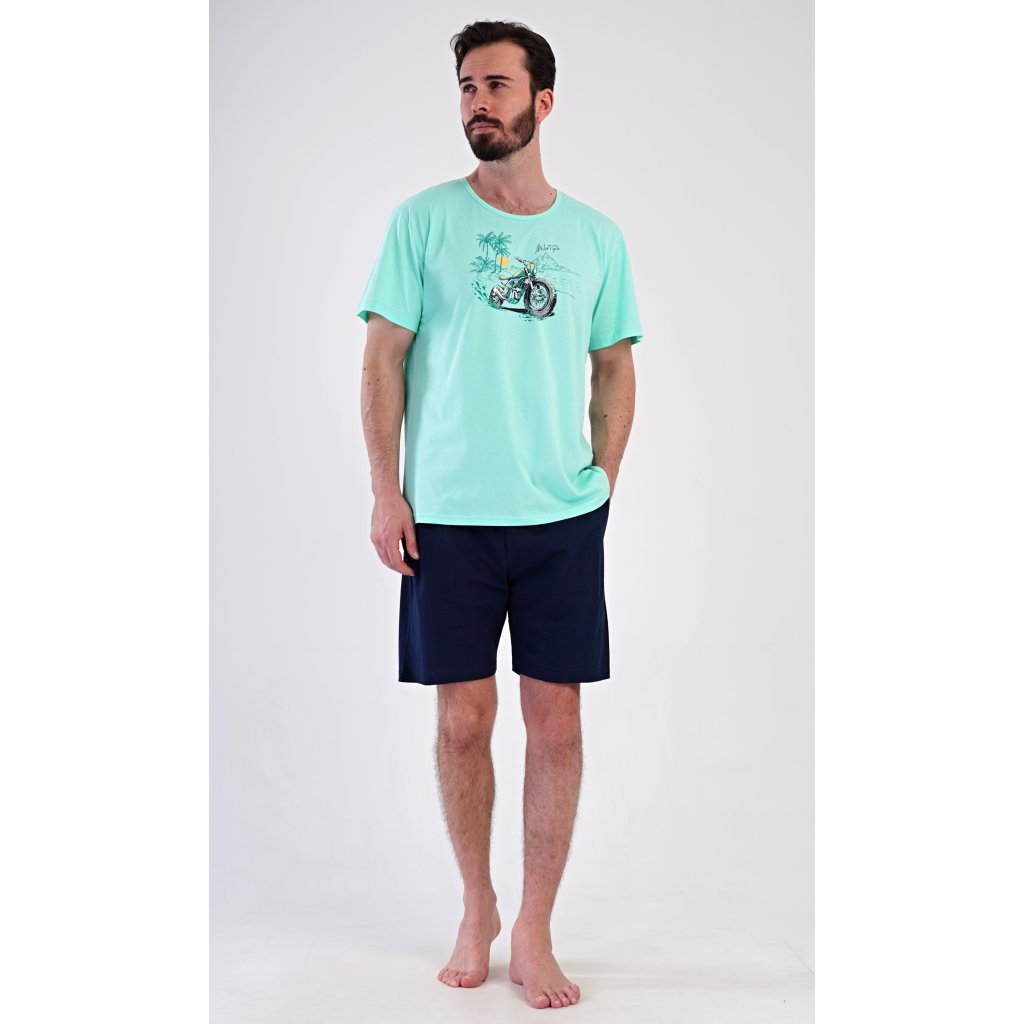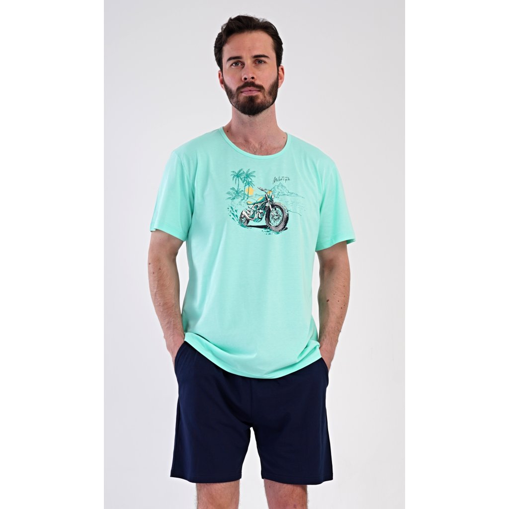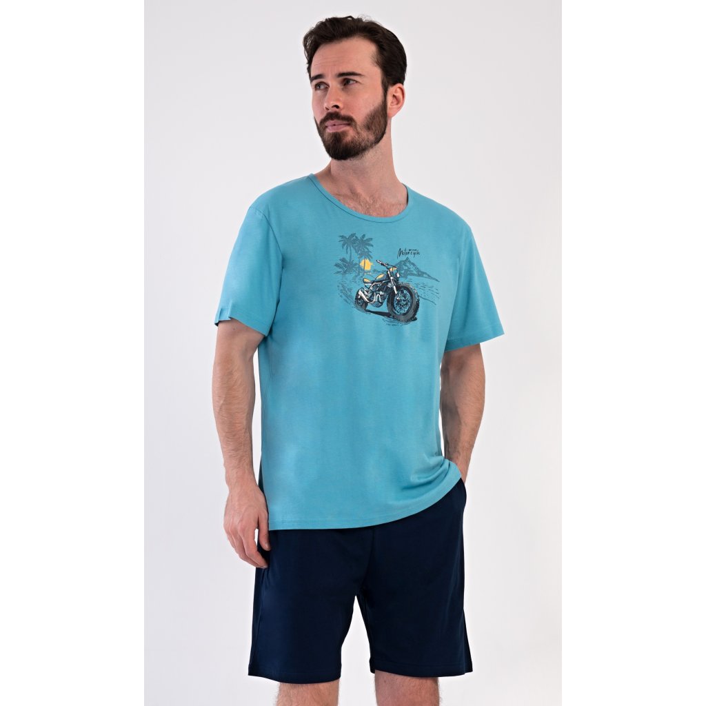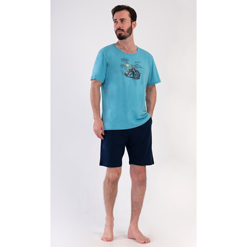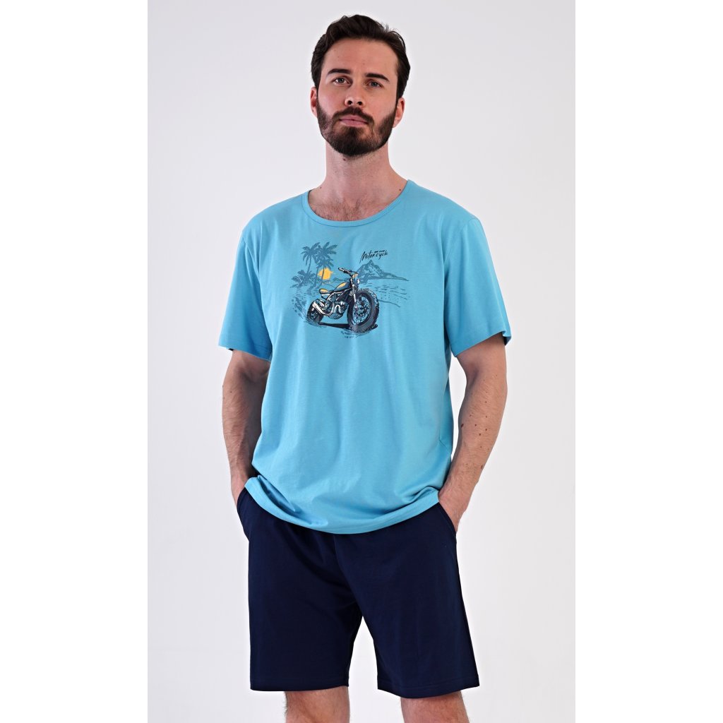 Pánské bavlněné šortkové pyžamo Pavel. Pánské pyžamo se skládá z trička s krátkým rukávem a krátkých šortkových kalhot. Na jednobarevném tričku je obrázek terénní motorky. Šortky mají praktické kapsy, v pase gumu a šňůrku na stáhnutí. Použitý materiál s podílem bavlny 100% je příjemný a poddaný na dotek. Pyžamo je vhodné i na denní nošení a oceníte ho obzvlášť v horkých letních dnech.