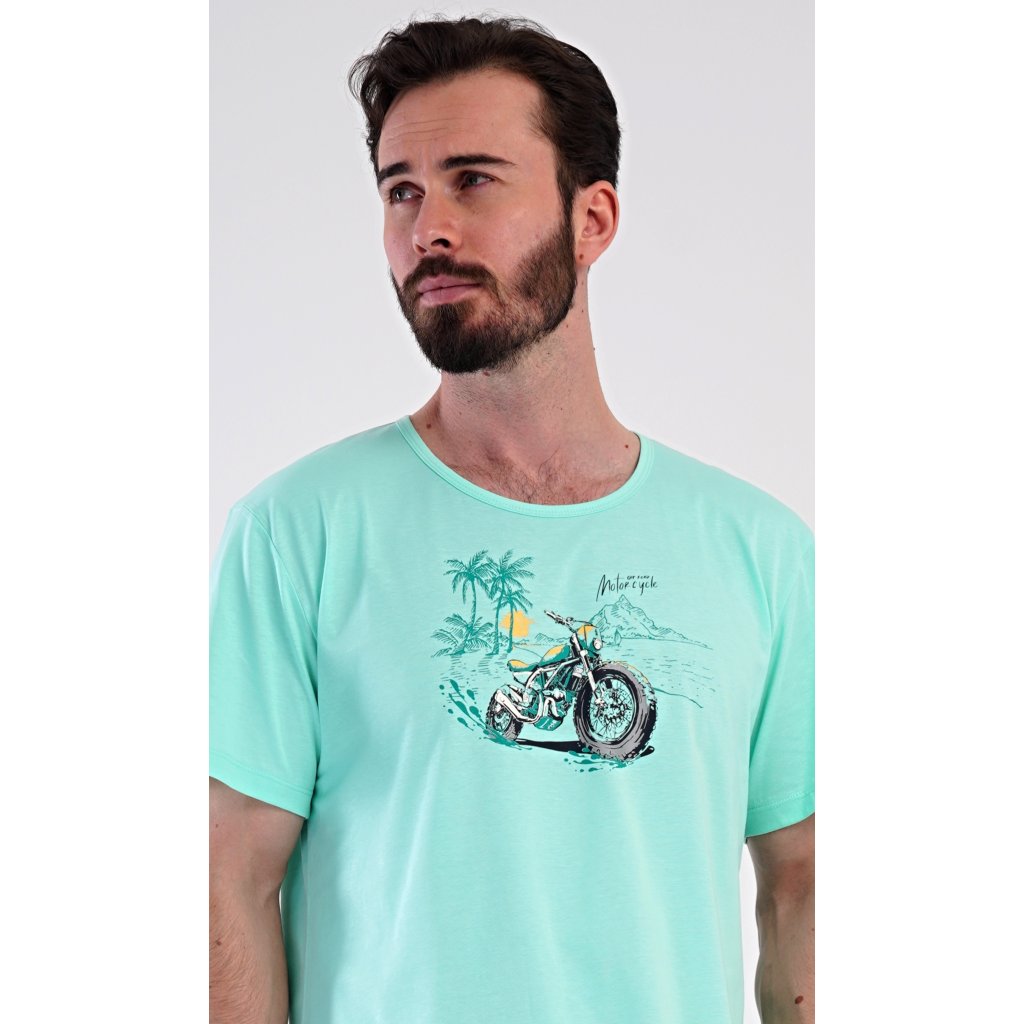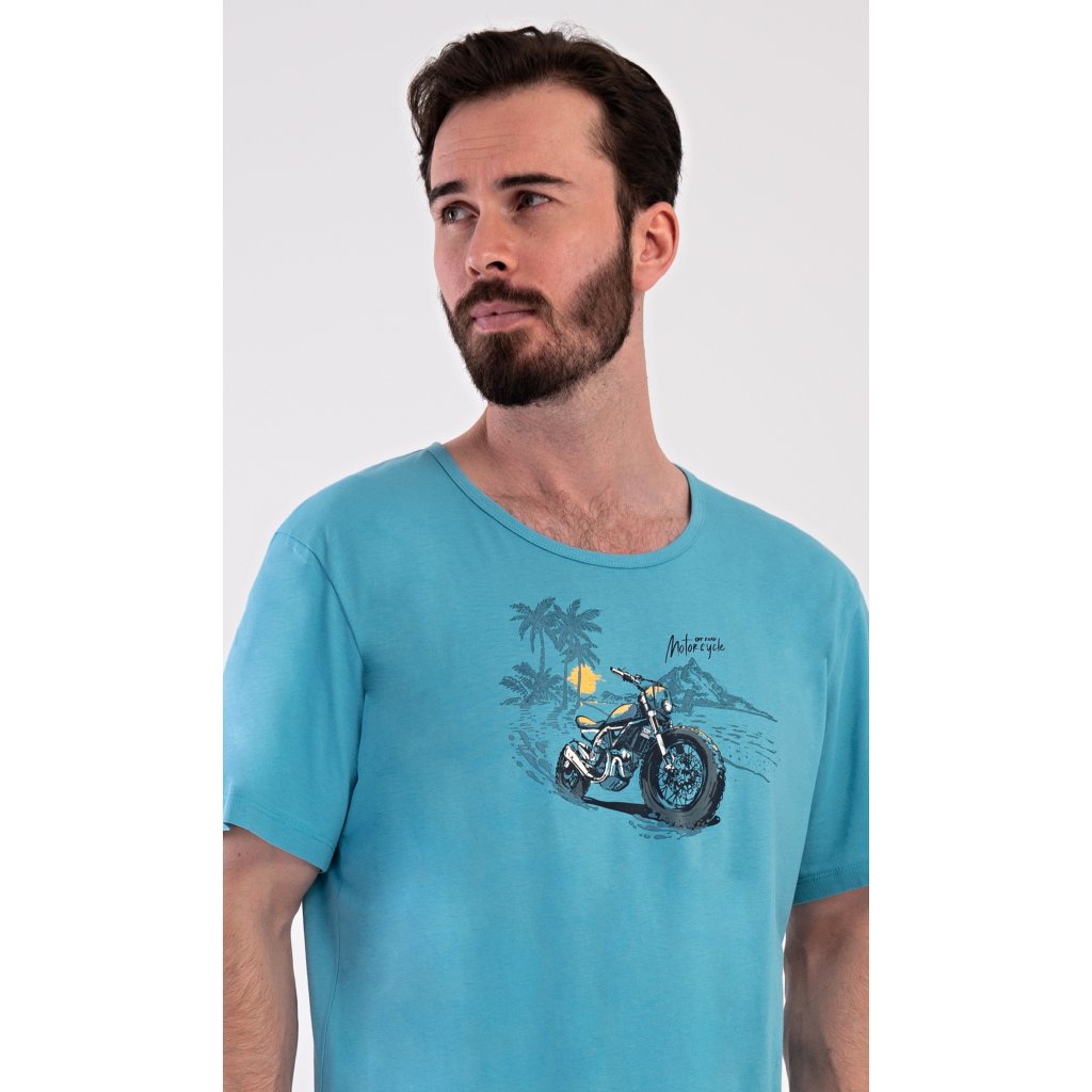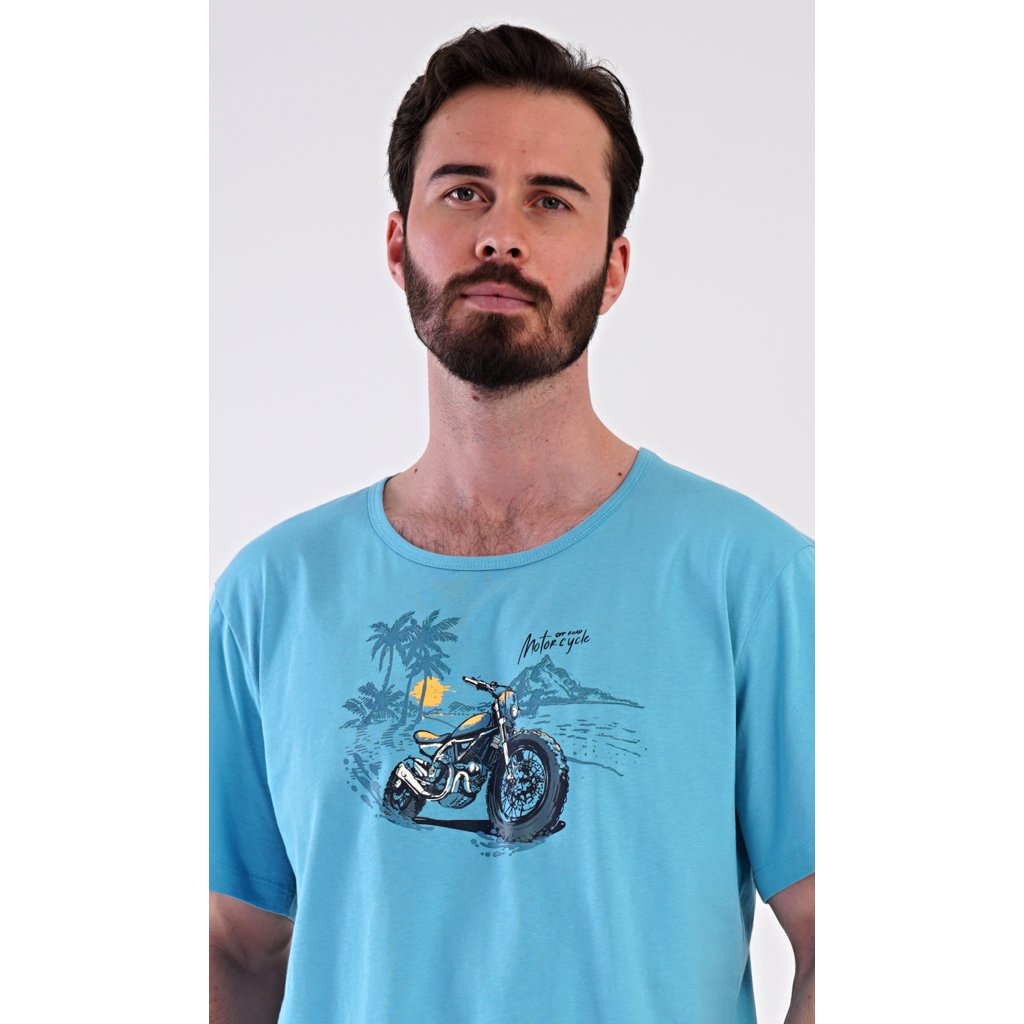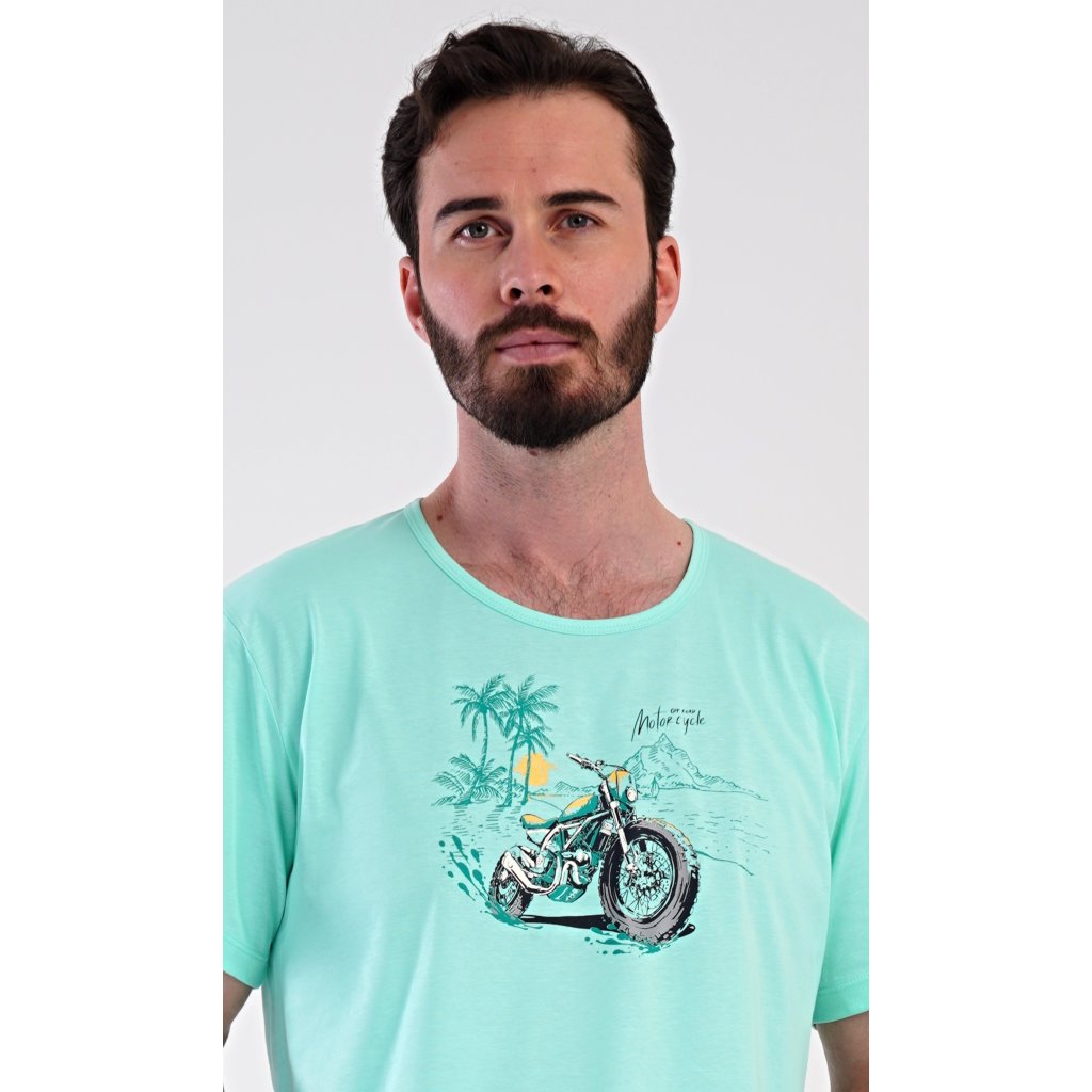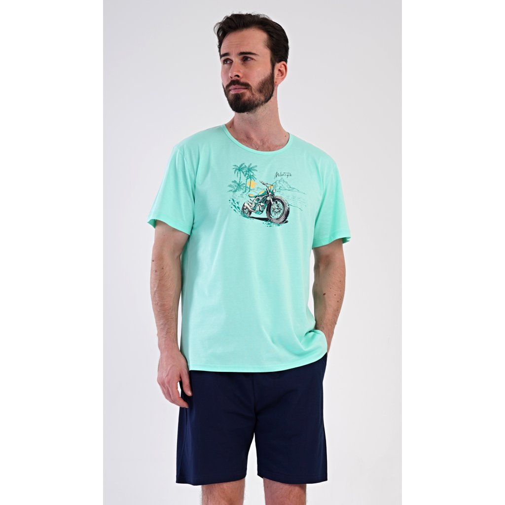 Pánské bavlněné šortkové pyžamo Pavel. Pánské pyžamo se skládá z trička s krátkým rukávem a krátkých šortkových kalhot. Na jednobarevném tričku je obrázek terénní motorky. Šortky mají praktické kapsy, v pase gumu a šňůrku na stáhnutí. Použitý materiál s podílem bavlny 100% je příjemný a poddaný na dotek. Pyžamo je vhodné i na denní nošení a oceníte ho obzvlášť v horkých letních dnech.