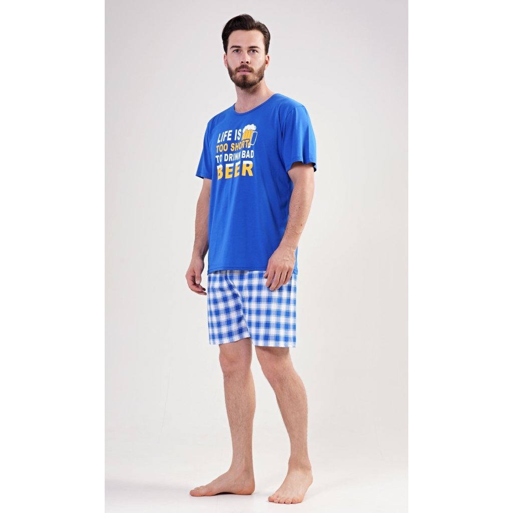 Pánské bavlněné pyžamo šotky Petr. Pánské pyžamo se skládá z trička s krátkým rukávem a krátkých šortkových kalhot. Na tričku je nápis Life is too short to drink bad beer. Výrazné tričko vhodně doplňují kostkované kalhoty. Šortky jsou bez kapes, mají gumu a šňůrku na stažení. Použitý materiál s podílem bavlny 100% je příjemný a poddajný na dotek. Pyžamo je vhodné i na denní nošení.