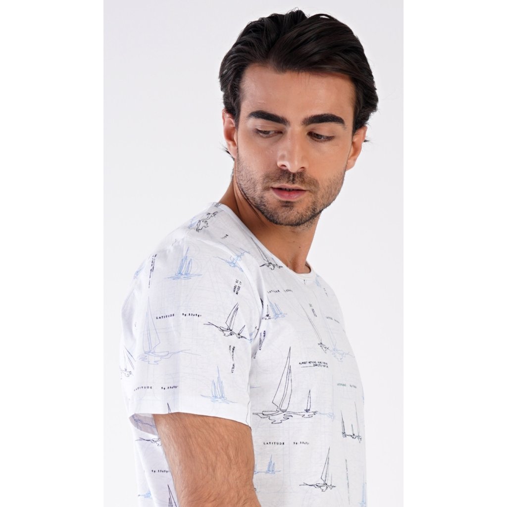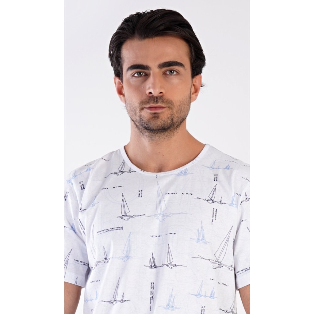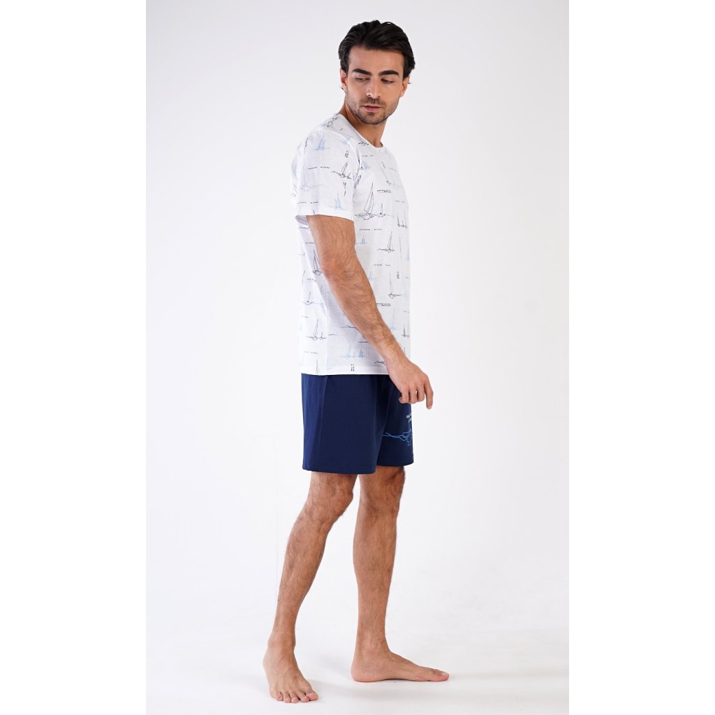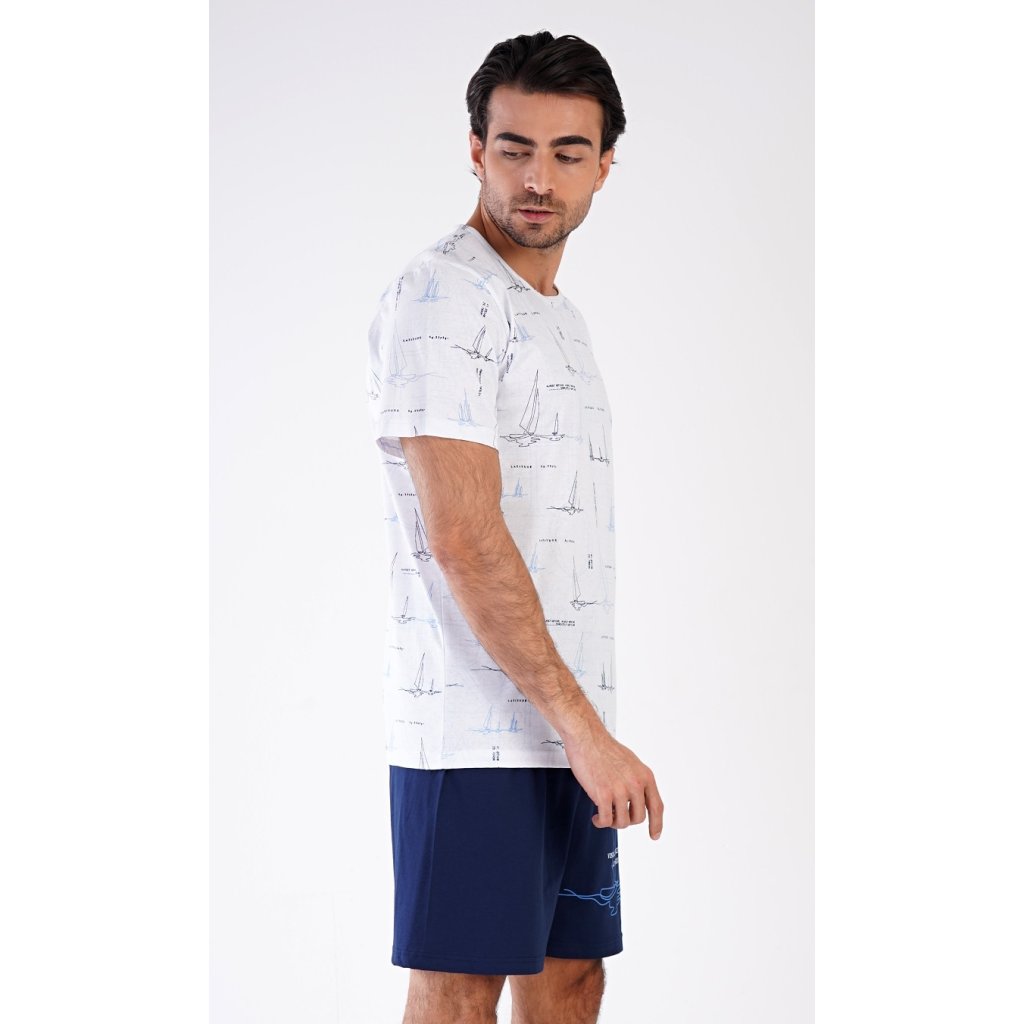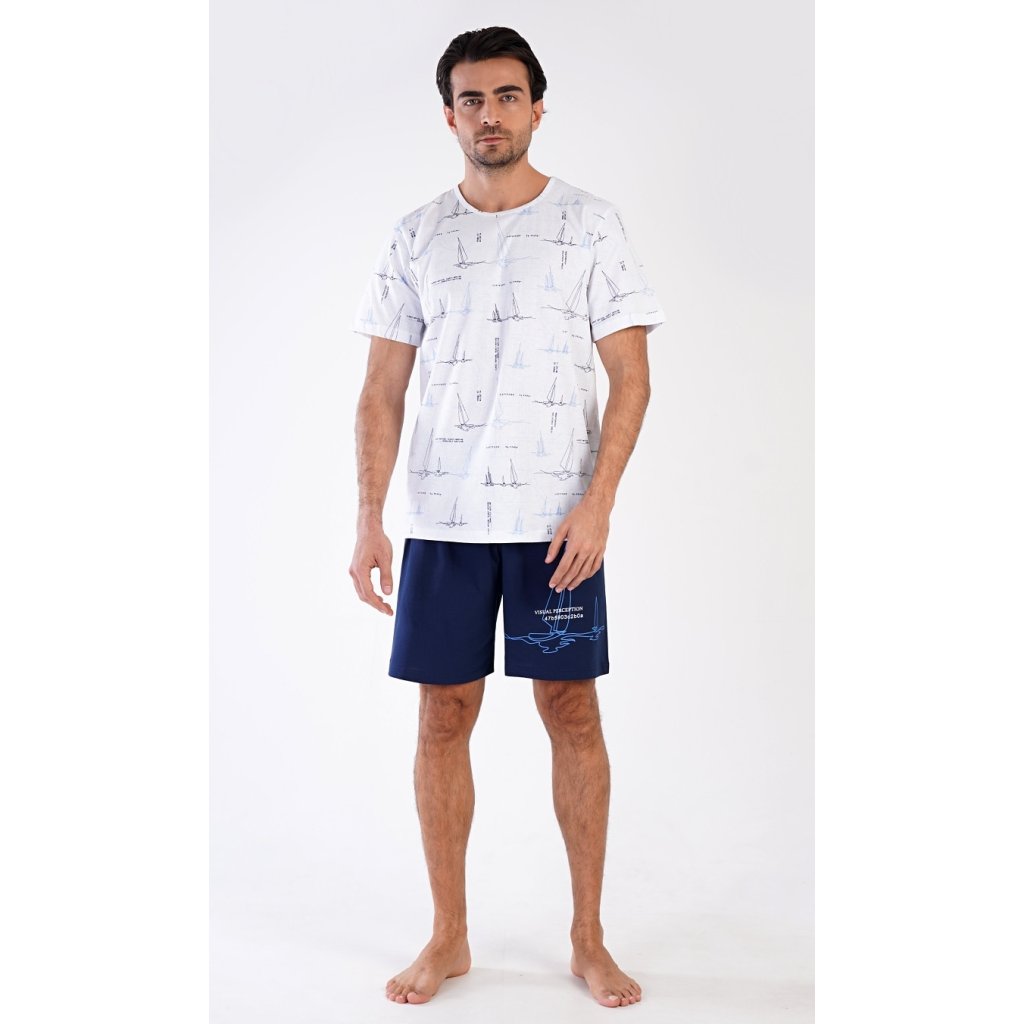 Pánské bavlněné pyžamo šortky Plachetnice. Pánské pyžamo se skládá z trička s krátkým rukávem a krátkých šortkových kalhot. Jednobarevné tričko je potištěno konturami plachetnic. Tričko vhodně doplňují jednobarevné krátké kalhoty, na kterých se opakuje potisk s námořnickým motivem. Šortky mají v pase gumu, šňůrku na stažení, nemají kapsy. Použitý materál s obsahem bavlny 100% je příjemný a poddajný na dotek.