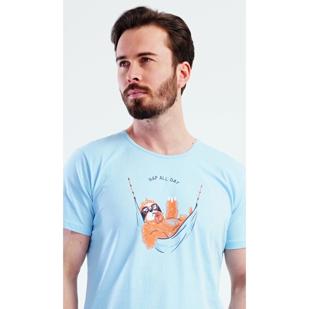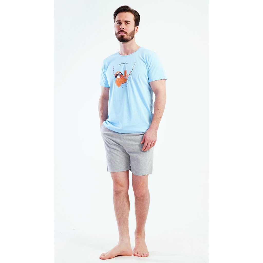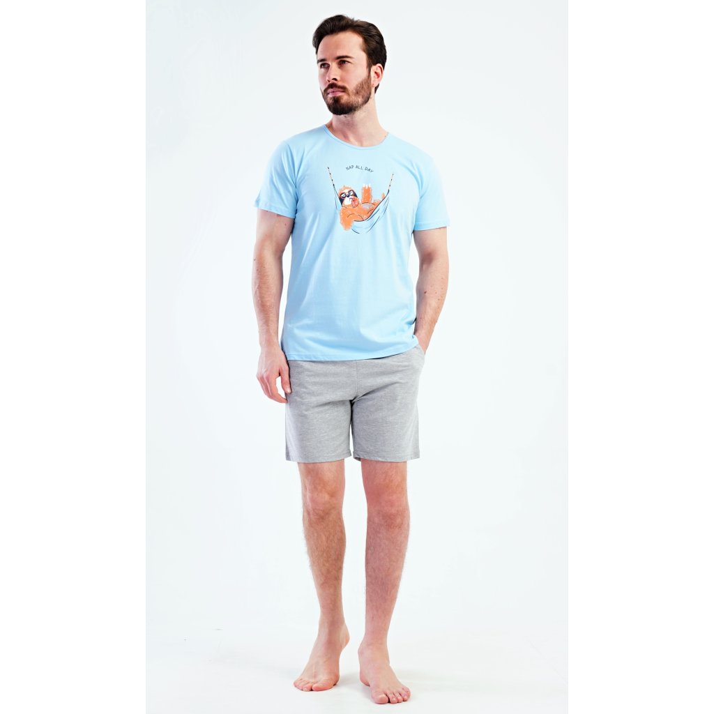 Pánské šortkové pyžamo Pohodář. Pánské pyžamo se skládá z trička s krátkým rukávem a krátkých šortkových kalhot. Na tričku je obrázek lenochoda v houpací síti. Šortky mají kapsy, v pase gumu a šňůrku na stáhnutí. Použitý materiál je příjemný a poddaný na dotek. Obsah bavlny u trička je 100% a u šortek 70%. Pyžamo je vhodné i na denní nošení a oceníte ho obzvlášť v horkých letních dnech.