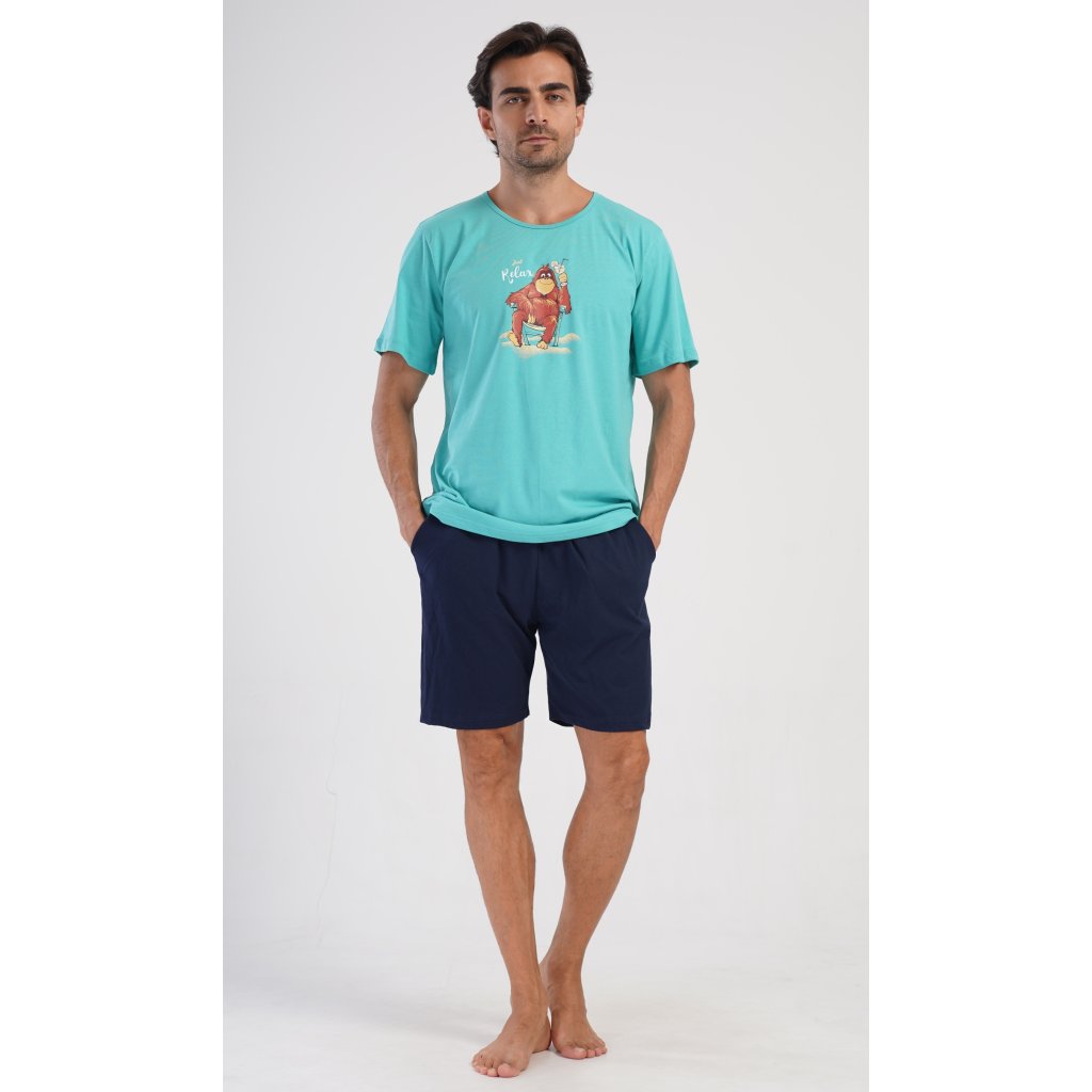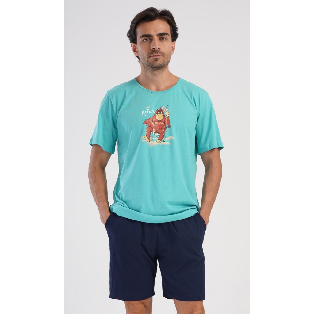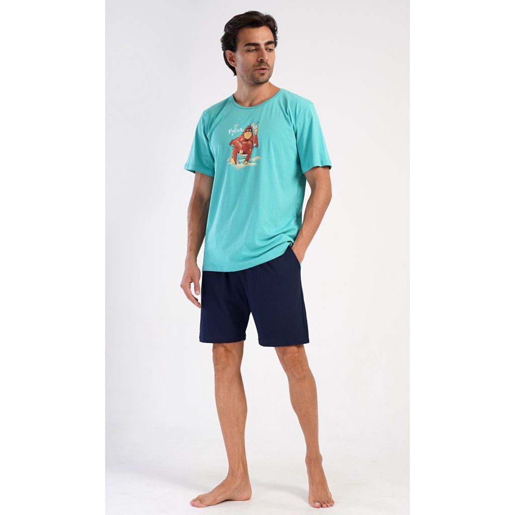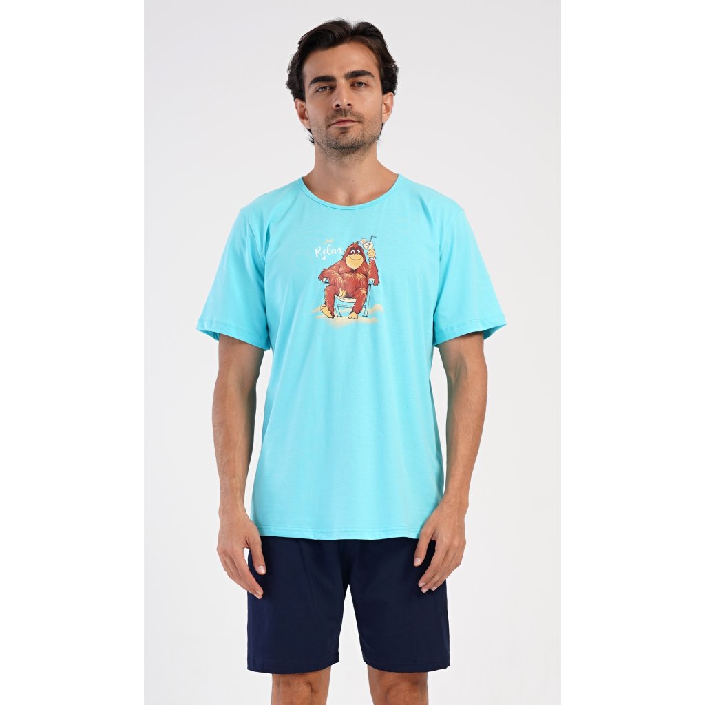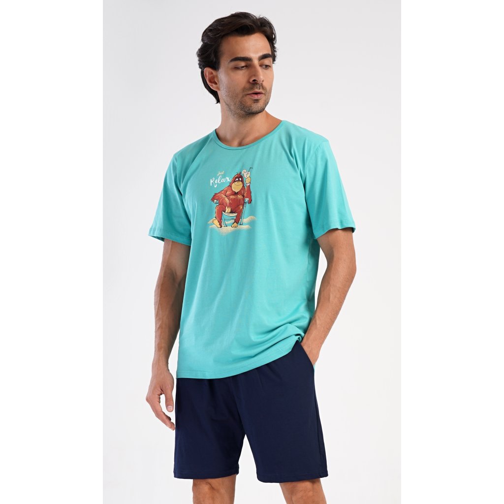 Pánské bavlněné šortkové pyžamo Relax. Pánské pyžamo se skládá z trička s krátkým rukávem a krátkých šortkových kalhot. Na jednobarevném tričku je obrázek opičáka, který relaxuje na pláži s drinkem. Šortky mají praktické kapsy, v pase gumu a šňůrku na stáhnutí. Použitý materiál s podílem bavlny 100% je příjemný a poddaný na dotek. Pyžamo je vhodné i na denní nošení a oceníte ho obzvlášť v horkých letních dnech.