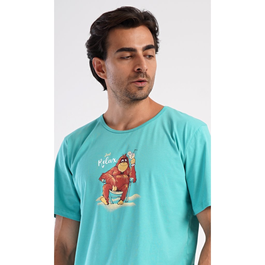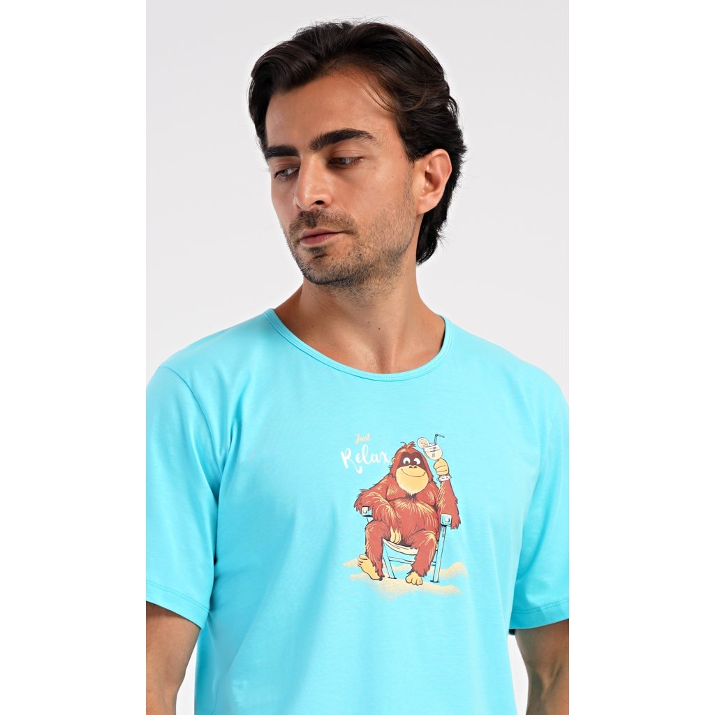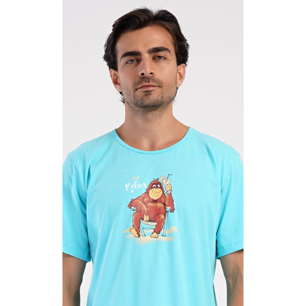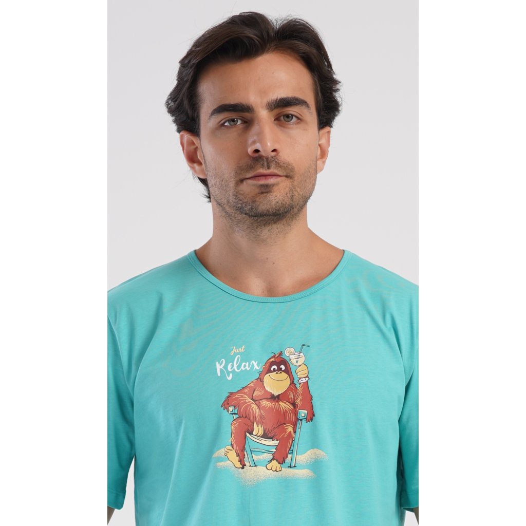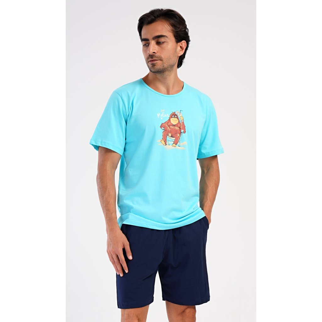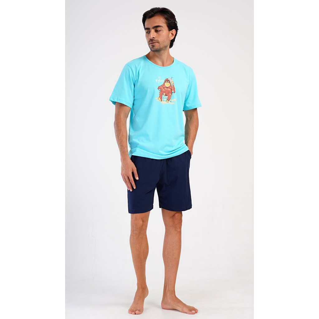 Pánské bavlněné šortkové pyžamo Relax. Pánské pyžamo se skládá z trička s krátkým rukávem a krátkých šortkových kalhot. Na jednobarevném tričku je obrázek opičáka, který relaxuje na pláži s drinkem. Šortky mají praktické kapsy, v pase gumu a šňůrku na stáhnutí. Použitý materiál s podílem bavlny 100% je příjemný a poddaný na dotek. Pyžamo je vhodné i na denní nošení a oceníte ho obzvlášť v horkých letních dnech.