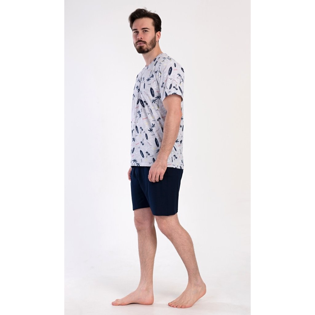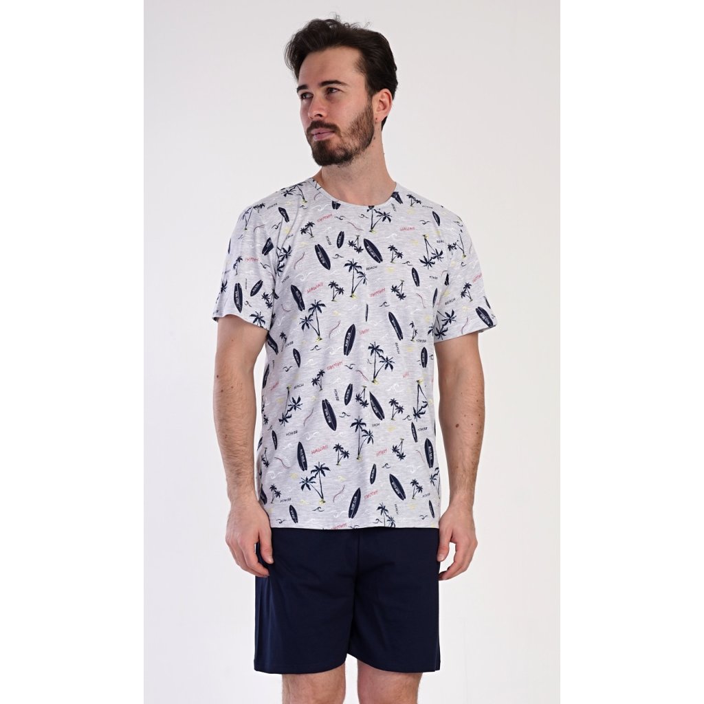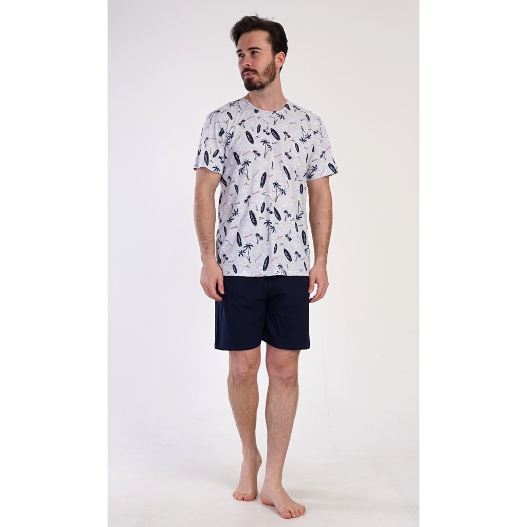 Pánské pyžamo šortky Surfing. Pánské pyžamo se skládá z trička s kulatým výstřihem a krátkých šortkových kalhot. Tričko s krátkým rukávem je potištěné surfařskými motivy a nápisy. Doplňují jej jednobarevé kalhoty, které mají v pase gumu a šňůrku na stažení, nemají kapsy. Použitý materiál je příjemný a poddajný na dotek. Obsah bavlny u kalhot je 100% a u trička 70%. Pyžamo je vhodné i na denní nošení.
