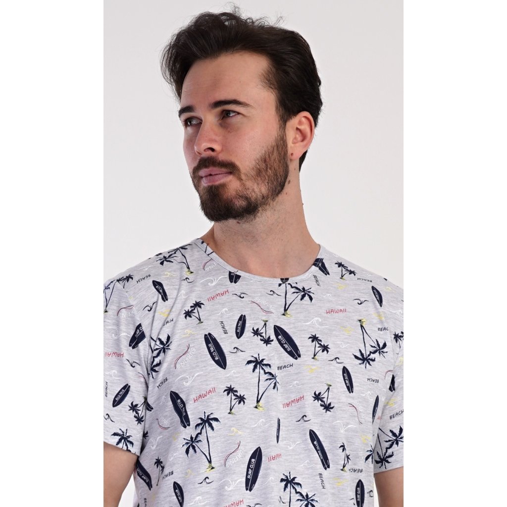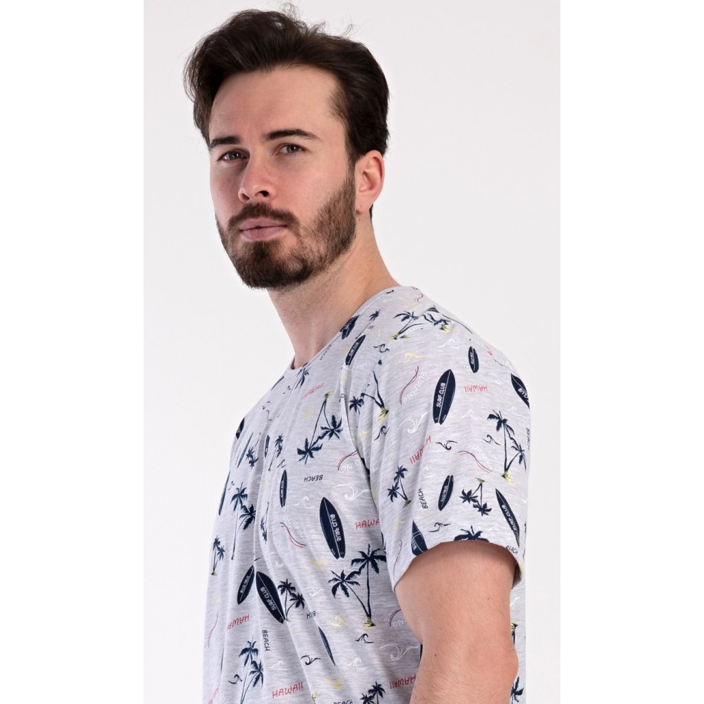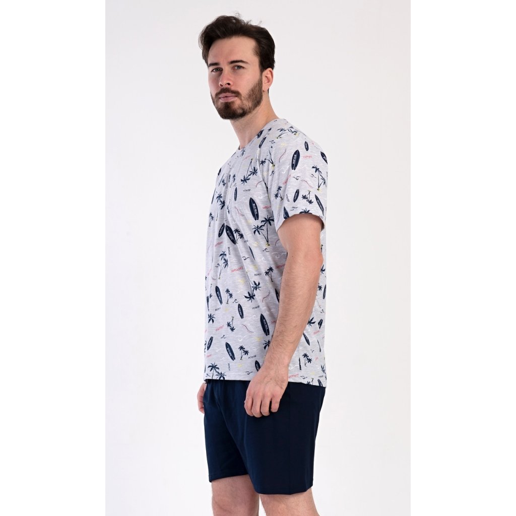 Pánské pyžamo šortky Surfing. Pánské pyžamo se skládá z trička s kulatým výstřihem a krátkých šortkových kalhot. Tričko s krátkým rukávem je potištěné surfařskými motivy a nápisy. Doplňují jej jednobarevé kalhoty, které mají v pase gumu a šňůrku na stažení, nemají kapsy. Použitý materiál je příjemný a poddajný na dotek. Obsah bavlny u kalhot je 100% a u trička 70%. Pyžamo je vhodné i na denní nošení.
