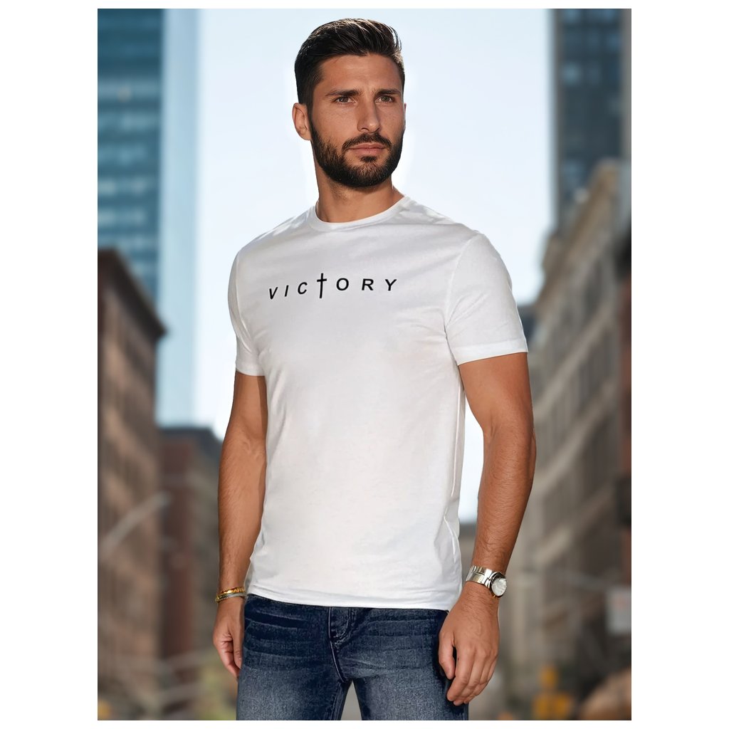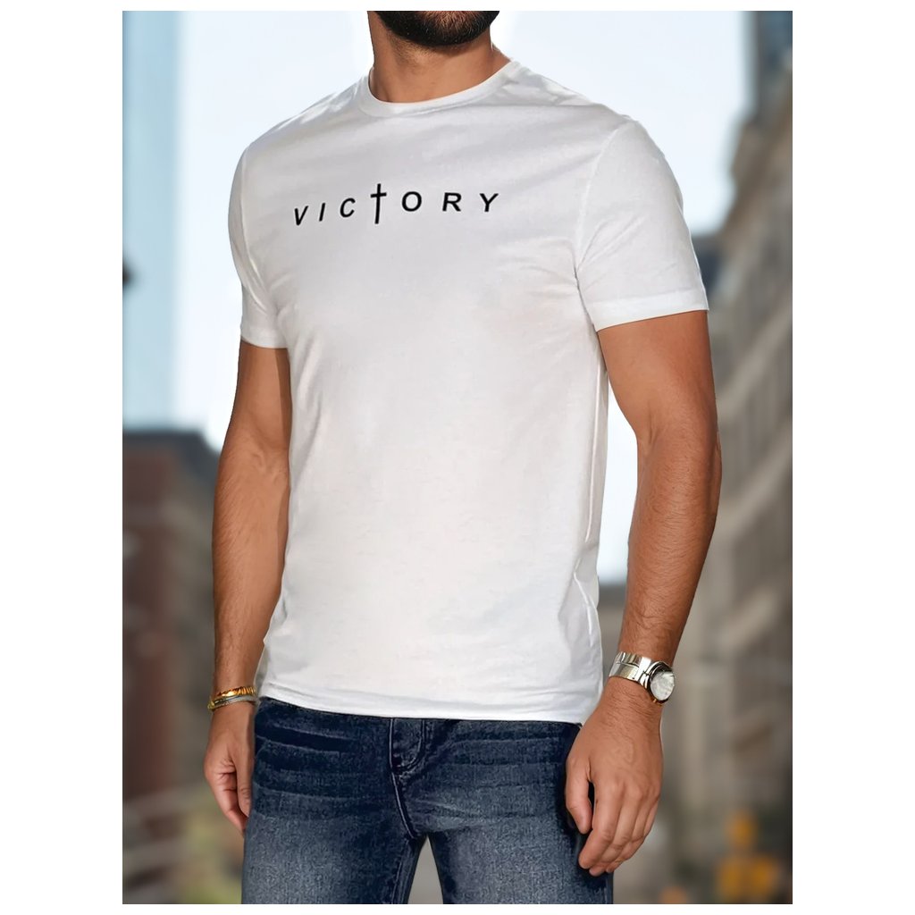 Toto pánské tričko s krátkým rukávem a klasickým kulatým výstřihem je ideální pro fanoušky minimalistického, ale zároveň výrazného stylu. Potisk „VICTORY“ na přední straně nahrazuje „T“ symbolem kříže, což mu dodává jedinečný nádech. Toto tričko je ideální pro každodenní nošení a ležérní outfity s džínami nebo kraťasy.