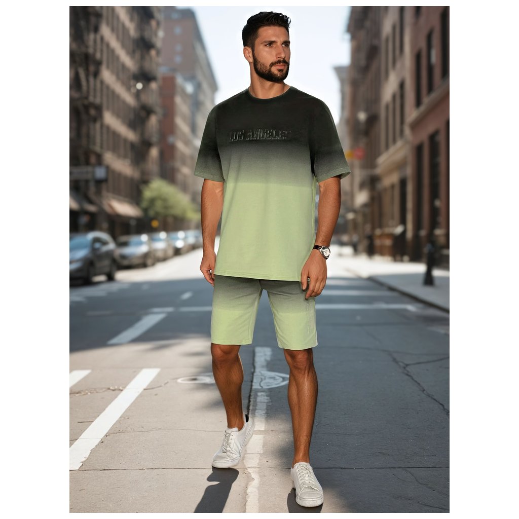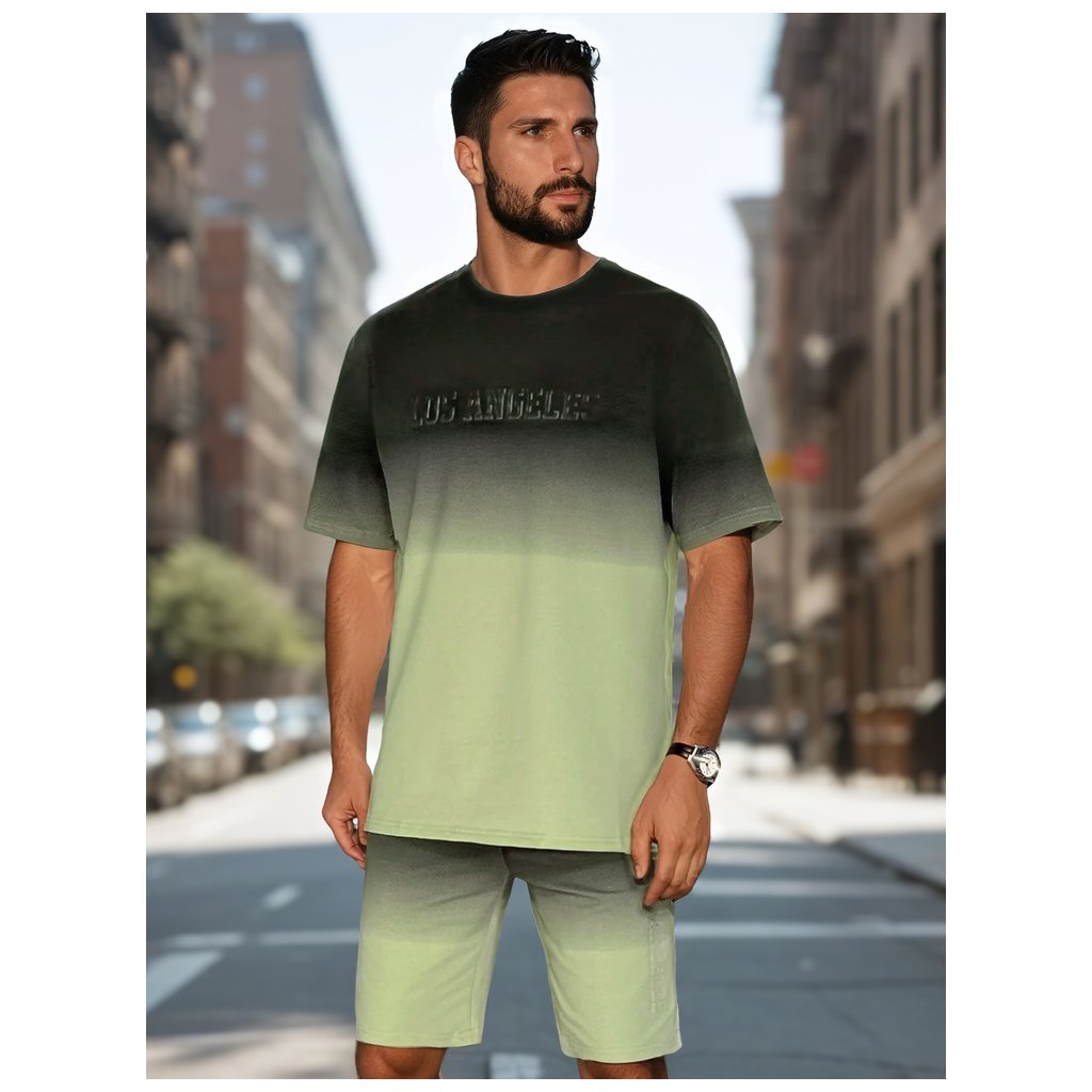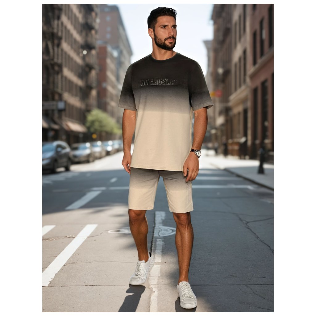 Tato dvoudílná pánská souprava je ideální pro každodenní nošení. Obsahuje tričko s krátkým rukávem a kulatým výstřihem a rovně střižené kraťasy. Oba kusy mají ombré efekt, který přechází z tmavších do světlejších tónů. Tričko je zdobí reliéfní nápis „LOS ANGELES“ a kraťasy mají elastický pas se stahovací šňůrkou a dvě přední kapsy.