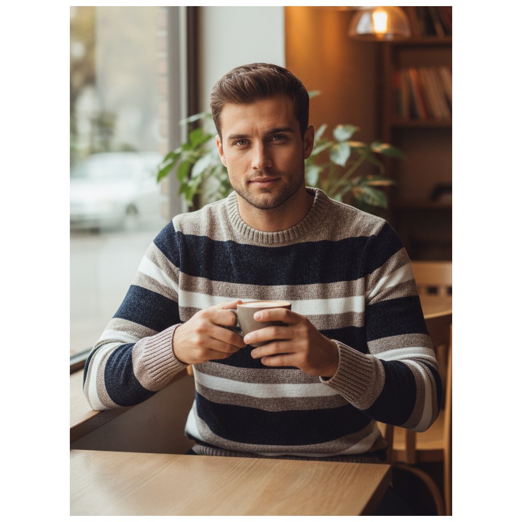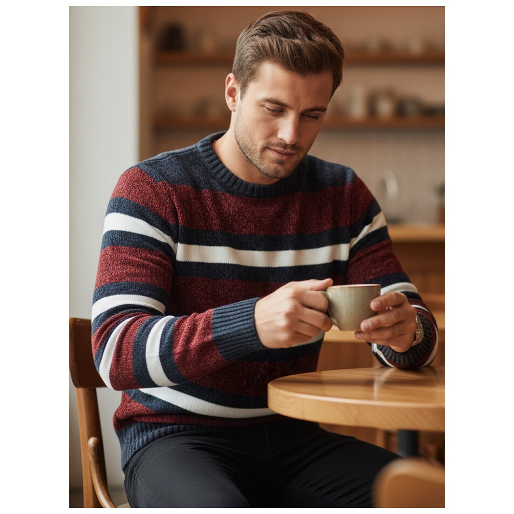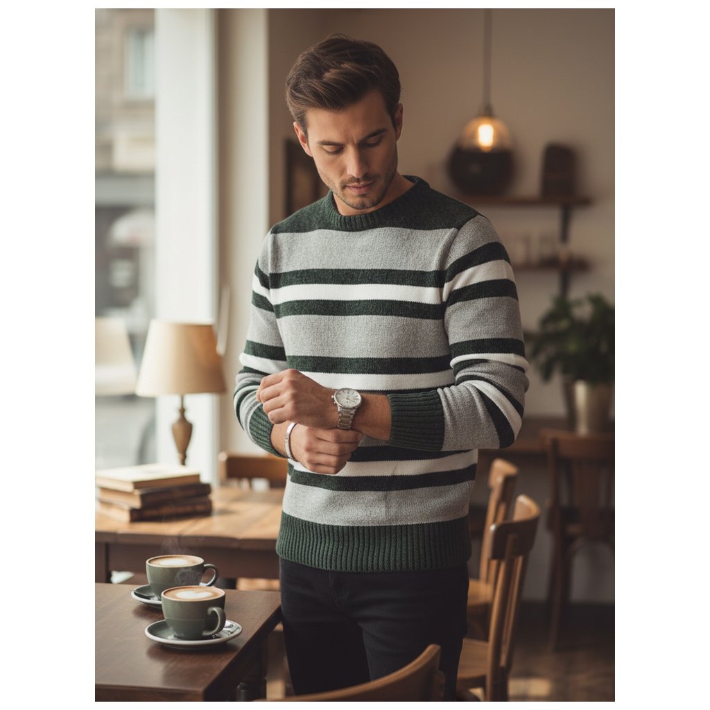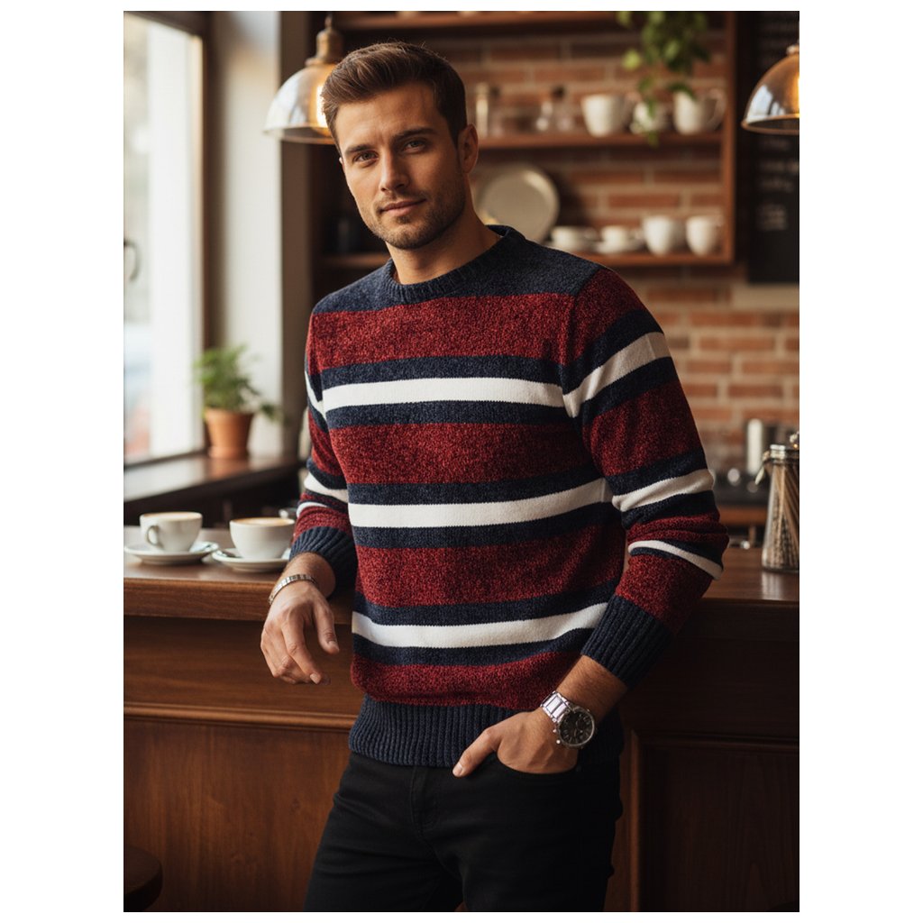 Tento pánský svetr s klasickými pruhy je nezbytností pro chladnější dny. Je vyrobený z příjemné látky a poskytuje pohodlí a teplo po celý den. Stylová barevná kombinace z něj dělá perfektní doplněk k různým outfitům – od ležérních až po elegantnější. Je mimořádně měkký na dotek, je ideální pro každodenní nošení, do práce nebo na setkání s přáteli. Hodí se k džínům i chino kalhotám a dodá vašemu outfitu jedinečný nádech.